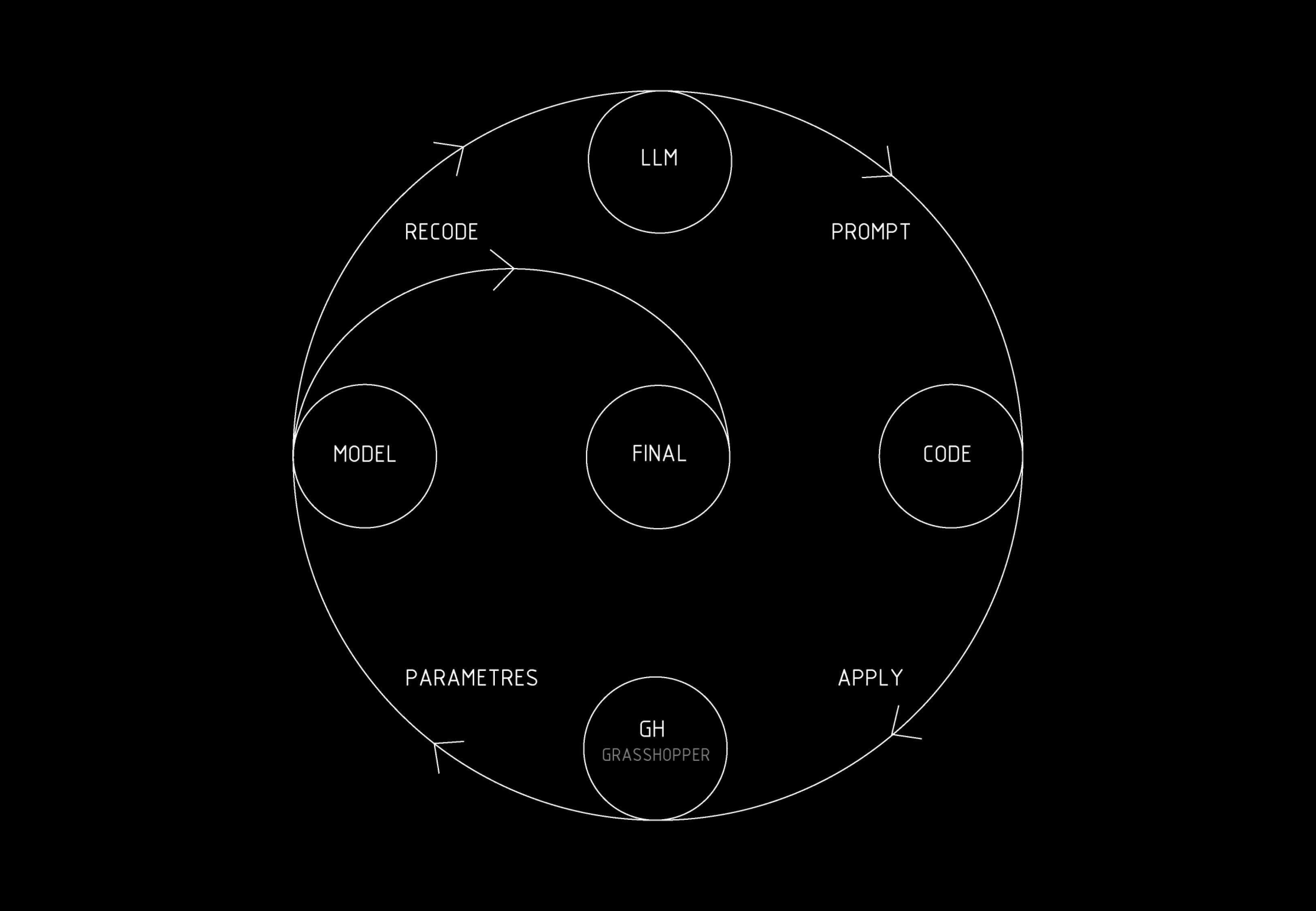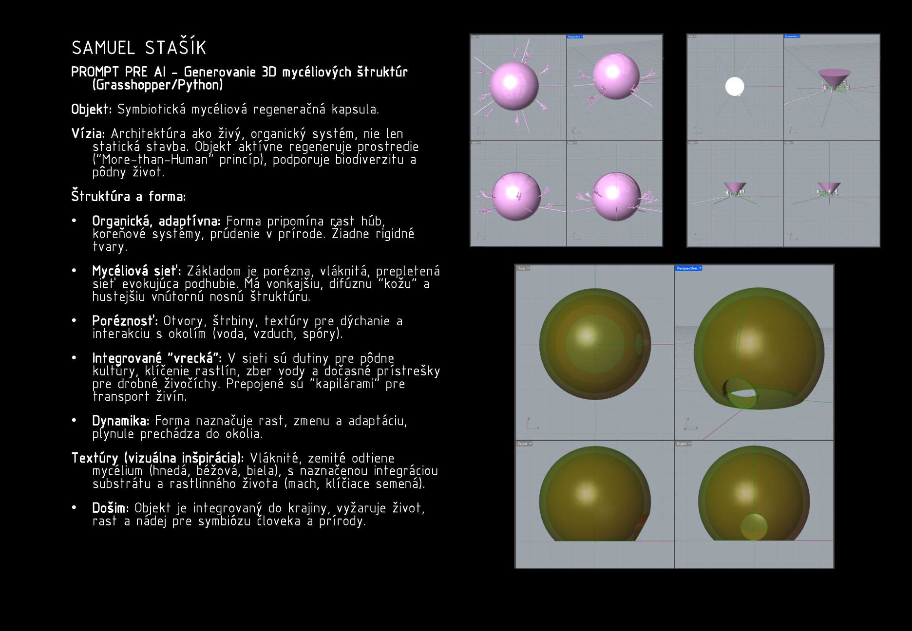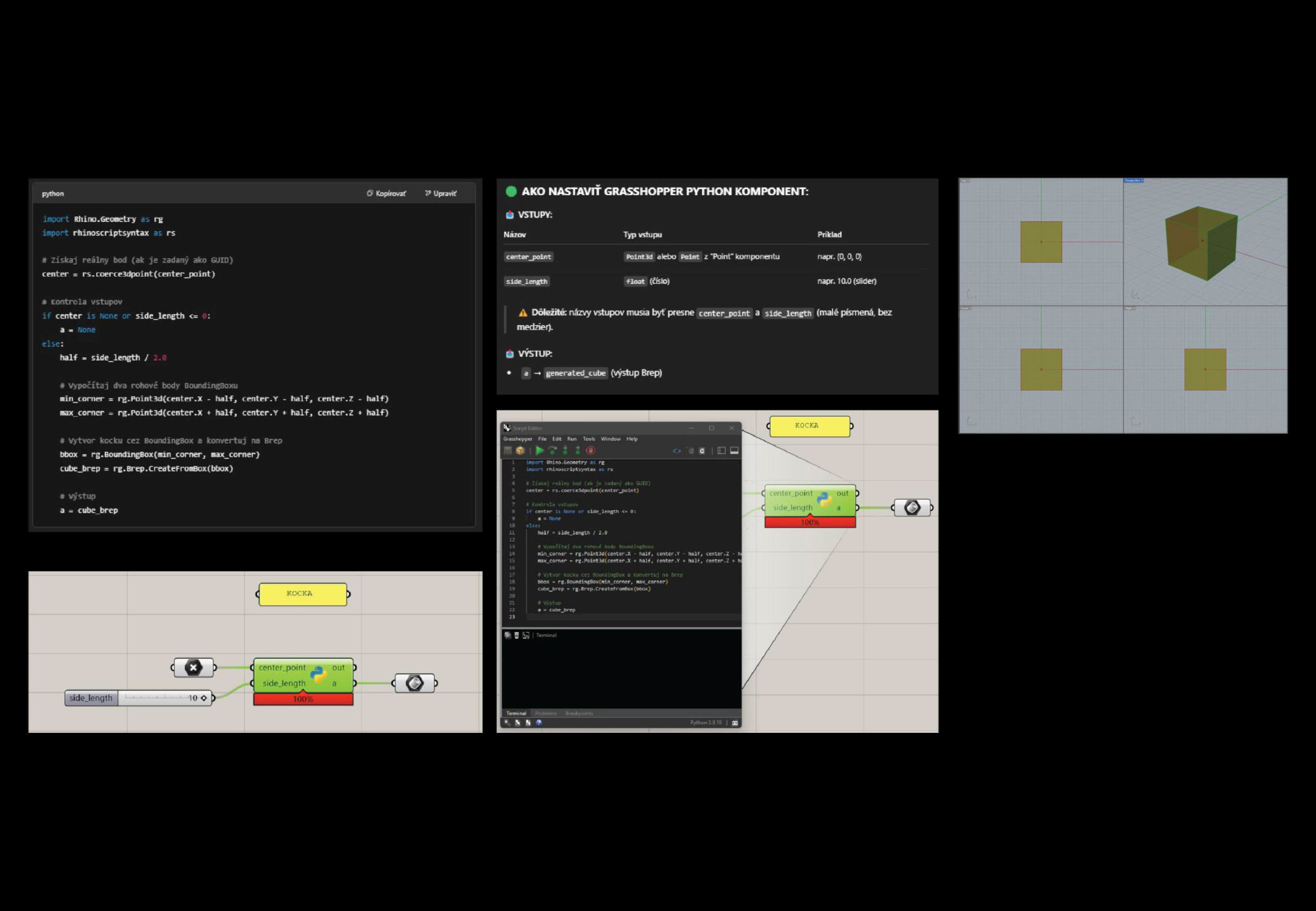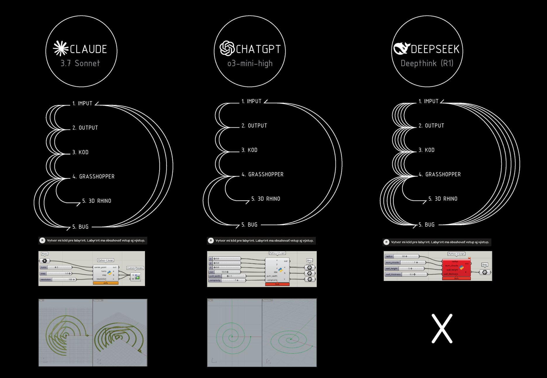 Na základe navrhnutého workflow autorka využíva konverzačného agenta na generovanie Python skriptov pre Rhino a Grasshopper a preklad textového zadania do parametrickej 3D geometrie. Práca mapuje možnosti a limity LLM pri tvorbe a ladení kódu, sleduje vplyv voľby parametrov na výsledný tvar, navrhuje postupy debugovania a porovnáva modely podľa spoľahlivosti a kvality výstupu. Teoretická časť otvára otázky autorstva, zodpovednosti a etiky dát. Cieľom je prakticky ukázať, ako môže AI fungovať ako spolutvorca a zároveň kontrolovateľný nástroj v architektonickej praxi.