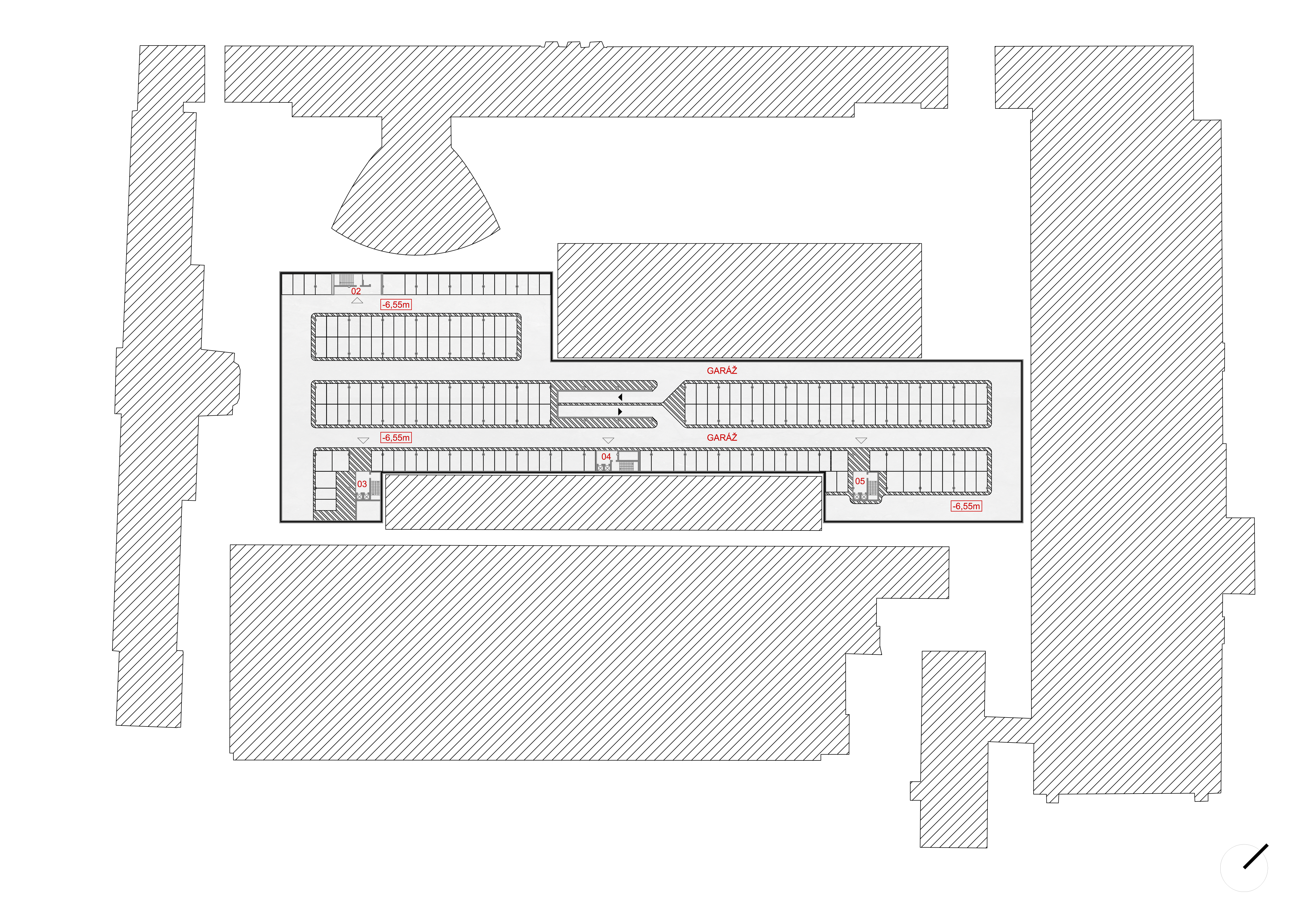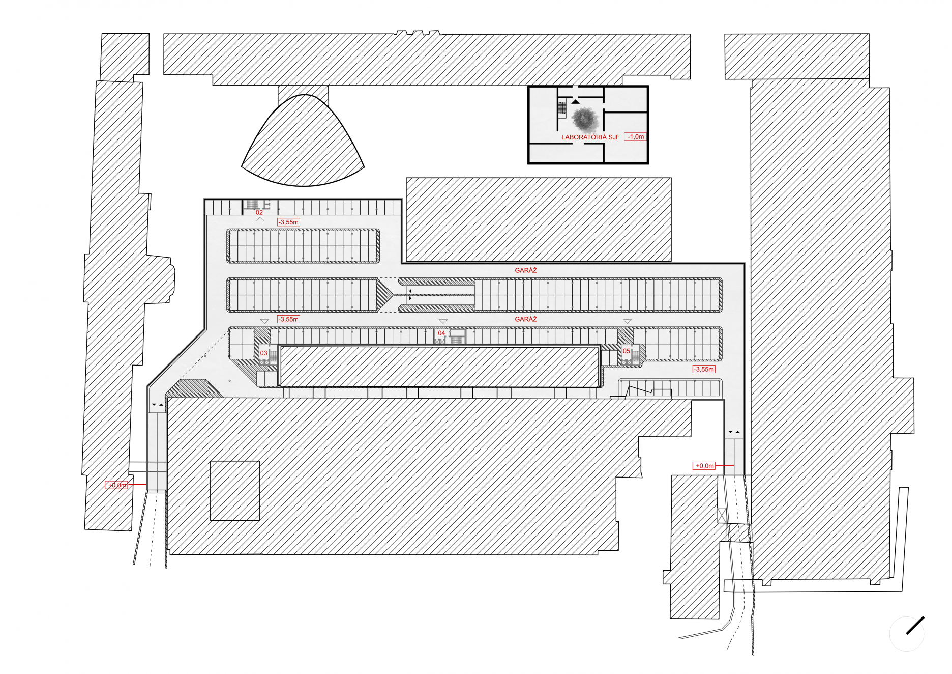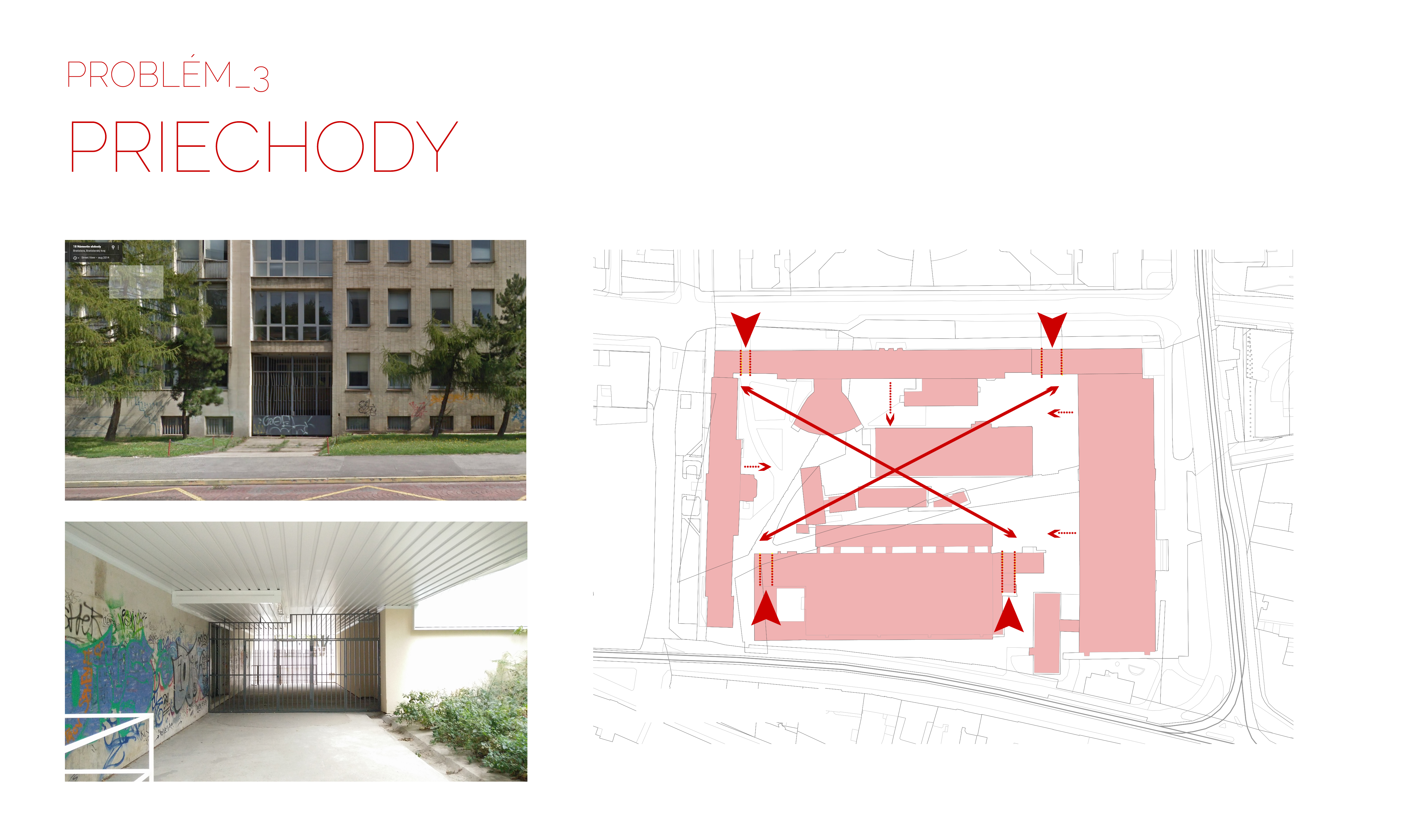 Prvým zásadným rozhodnutím, okrem zachovania pôvodnej budovy laboratórií, sa stalo sprístupnenie areálu otvorením všetkých súčasne existujúcich vstupov do priestoru. Druhým rozhodnutím je riešenie dopravnej situácie vytvorením podzemného hromadného parkoviska, ktoré sa v danej lokalite javí ako najvhodnejšie. Odstraňuje sa tým doprava z povrchu a vzniká viac priestoru pre ľudské aktivity. V prvých návrhoch konceptu sa počítalo s vytvorením dvoch rampových vstupov do podzemných garáží umiestnených pod povrchom areálu. Prvým, už existujúcim, zo strany Fakulty chemickej a potravinárskej technológie a druhým v dvoch alternatívach so vstupom od Strojníckej fakulty alebo technicky náročnejšie realizovateľnejším spôsobom pod spojovacou budovou bloku B a C Stavebnej fakulty.