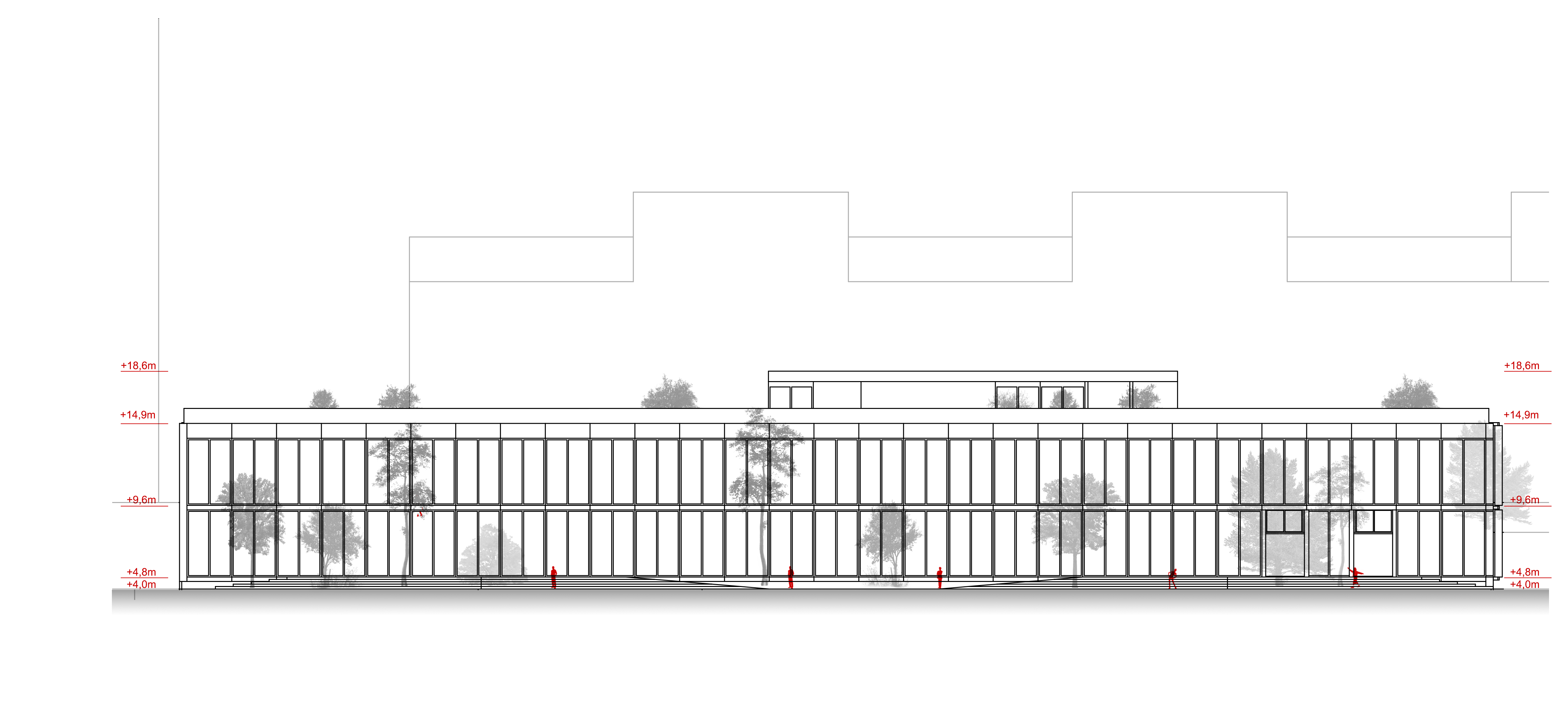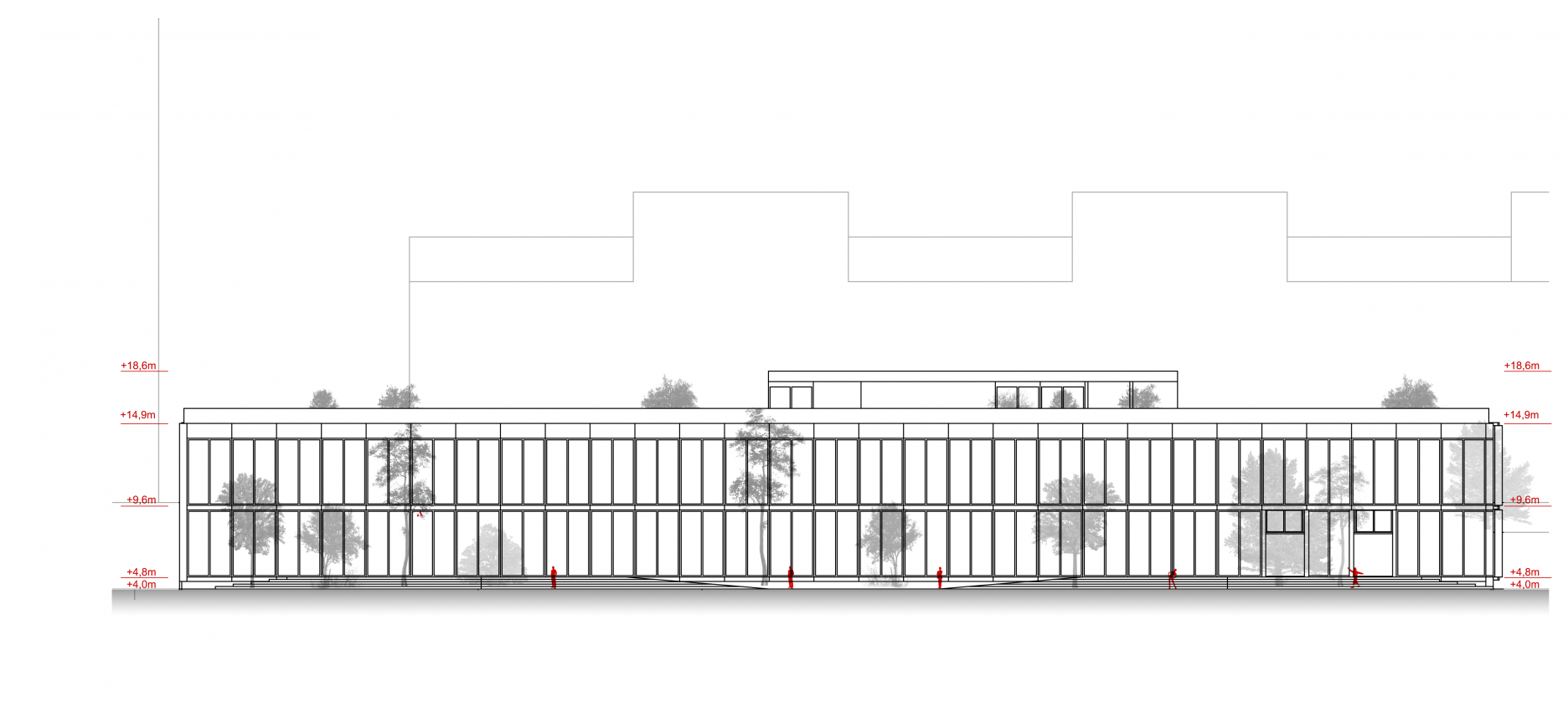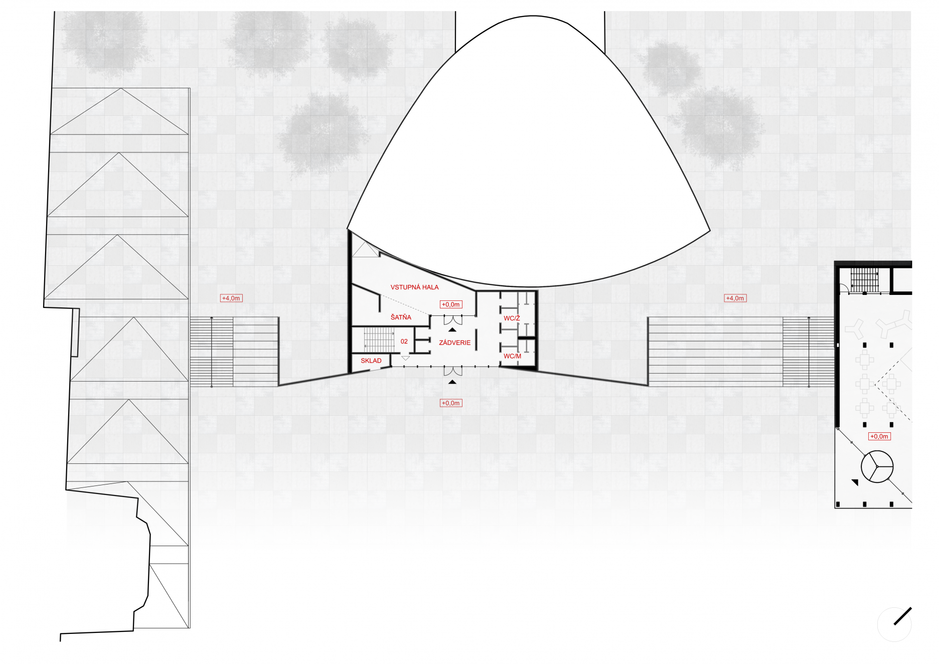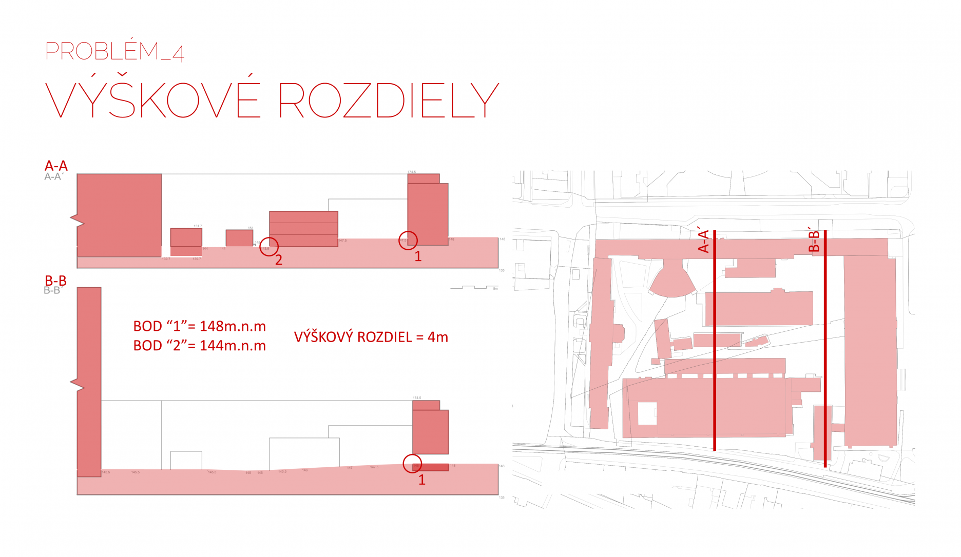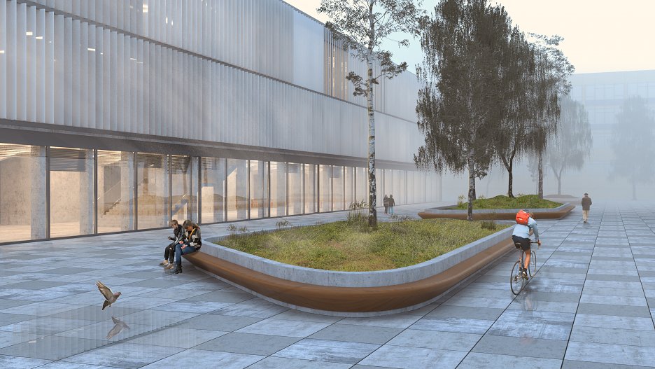 Tretím dôležitým rozhodnutím bolo prekonanie terénneho rozdielu územia. Z troch variant riešenia, kedy by sa úroveň terénu prispôsobila najvyššej alebo najnižšej kóte terénu, poprípade by sa vytvoril terénny zlom v areáli, vychádza ako najvhodnejšia tretia možnosť. Určenie terénneho zlomu na hrane budovy laboratórií, prirodzene tam, kde sa nachádza v súčasnosti, umožňuje najmä využiť plný potenciál podlažnosti budovy.