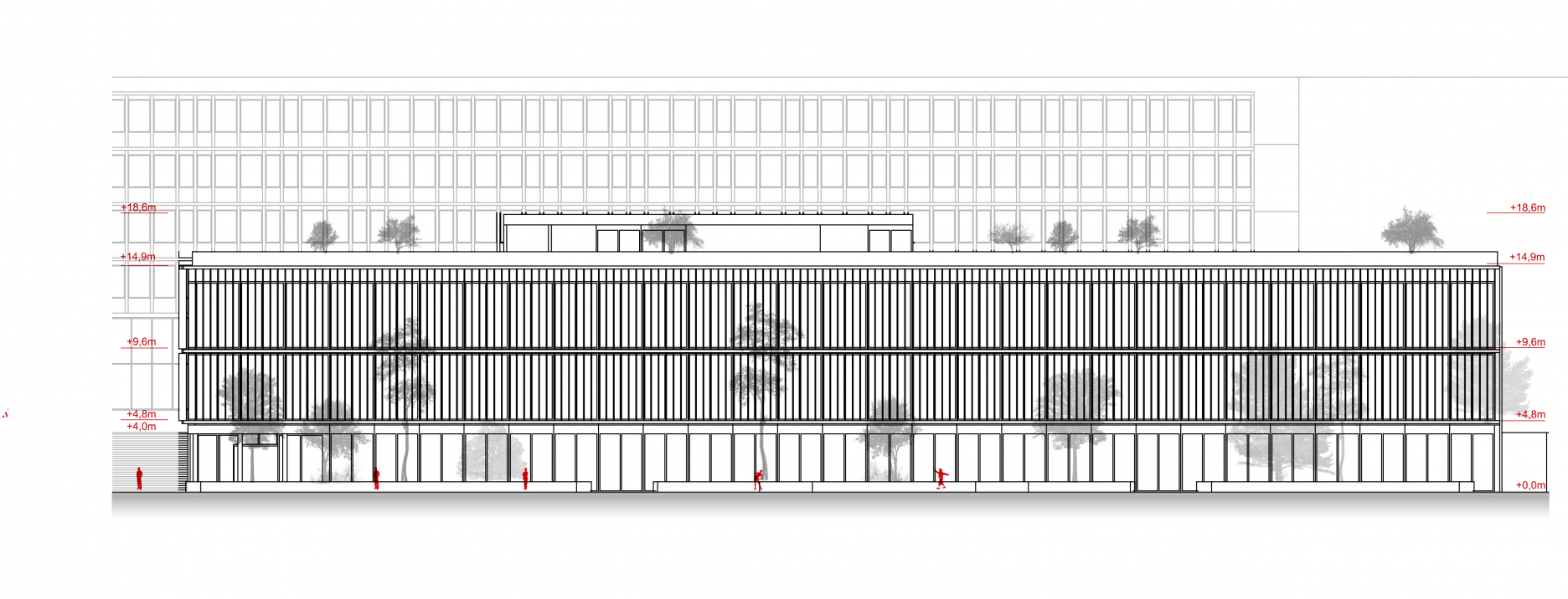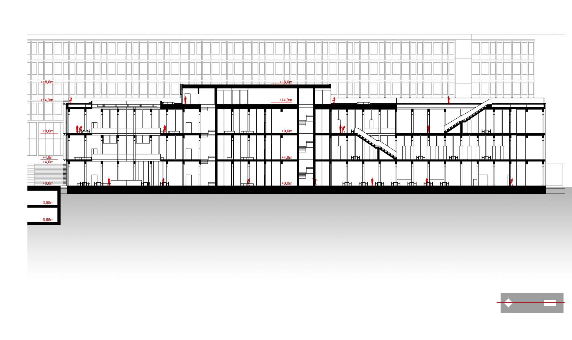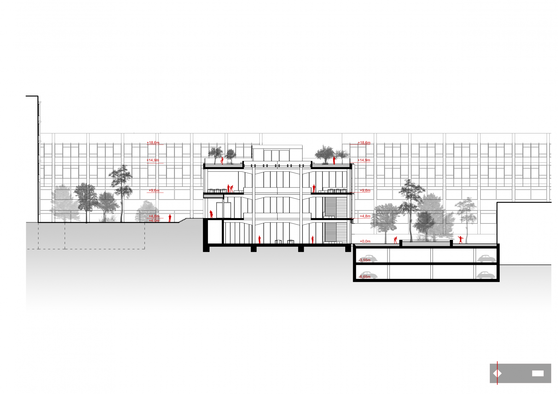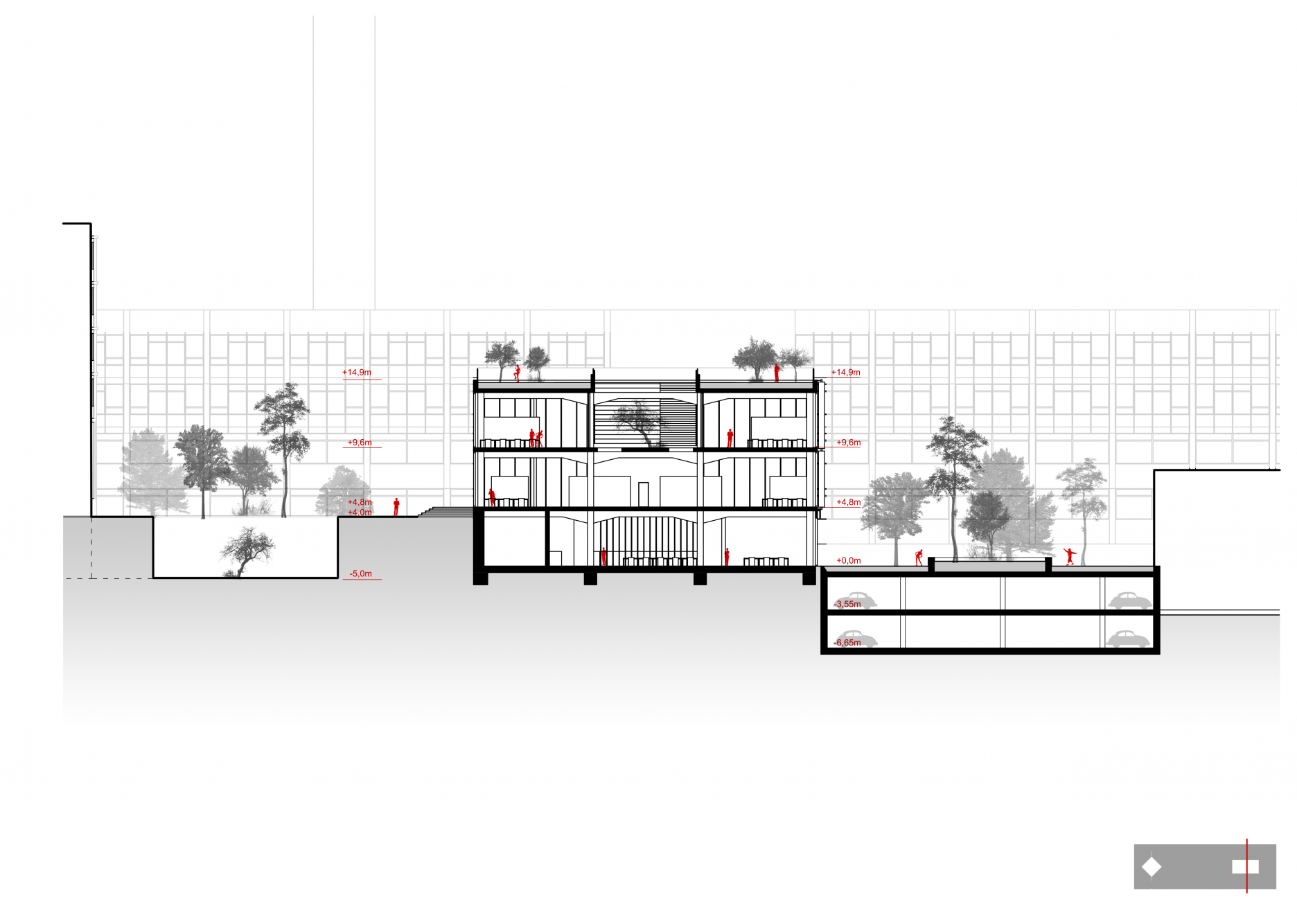 Tretím dôležitým rozhodnutím bolo prekonanie terénneho rozdielu územia. Z troch variant riešenia, kedy by sa úroveň terénu prispôsobila najvyššej alebo najnižšej kóte terénu, poprípade by sa vytvoril terénny zlom v areáli, vychádza ako najvhodnejšia tretia možnosť. Určenie terénneho zlomu na hrane budovy laboratórií, prirodzene tam, kde sa nachádza v súčasnosti, umožňuje najmä využiť plný potenciál podlažnosti budovy.