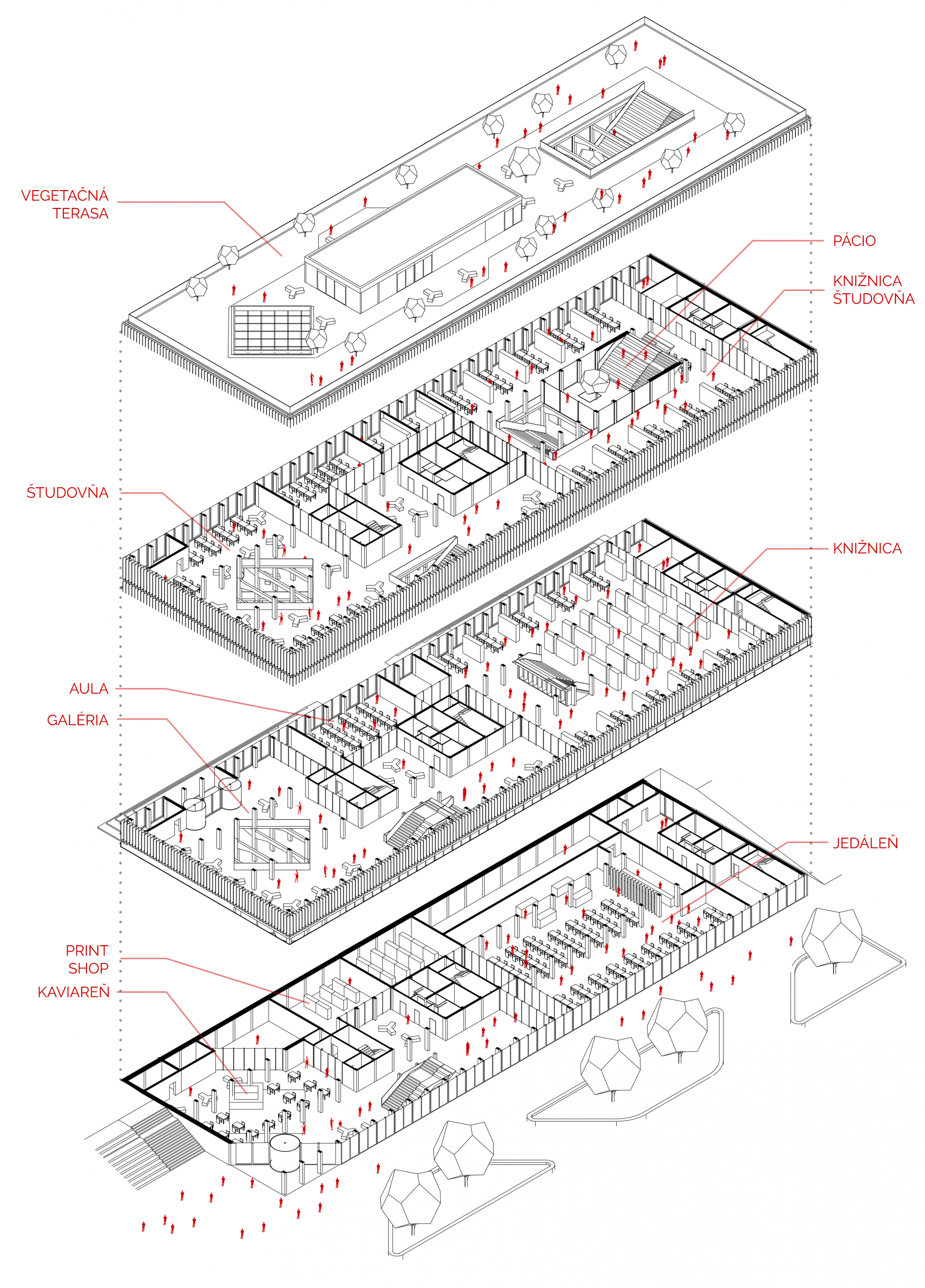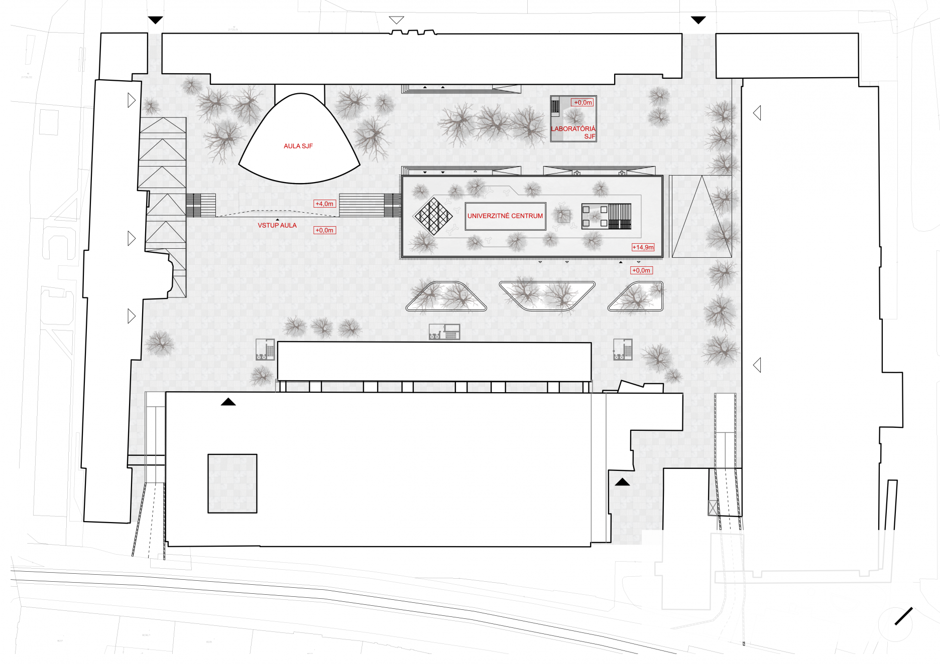 Návrh sa skladá z dvoch častí. Prvá časť rieši urbanistickú problematiku lokality vytvorením podzemného dvojpodlažného parkovania a terénnym vyrovnaním rozdielnej elevácie územia s vytvorením malého námestia. Druhá časť projektu sa venuje revitalizovaniu a zmene funkcie budovy laboratórií Strojníckej fakulty. Revitalizovaný objekt zachováva svoju podlažnosť. Zásadnou zmenou a vstupom do objektu je odstránenie dvoch nosných traktov budovy pre zväčšenie odstupovej vzdialenosti od objektu auly Strojníckej fakulty. Na jednotlivých podlažiach budovy sa nachádzajú všetky požadované funkčné celky univerzitného centra.