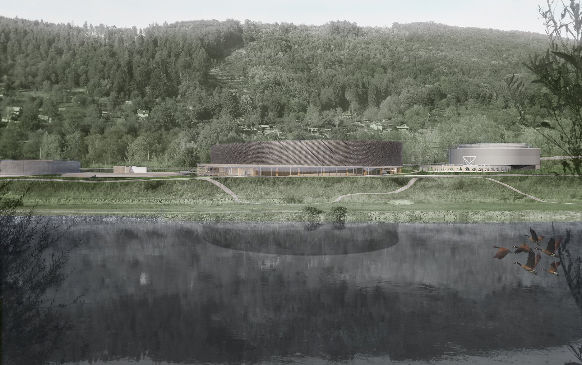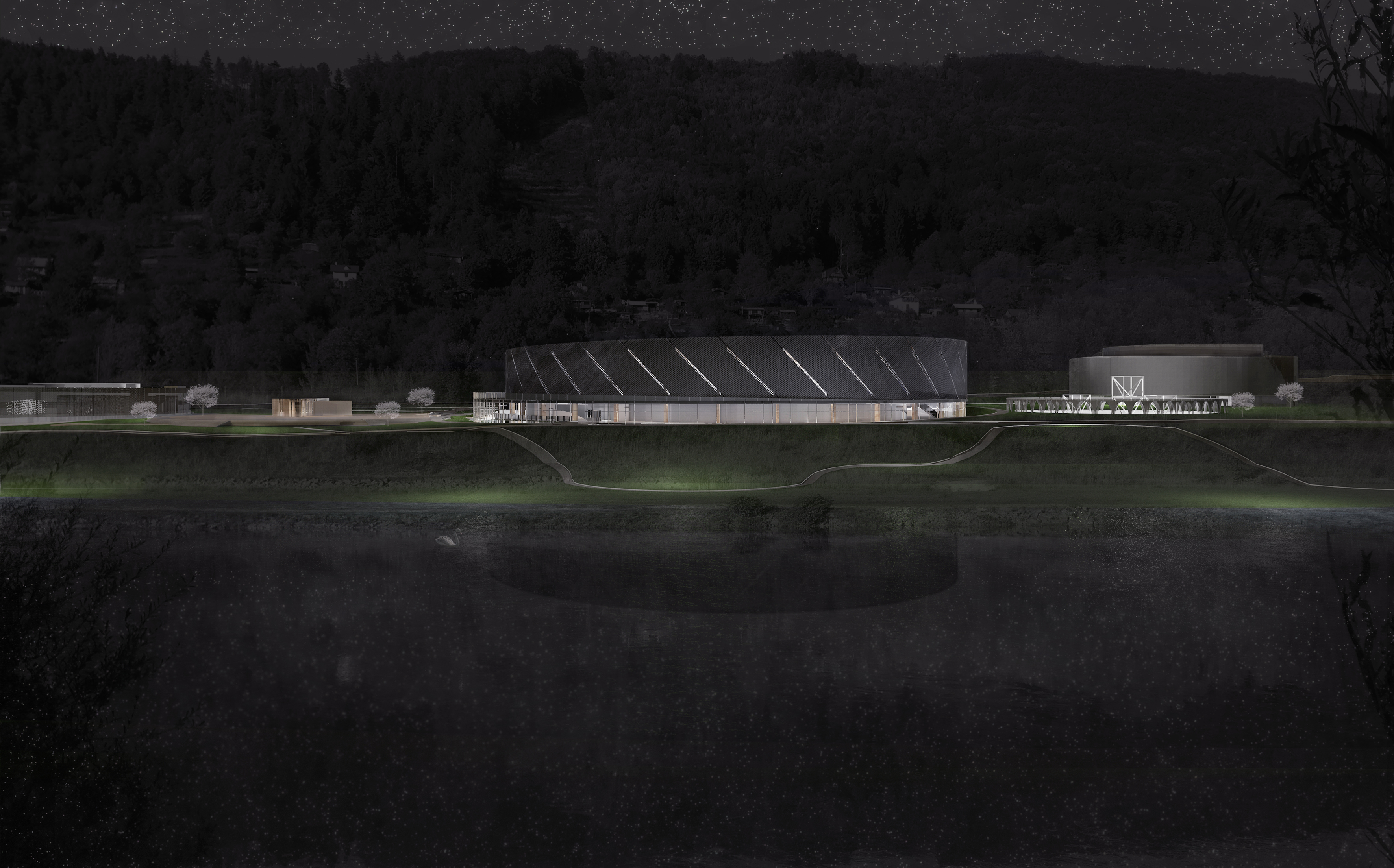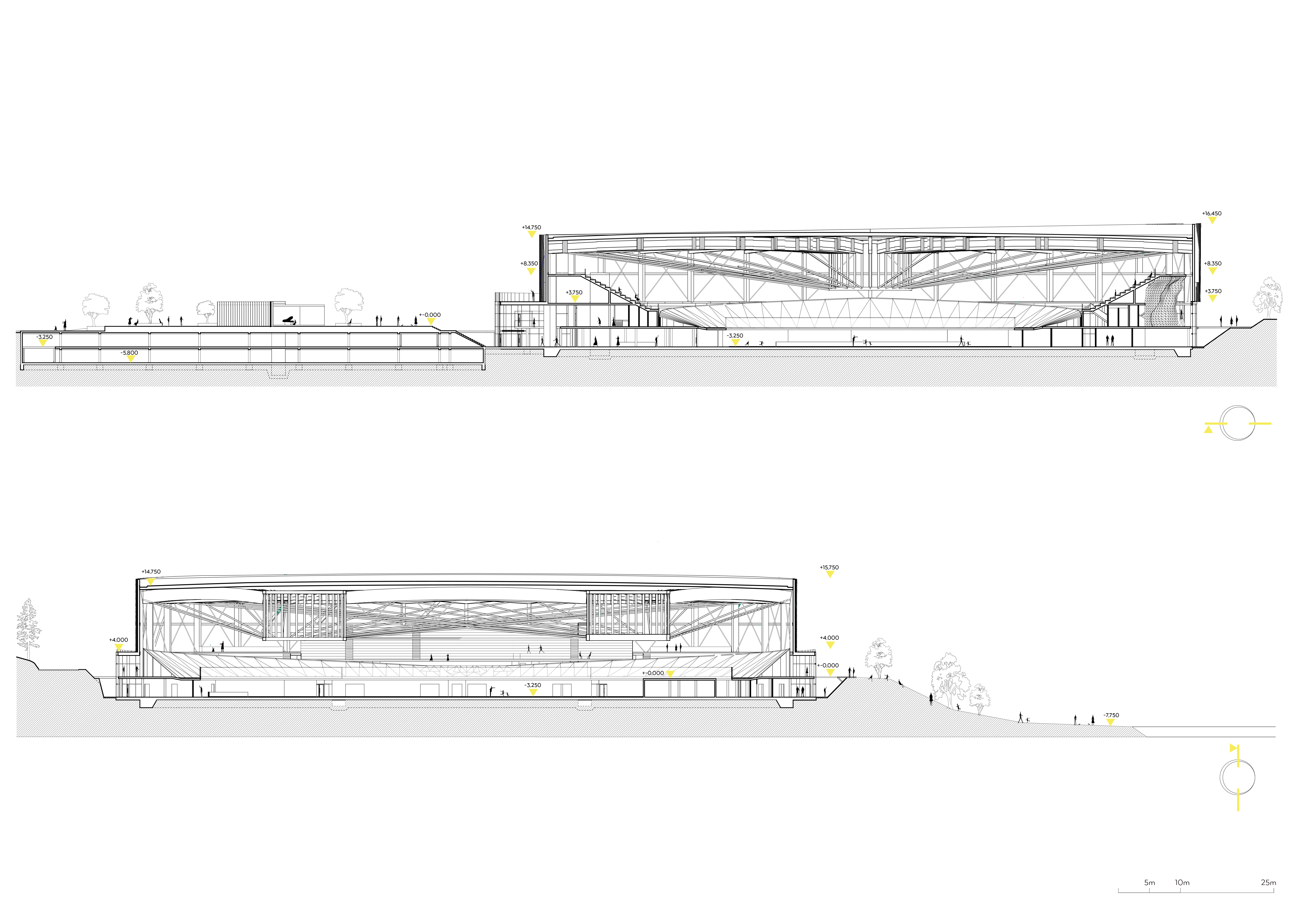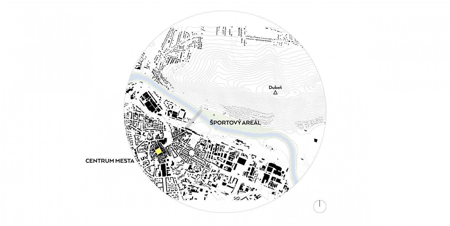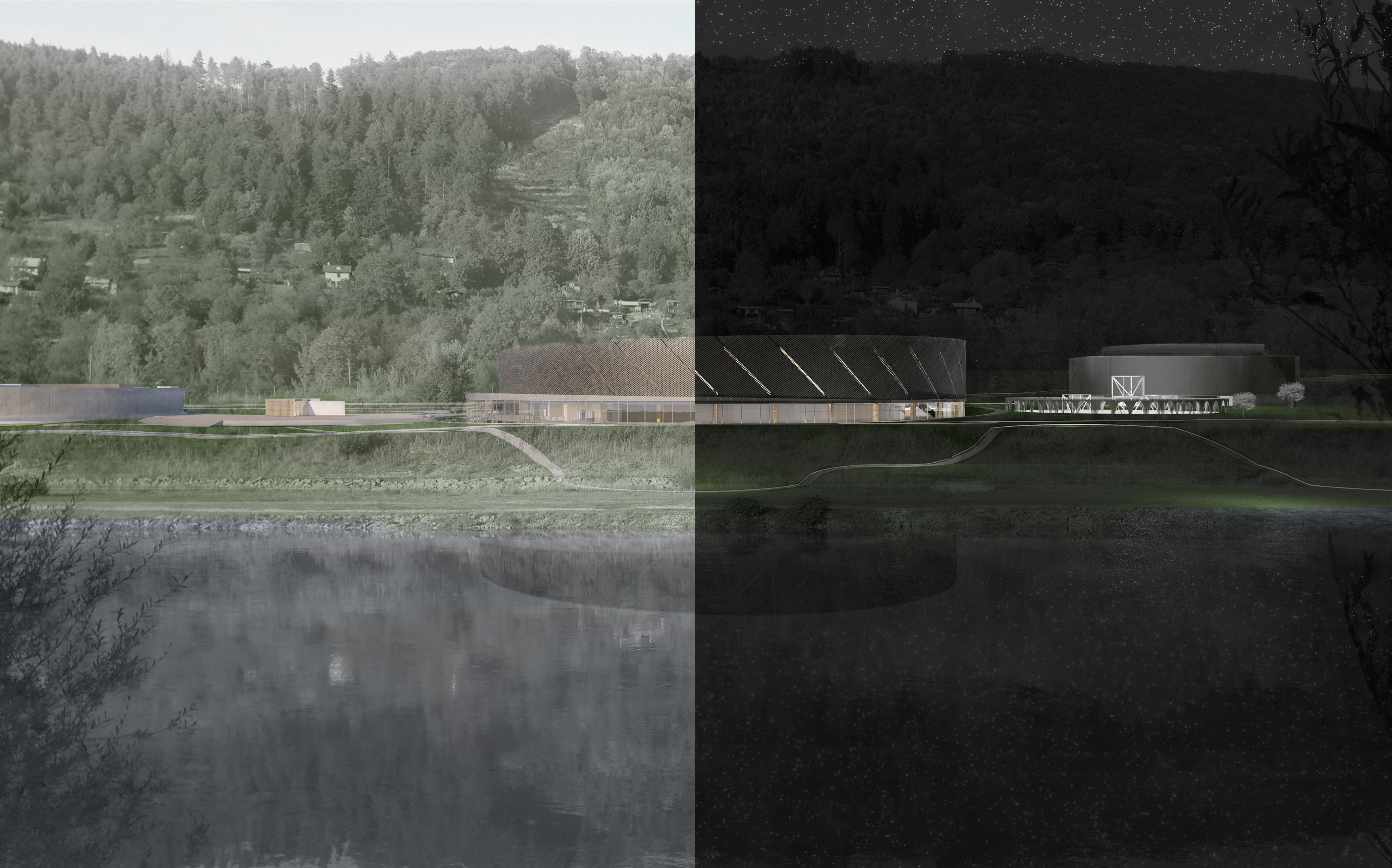 Športová hala je zapustená v terénnom svahu o výšku jedného podlažia, a to z dôvodov zachovania vyhovujúcejšej mierky a možnosti presvetlenia priestorov v podzemnom podlaží. Prirodzené svetlo môže prenikať do hĺbky dispozície, čo podporí príjemnejšiu atmosféru. Transparentný parter, posilňuje myšlienku vizuálneho kontaktu a prelínania interiéru a krajiny – rieky. Návštevníci sú neustále v kontakte s exteriérom, ak sa pohybujú po parametri haly. Počas sledovania diania zápasov alebo iných podujatí je ich pozornosť sústredená len na javisko/športovisko.