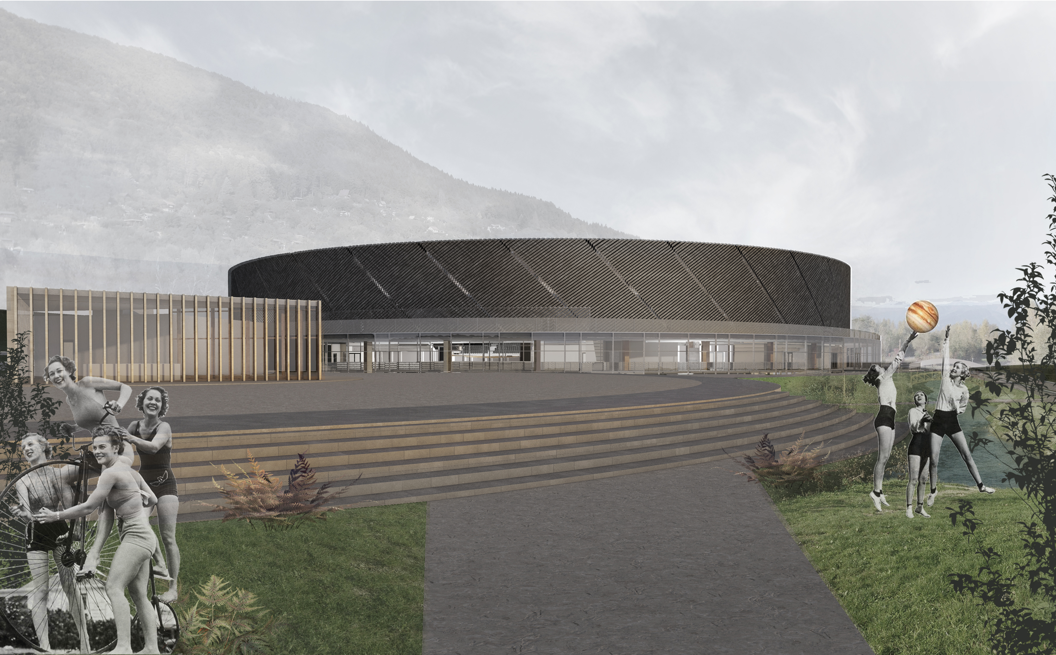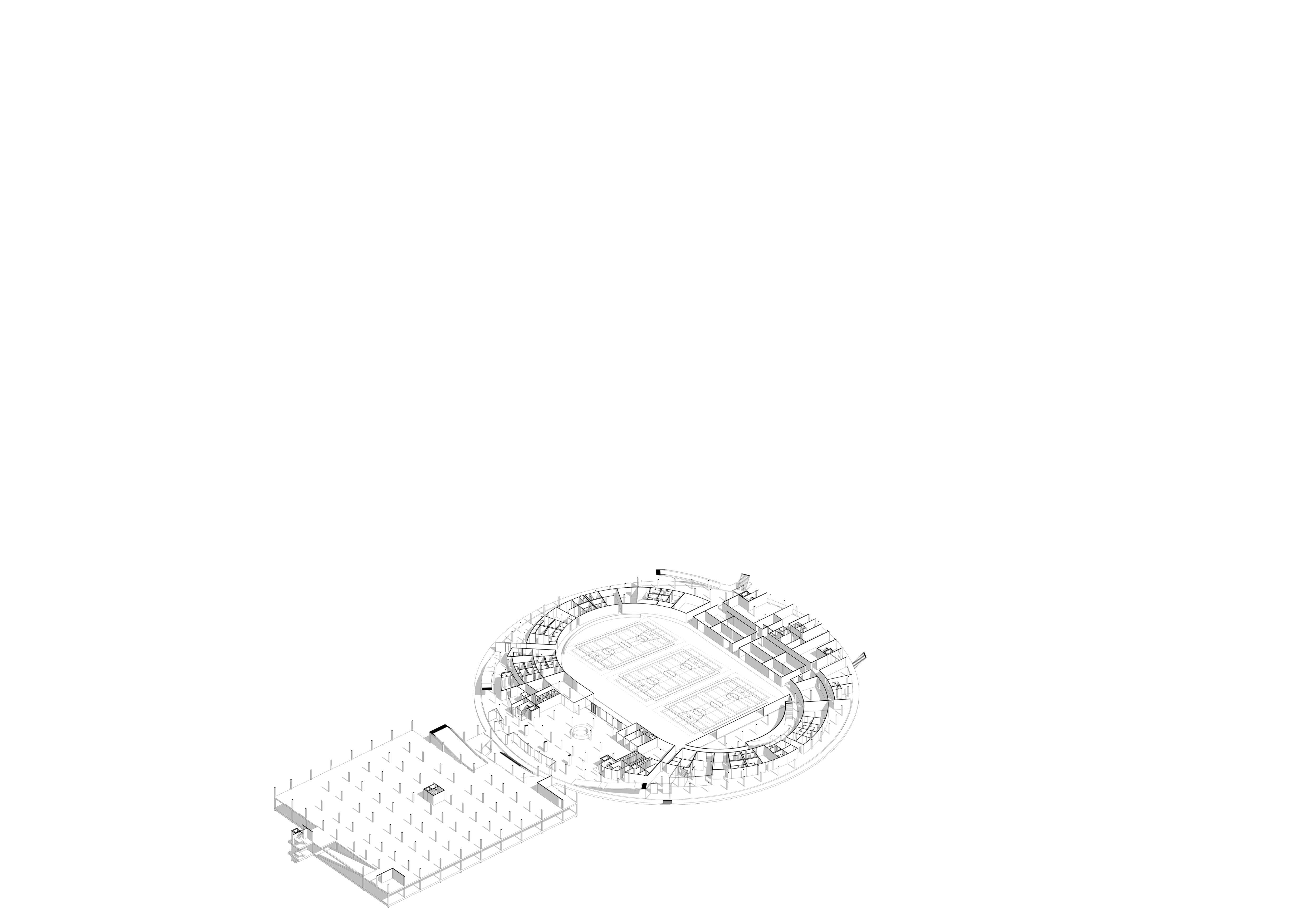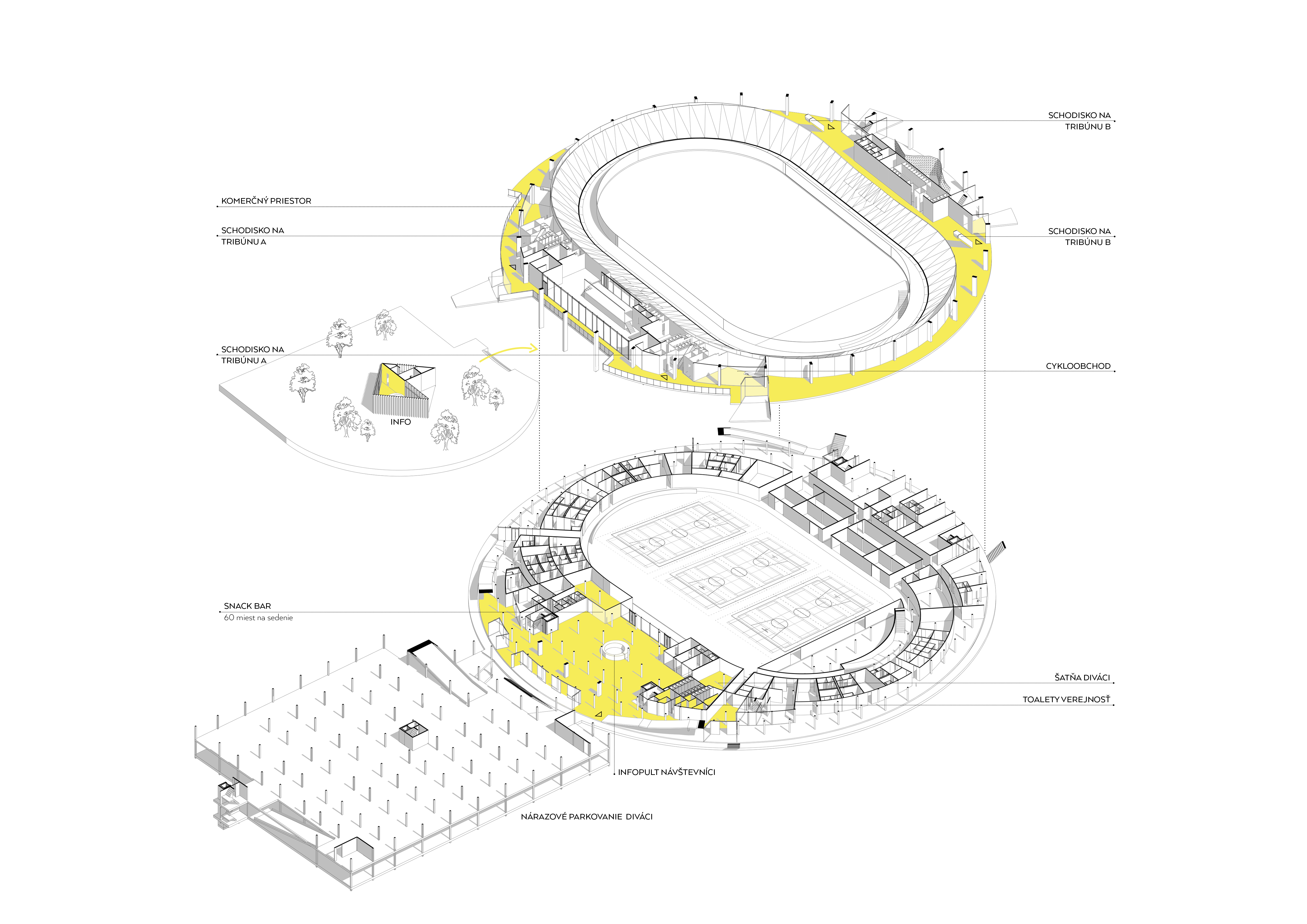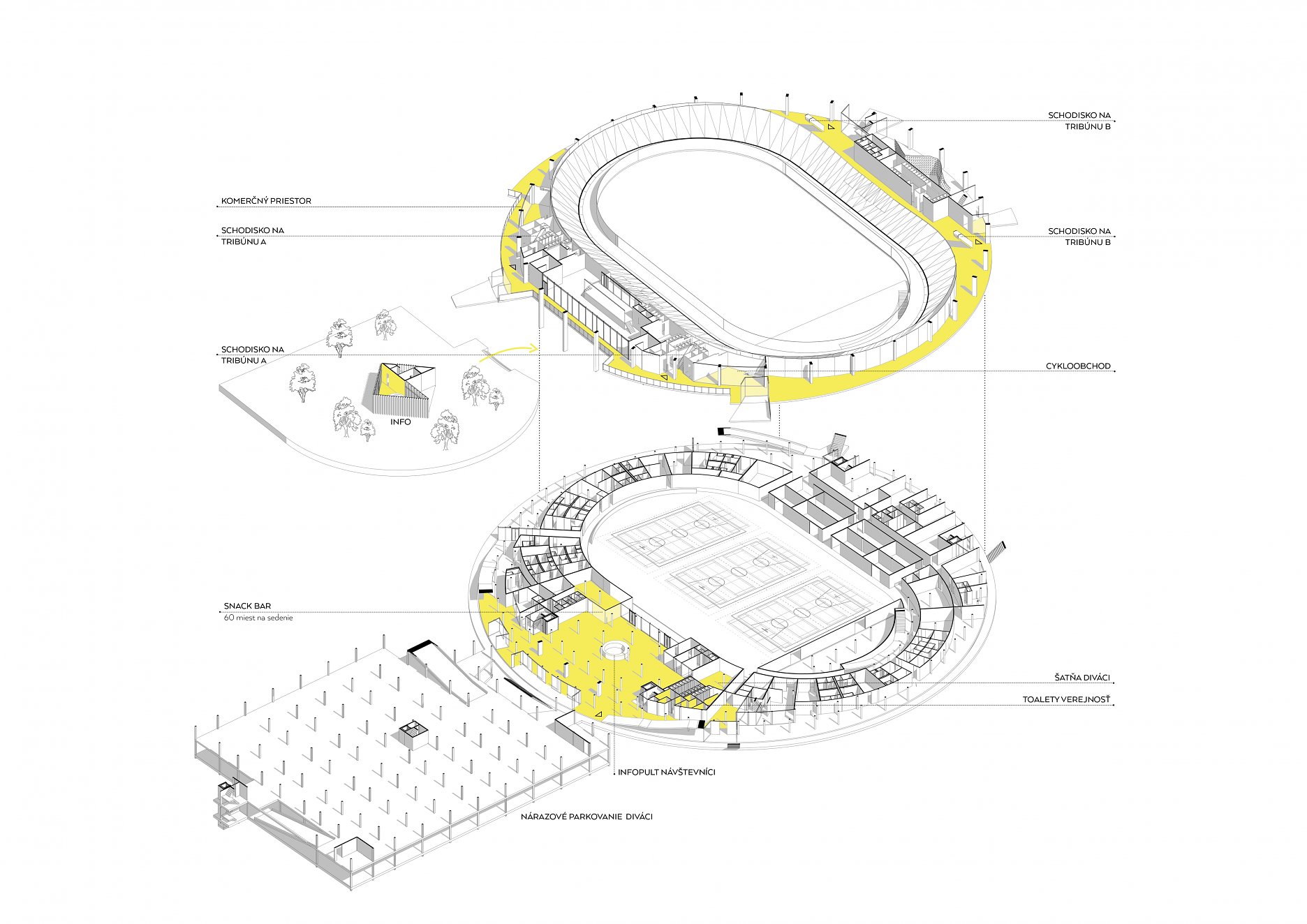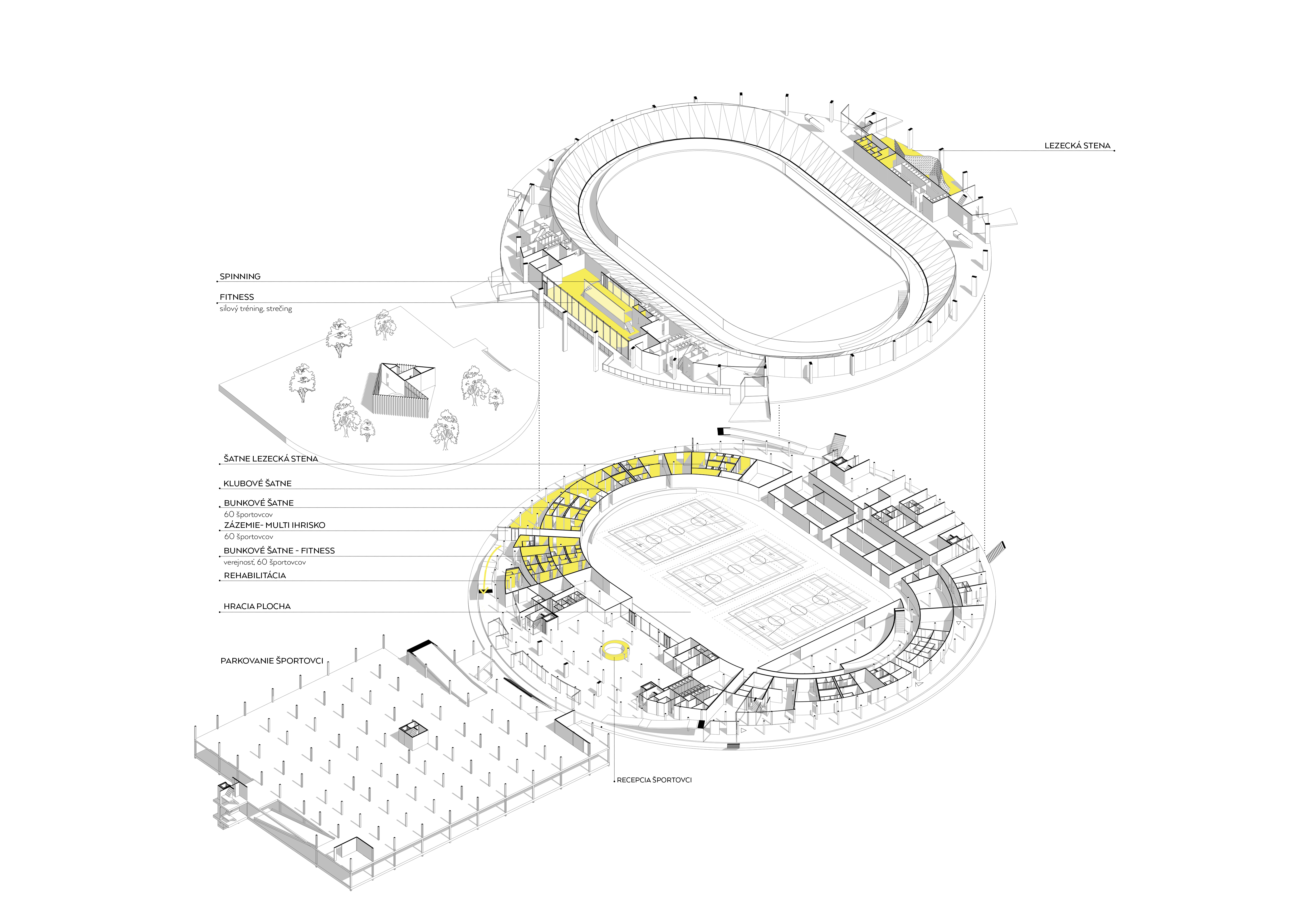 Športová hala spája dva typologicky príbuzné druhy športových plôch – multifunkčné ihrisko a velodróm – dráhu pre rýchlostnú cyklistiku. Práve velodróm je z hľadiska komerčnej životaschopnosti diskutabilným športoviskom, ktoré si vyžaduje značnú pôdorysnú stopu pre pomerne malý počet športovcov, v dôsledku čoho sa mnohé velodrómy len ťažko udržia vo fungovaní. Zvýšenie okupácie a ekonomickej udržateľnosti spočíva práve v multifunkčnom návrhu.