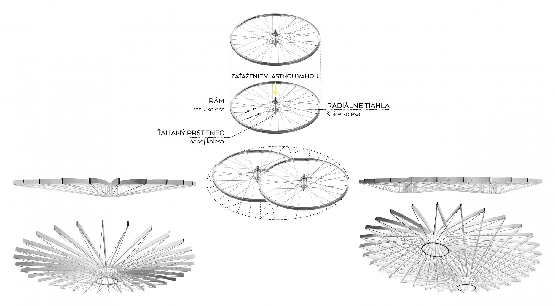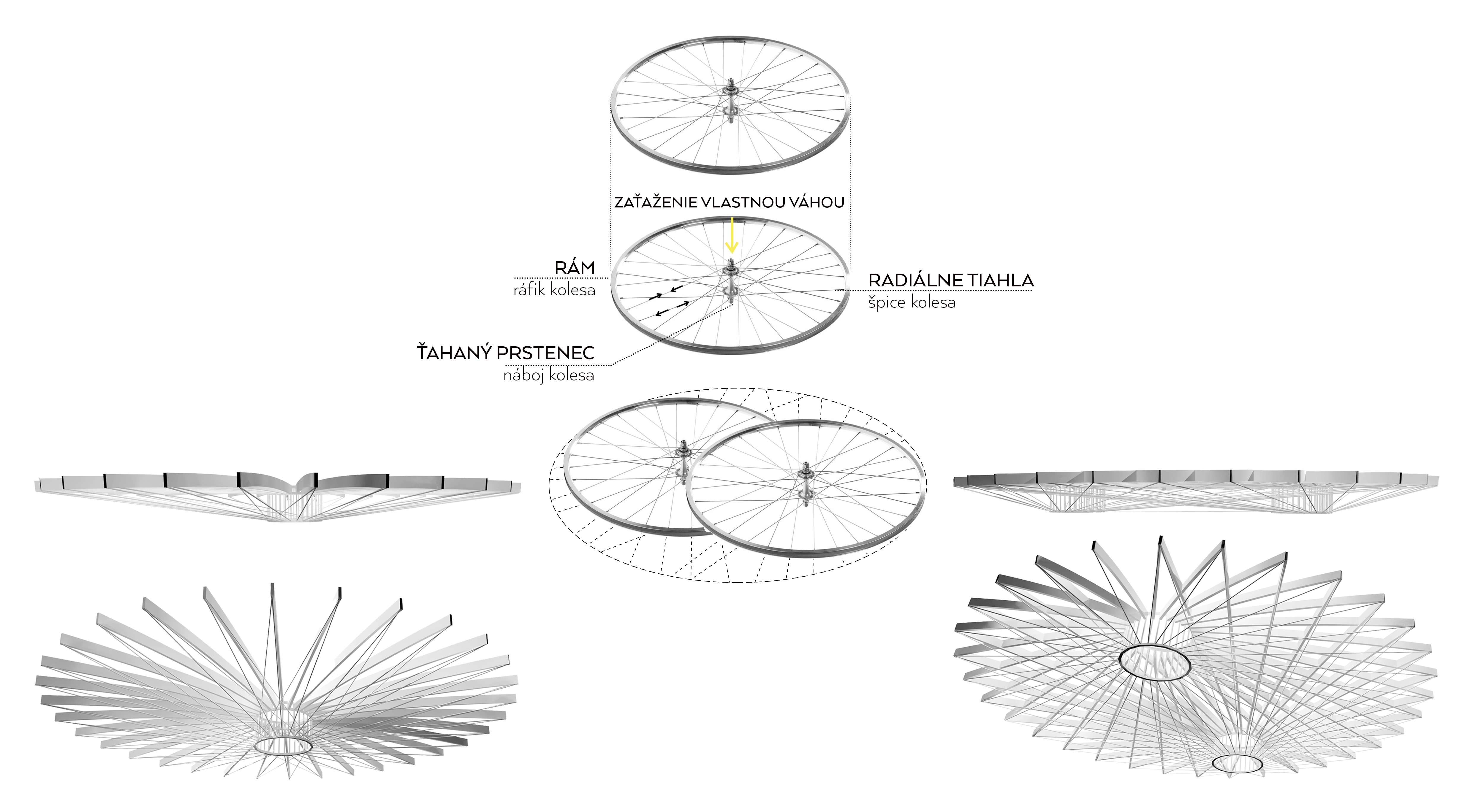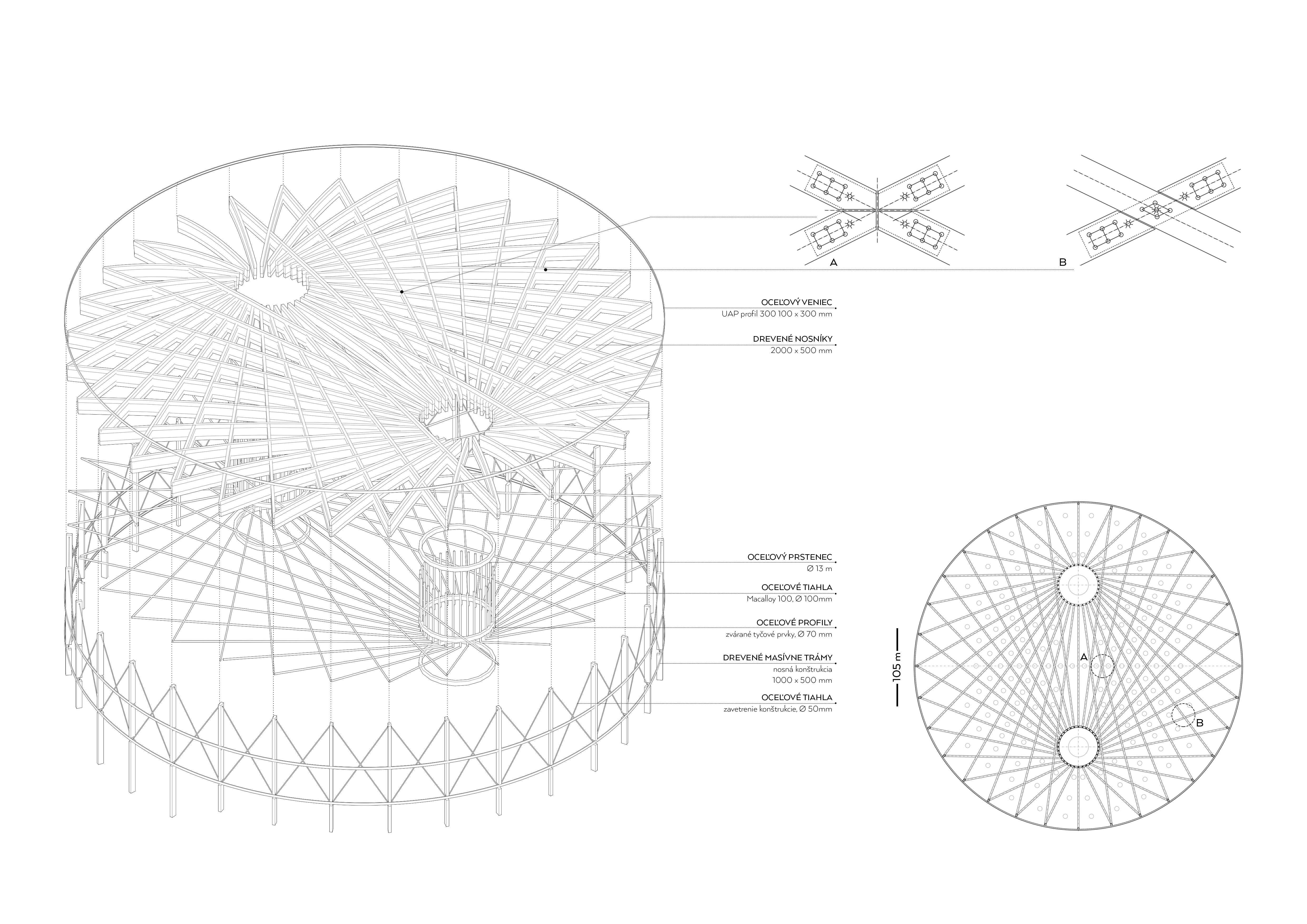 Veľkorozponová konštrukcia hlavného prstenca priemeru 105 metrov pozostáva zo spriahnutej sústavy drevených a oceľových prvkov na základe inšpirácie - výpletu dvoch kolies bicykla. Radiálna štruktúra a celkové vyľahčenie konštrukcie je zaistené návrhom predpätého priestorového vzpínadla, na princípe ktorého sa 32 drevených nosníkov a oceľových tiahel zbieha v dvoch stredových prstencoch. Stredové priestorové prstence majú priemer 13 metrov a pozostávajú z oceľových zváraných profilov rôznych dimenzií. Masívne drevené nosníky rozmerov 2000x500 mm so vzopätím 1000 mm tvoria osovo súmerný priestorový rošt nad dráhou velodrómu. Konce nosníkov sú uložené na 32 drevených trámoch v dimenziách 1000x500 mm. Konštrukcia je doplnená o systém stužidiel v obvodovej rovine.