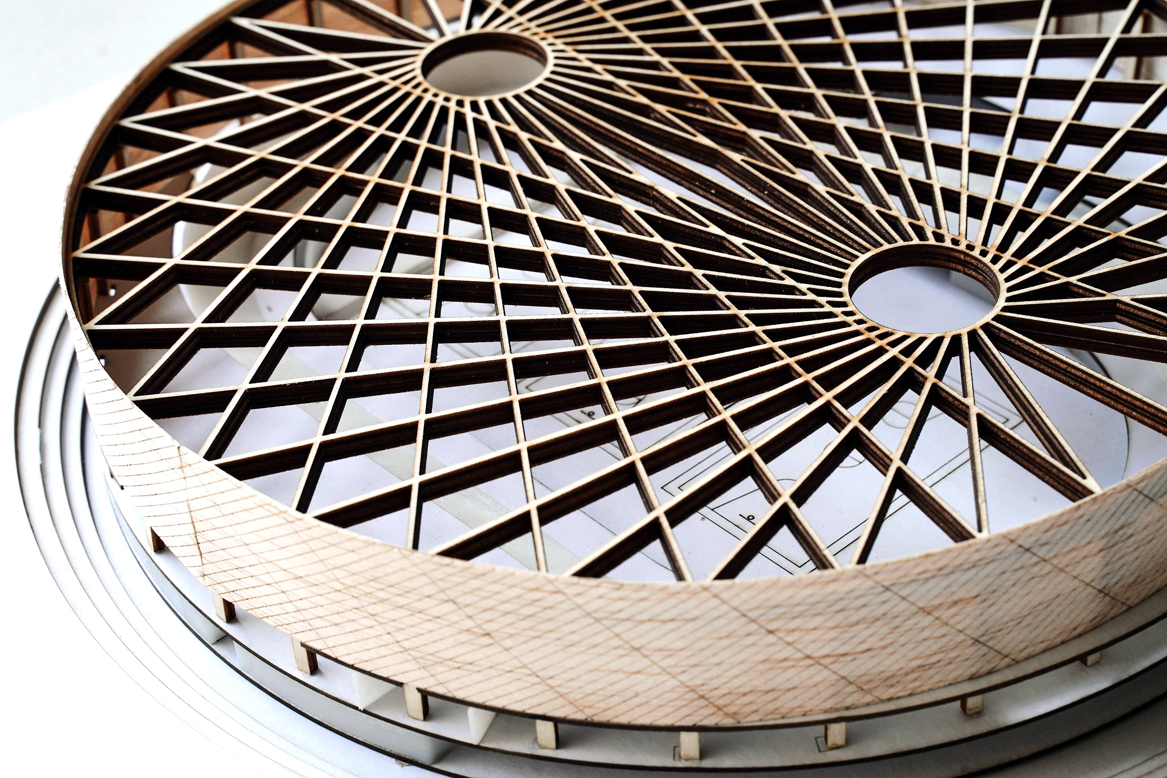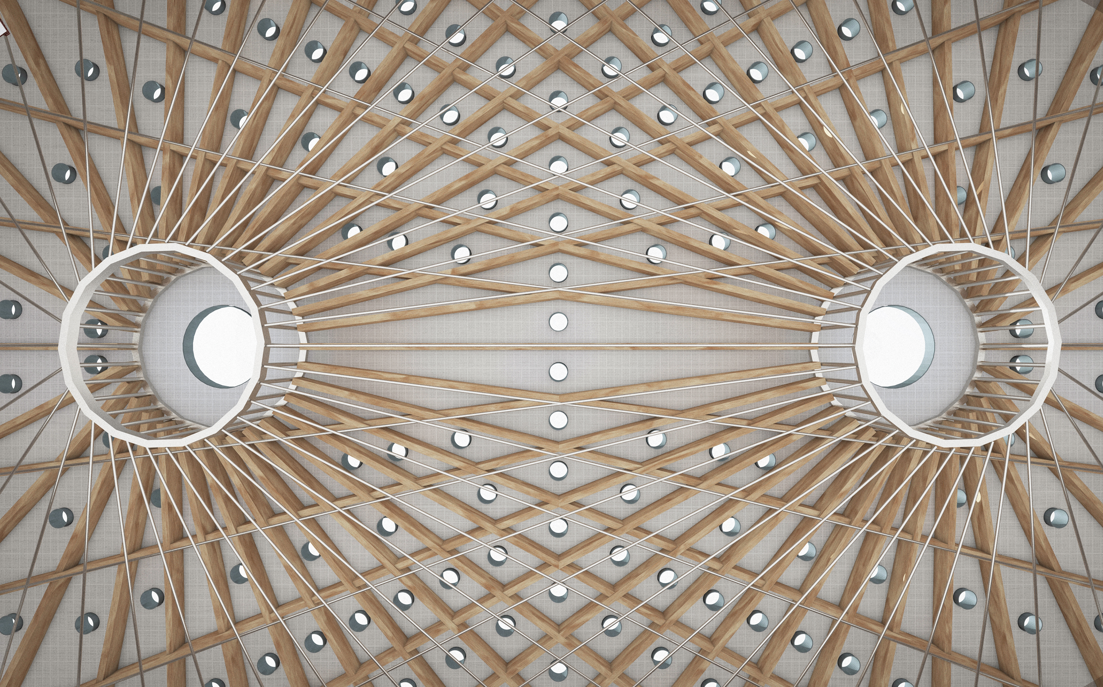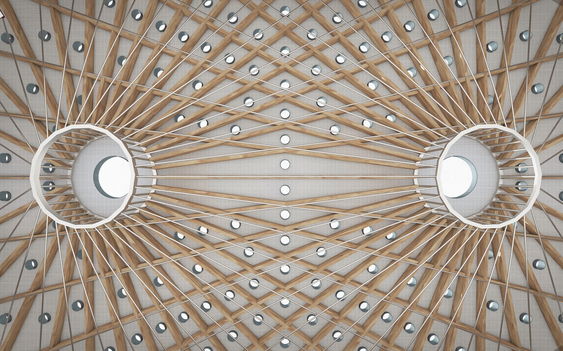 Veľkorozponová konštrukcia hlavného prstenca priemeru 105 metrov pozostáva zo spriahnutej sústavy drevených a oceľových prvkov na základe inšpirácie - výpletu dvoch kolies bicykla. Radiálna štruktúra a celkové vyľahčenie konštrukcie je zaistené návrhom predpätého priestorového vzpínadla, na princípe ktorého sa 32 drevených nosníkov a oceľových tiahel zbieha v dvoch stredových prstencoch. Stredové priestorové prstence majú priemer 13 metrov a pozostávajú z oceľových zváraných profilov rôznych dimenzií. Masívne drevené nosníky rozmerov 2000x500 mm so vzopätím 1000 mm tvoria osovo súmerný priestorový rošt nad dráhou velodrómu. Konce nosníkov sú uložené na 32 drevených trámoch v dimenziách 1000x500 mm. Konštrukcia je doplnená o systém stužidiel v obvodovej rovine.