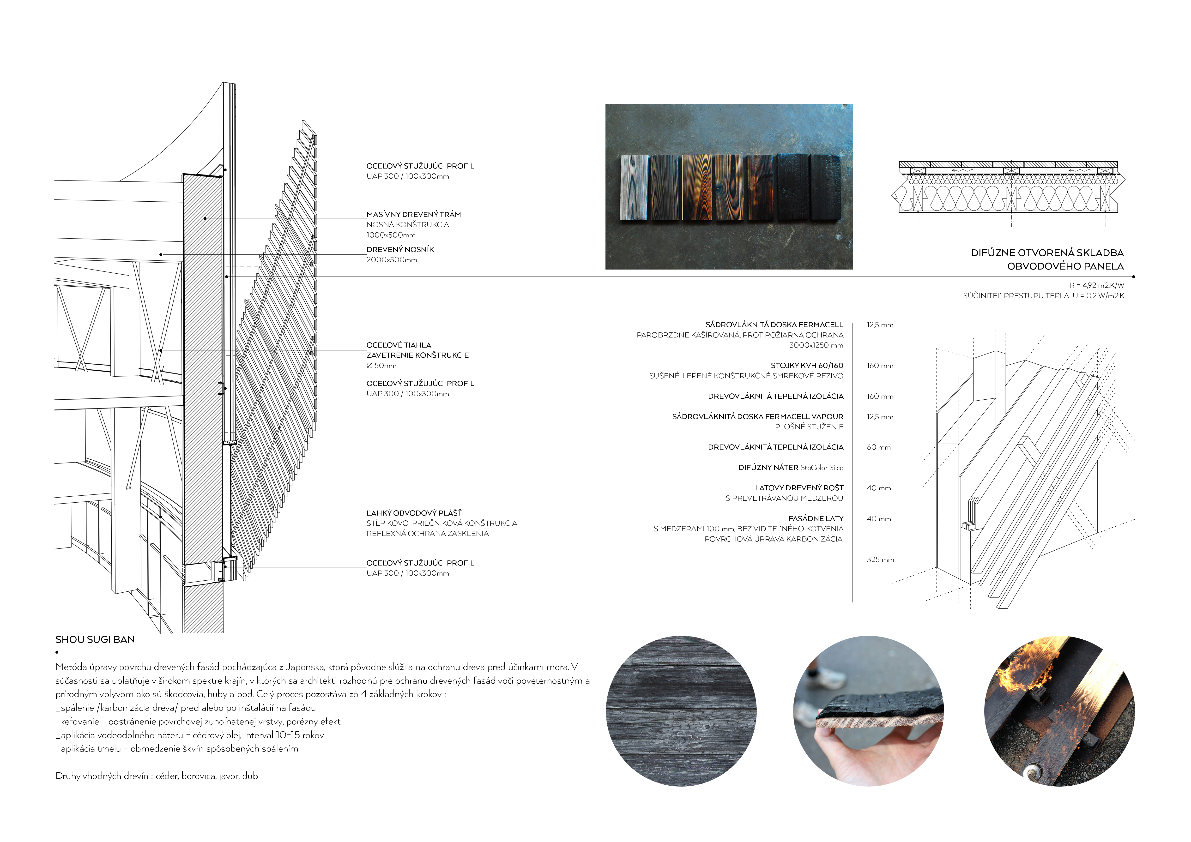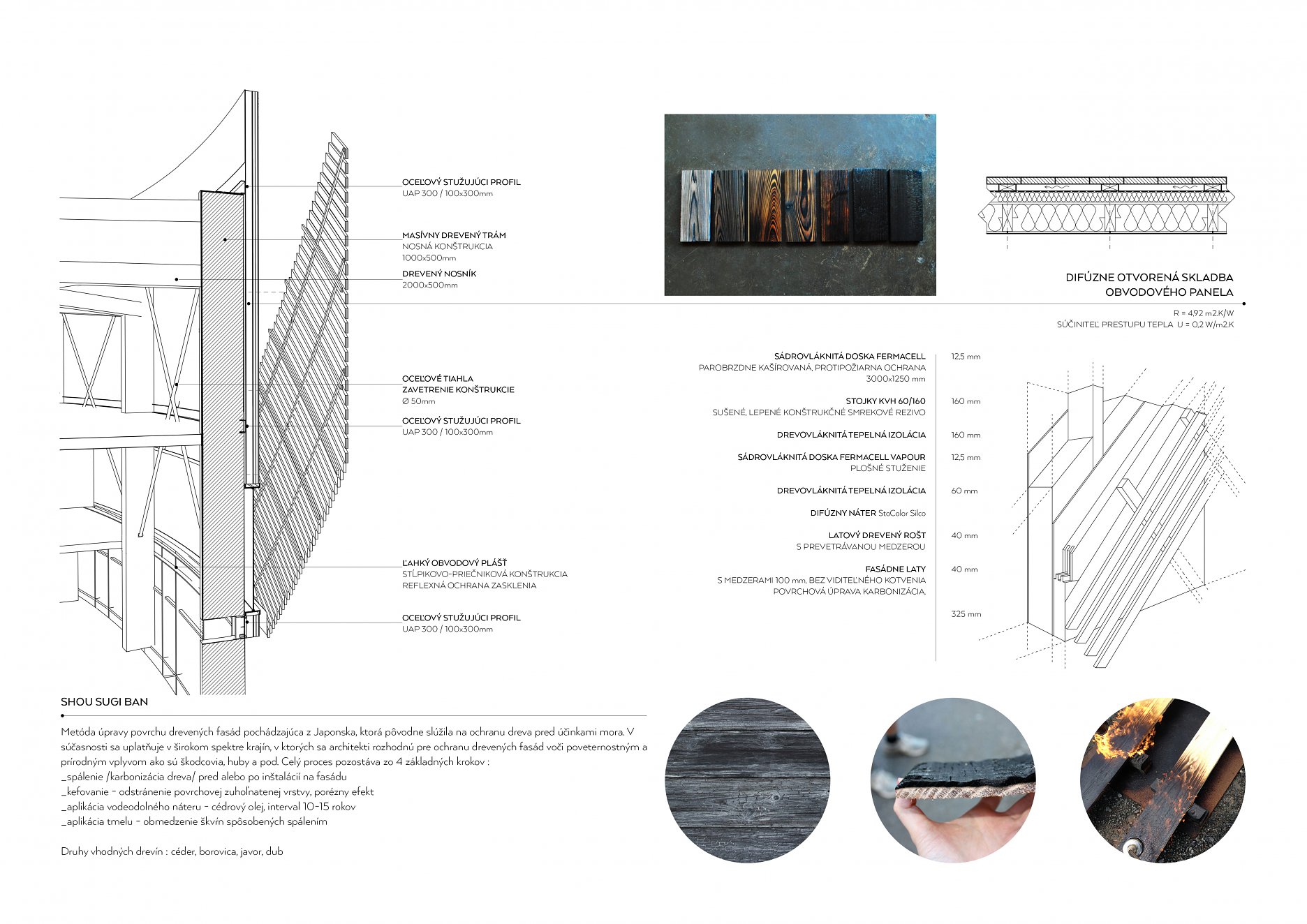 Ľahký obvodový plášť prvého nadzemného aj podzemného podlažia je navrhnutý ako stĺpikovo-priečniková hliníková konštrukcia s dostatočne tepelne vyhovujúcim zasklením, ošetreným reflexnou fóliou najmä na južnej fasáde. Netransparentný obvodový plášť funguje na princípe difúzne prevetrávanej fasády s finálnou úpravou – drevených lamiel z červeného smreka.