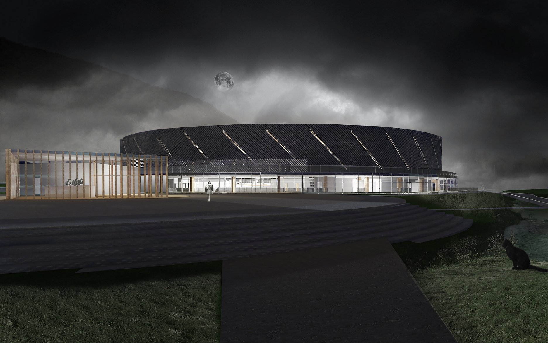Hmotové riešenie odráža dynamickú charakteristiku športov, ktoré sa v dejisku odohrávajú. Tvar prináša do návrhu aj symboliku kolobehu, ktorý zažíva nejeden športovec počas svojej profesionálnej kariéry. Návrh odmieta akýkoľvek zámer vytvárať amorfnú architektúru alebo násilné novotvary, ktoré odrážajú len neprítomnosť histórie v návrhu.