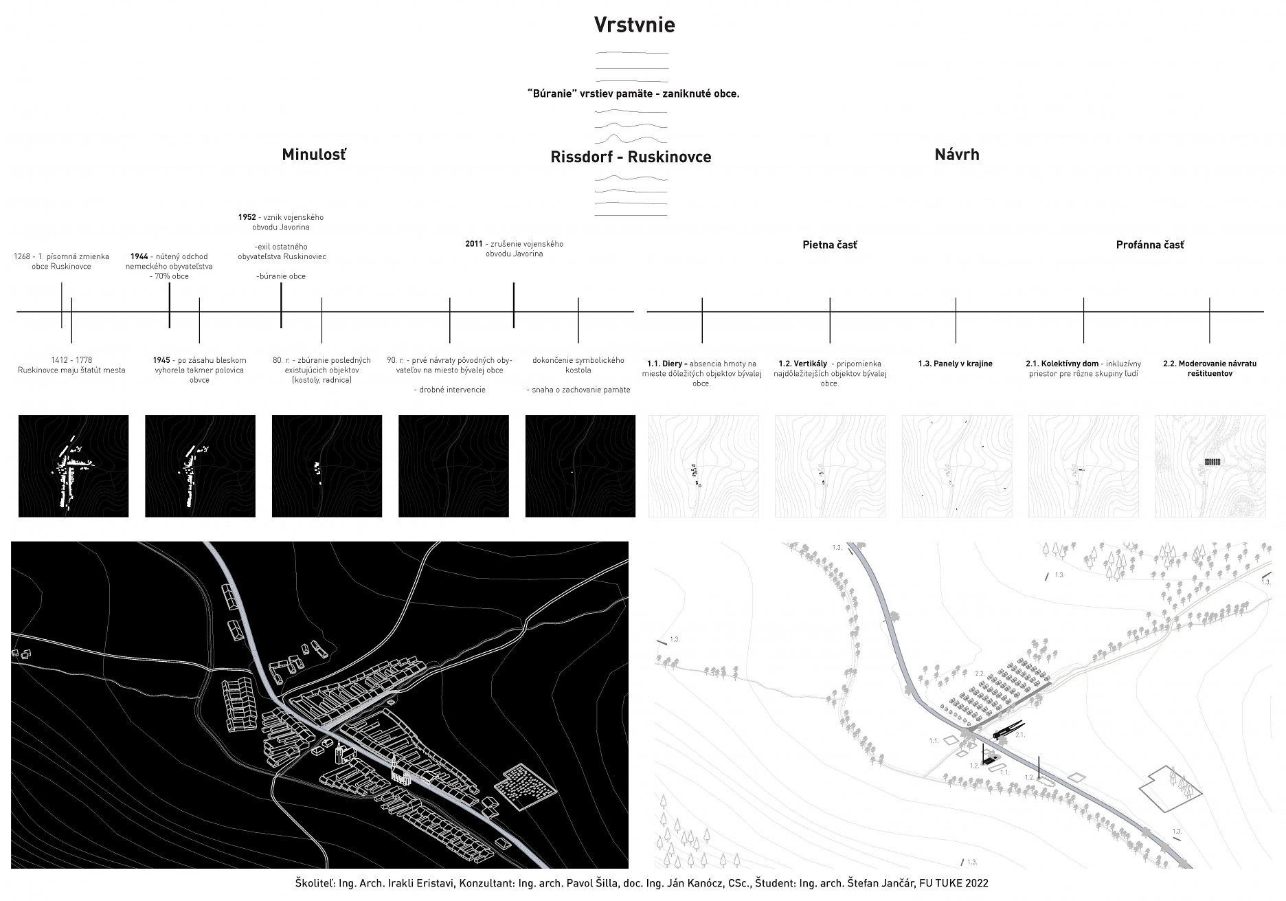 Absolventský projekt Štefana Jančára sa zo spektra načrtnutých lokalít sústredí na obec Ruskinovce. Na mieste zaniknutého sídla identifikuje snahu o vymazanie osobnej, kultúrnej a kolektívnej pamäte, ktorej súčasťou sú dva násilné odchody dvoch rôznych národností. Spišskú obec Ruskinovce pôvodne tvorilo množstvo hodnotných vrstiev, ktoré boli v roku 1952 vymazané. Padli za obeť novému využitiu územia ako vojenského pásma Javorina. Až zmena režimu umožnila aktivity pôvodných obyvateľov, ktorých snahou je záchrana pamäte a návrat na miesto bývalej obce. Výsledkom snaženia je symbolicky kostolík ako prvý krok návratu. Na základe spomínaných aktivít sa práca zaoberá procesom pokračovania návratu na miesto bývalej obce.