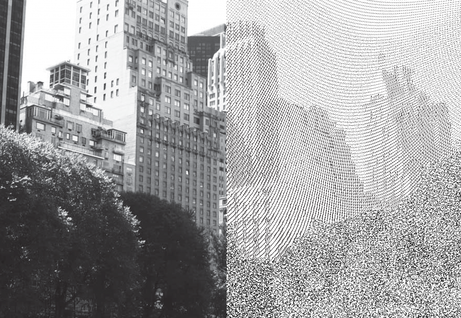 Usporiadané sily v ľavej časti predstavujú architektúru, čize výstup ľudskej činnosti, ktorý len veľmi primitívne reaguje na prostredie a jeho potencionálnu viazanú energiu. Fasáda mrakodrapu má vlastnosti, ktoré sa dajú spočítať na prstoch rúk. Toto množstvo spotrebovanej energie–akcie má reakciu niekde v zdevastovanej krajine od ťažby železnej rudy, uhlia až nakoniec sa prejavuje vo forme záplav na úplne inom konci sveta. Teda reakcia nastala, no úplne inej kvality, intenzity a nepozorovane pre používateľa. Z tohto pohľadu je architektúra stále primitívna a mrtvá hmota.
