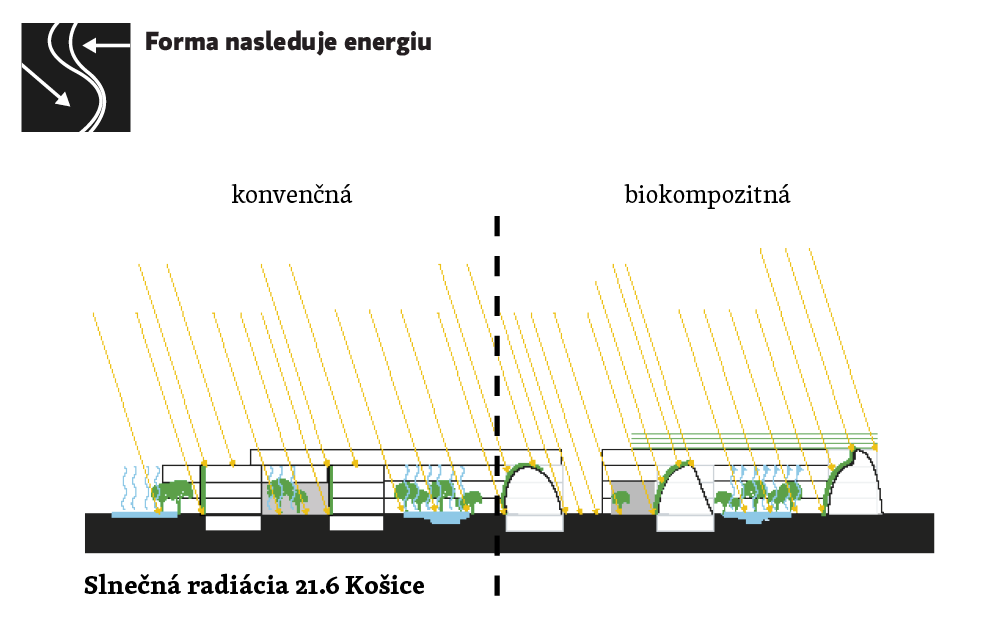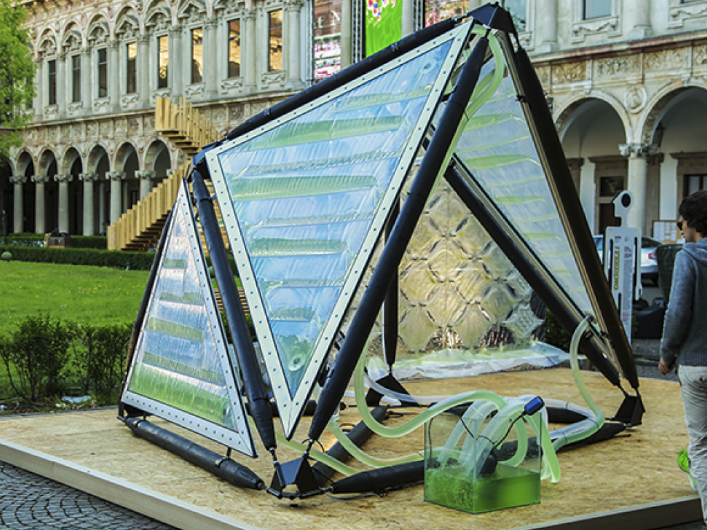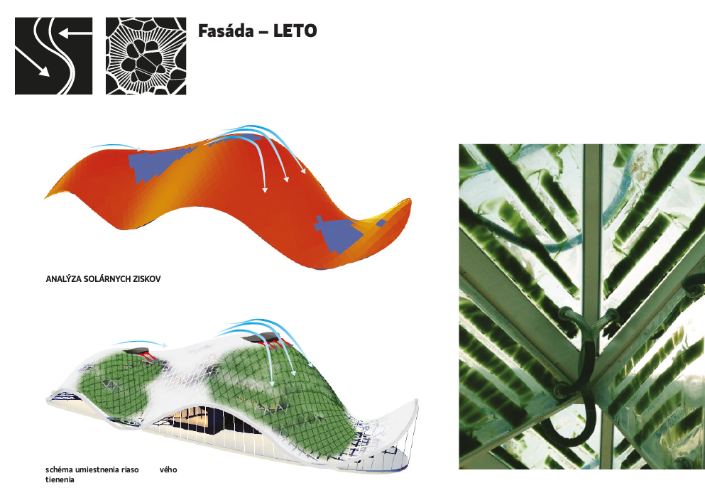 Na obrázku vidíme analýzu slnečnej radiácie a sklonu dopadajúcich lúčov na povrch anonymného objektu. Ten svojím konkávnym škrupinovým tvarom sleduje slnečné lúče v zimnom období. V letnom období sa však slnečnej energii pomerne silno otvára. V zásade Fullerovho výroku "Nebráňme sa energii, ale použime ju" sa nám otvára otázka, ako túto prebytkovú energiu slnka využiť? Neboli by sme dľeko keby sme odpovedali, rovnako ako strom. Spomínaná alternatíva fotovoltickým panelom využívajúca bio-potenciál riasy reaguje na prostredie totožne, ako listy stromu. Niekoľko rokov túto koncepciu testúje štúdio Eco-logic, ktoré navrhlo vlastnú tieniacu konštrukciu pre pavilón Expo v Miláne 2015. Využíva rast riasy na tienenie a zároveň ako konzervátor slnečnej energie do biomasy. Táto konštrukcia vyprodukuje kyslík ekvivalentne k 4 hektárom lesa a 150kg biomasy za jeden deň z ktorej 60% sú prírodné rastlinné bielkoviny.