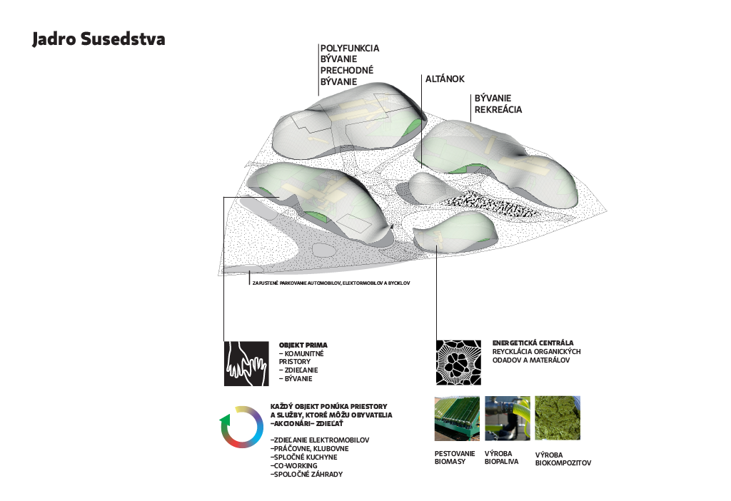 Susedstvo vo svojom urbanizme potrebuje mať zadefinované centrum – jadro kde sa koncentruje informačná, samosprávna, identifikčná hodnota. Je to zároveň priestor, kde sa technologicky spravuje kolobeh kolobeh energií v rámci susedstva a zároveň priestor na zdieľanie predmotev a služieb, ktoré nepotrebuje každá domácnosť denne, či týždenne. Miesto, kde ľudia komunikujú o svojom životnom priestore od rodiny, susedstva, komunity, mesta regiónu...