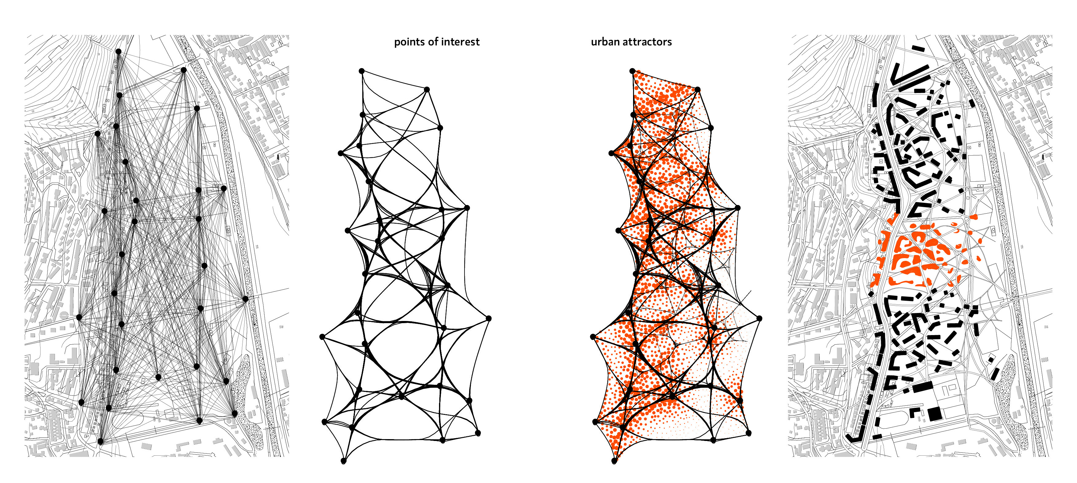 Základným prvkom urbanizácie je komunikačná sieť umožnujúca pohyb chodcov, tovaru, služieb, dopravných prostriedkov a mestskej infraštruktúry. Urbánna sieť by mala opäť násť svoje miesto v širšom fraktále transportných sýstémov a proprčne zapadnúť medzi regionálnu dopravnú sieť a dispozičné komunikácie budov. Architekt Otto Frei testoval rôzne urbanizačné vzory na základe geometrických príkladov v prírode. Jedna z nich je štruktúra, ktorá "hľadá" minimálne cesty medzi viacerými bodmi naraz. Cestná komunikácia poslúži na výmeny a presuny ľudí a tovarov medzi susedstvami, mestami. Nadaľej bude pôsobiť ako atraktor urbanizácie, čo sa prejavuje plošne a podlažne. Maximálna podlažnosť spočíva v tendencii prinavrácania merítka miest ktoré boli navrhované podĺa modulu človek. Jan Gehl a iní presadzujú maximálne 4 podlažia, pretože ľudia vo vyšších budovách už strácajú kontakt s okolitým prostredím. Do max. piatich podlaží dokážeme komunikovať s ľudmi, ktorí su na zemi vizuálne a akusticky.