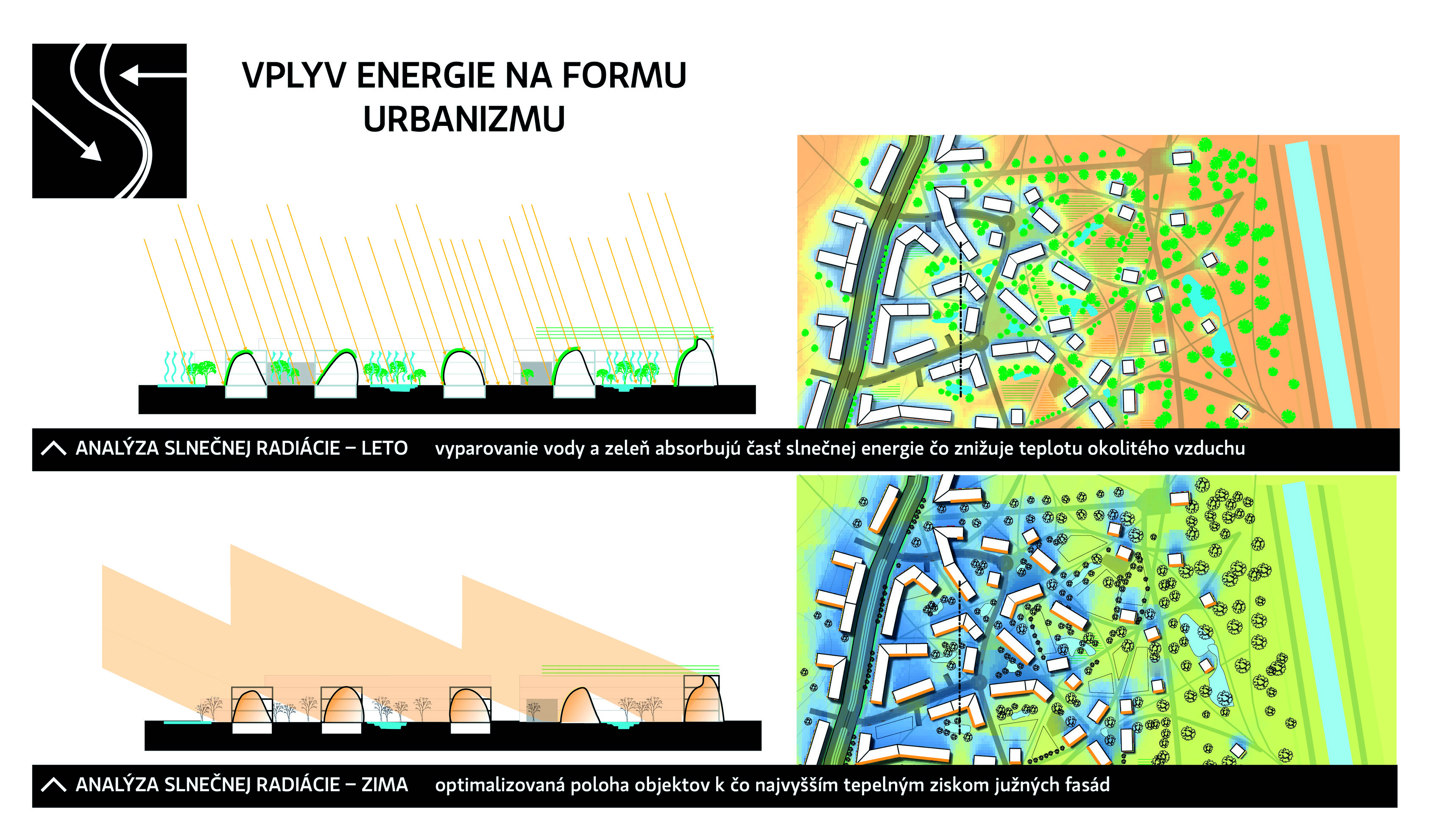 Na simulácii ja zoskupenie hmôt automaticky navrhnuté tak, aby si vzájomne nezakrývali potenciálne radiačné zisky.Situácia kedy podmienky sú identické no výstupy so rozdielne naznačuje nutný mini-evolučný proces pokusov a omylov o nájdenie toho najlepšieho riešenia. Vplyv na rozmiestnenie a polohu urbanistických prvkov majú potenciál dotvárať dalšie a dalšie faktory ako napríklad urbanistický hluk, prirodzené bio polia a pôsobiace elektormagnetické polia spôsobené vysokým napätím. Stojí pred nami celý vesmír situácií a ich možných riešení, alebo inak, akcií a reakcií.