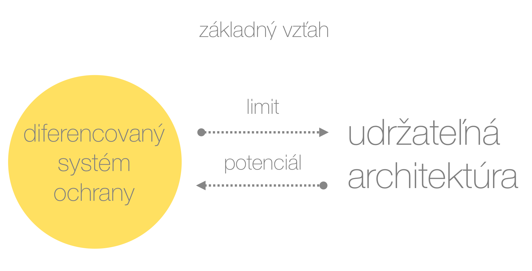 V prípade, že chceme hľadať pravdivé odpovede na otázky udržateľných vstupov do historického prostredia je nevyhnutné definovať a naplniť premennými vzťah medzi obnovou pamiatok (OP) a udržateľnou architektúrou (UA) (obr. 30). Pri tomto vzťahu vždy platí, že zachovanie autenticity originálu je vždy dominantné. To tvorí prvý výrazný limit pre udržateľné vstupy, ktoré sú zdrojom inovácie pre chránené objekty. Na tento vzťah sa pozeráme z roviny kvalitatívnej a kvantitatívnej.