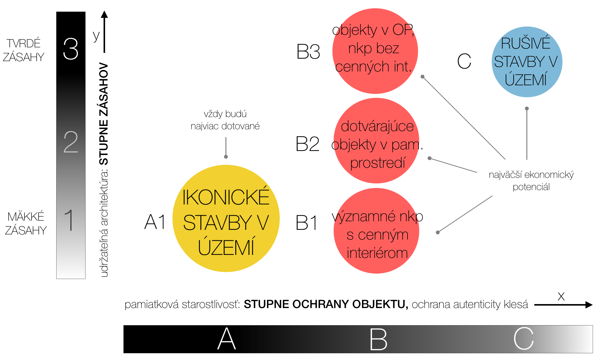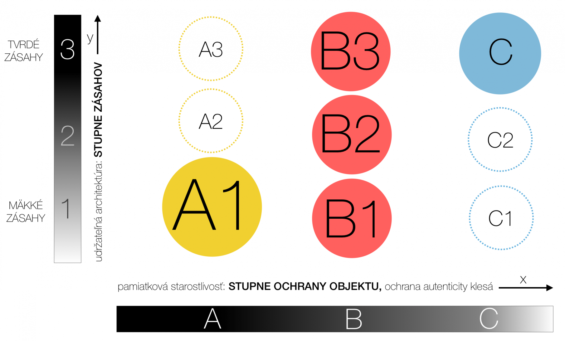 sme vo všeobecnej rovine nahradili konkrétnymi nástrojmi: DIFERENCOVANÝ SYSTÉM OCHRANY (používaný na Slovensku) verzus rôzna MIERA NOVÝCH UDRŽATEĽNÝCH ZÁSAHOV do chráneného prostredia, ktorú sme nahradili trojstupňovou škálou týchto intervencií. Diferencovaný systém ochrany rozdeľuje objekty s kultúrno-historickou hodnotou do ôsmich kategórií. Pre zjednodušenie práce sme tieto kategórie zredukovali do nasledujúcich skupín: A, B (podskupiny B1, B2, B3) a C. Podobne sme pristúpili aj ku množine udržateľných zásahov, ktoré sme rozdelili do škály na tzv. “mäkké”, “optimálne” a “tvrdé” zásahy. Vytvorenie týchto troch skupín implementácií bolo podmienené analýzou zahraničných príkladov, do ktorých boli vkladané inovácie s rôznou mierou vplyvu na autenticitu originálu. Pri definovaní jednotlivých atribútov, ktoré budú následne kombinované si dovolíme ilustrovať tieto kategórie príkladmi realizácií zo zahraničia.