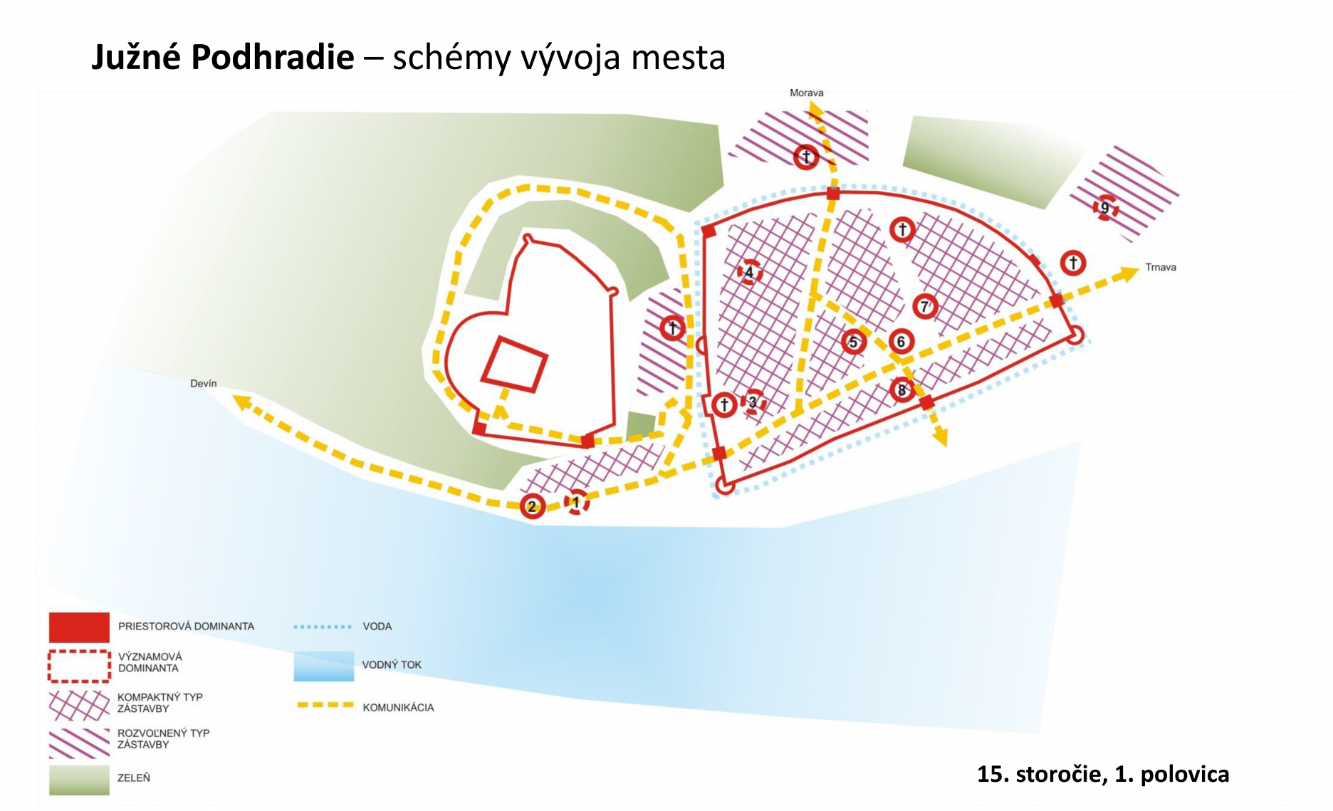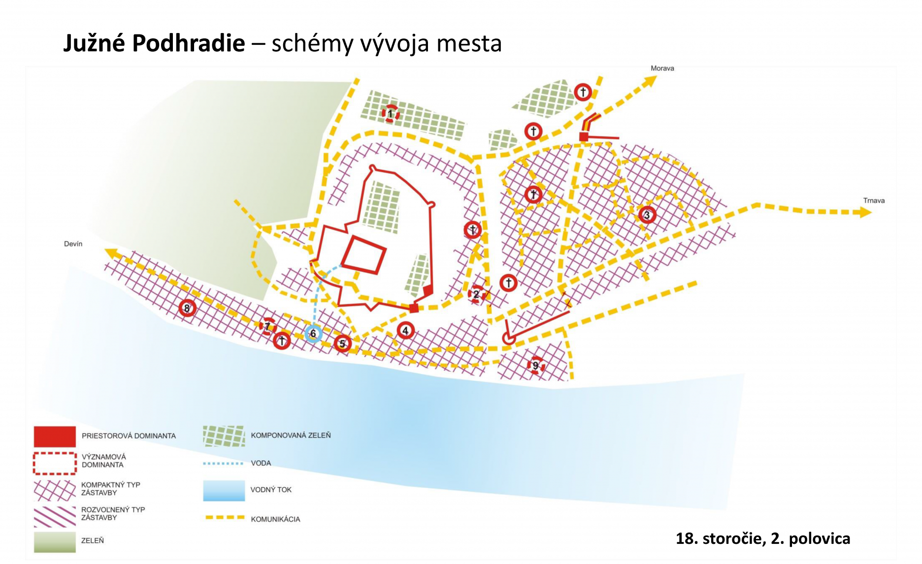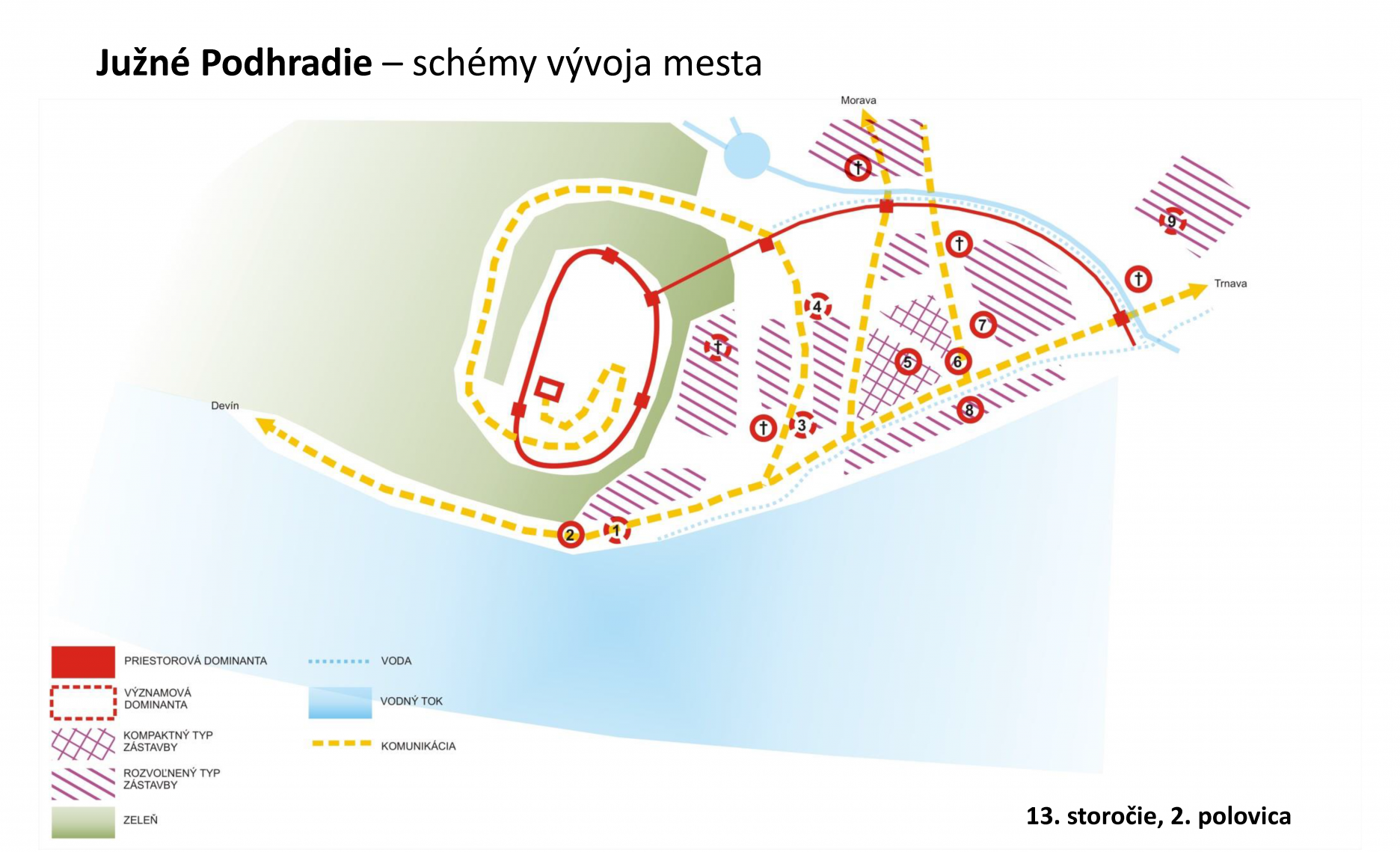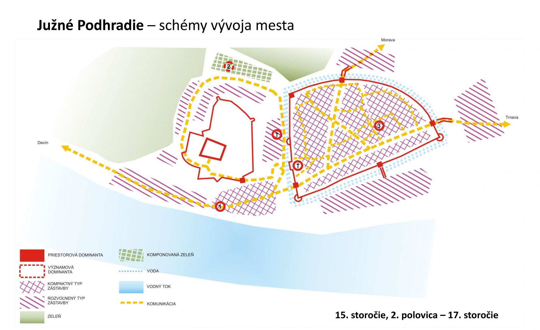 Pri hradisku na vrchu brala sa už začiatkom stredoveku začala formovať sídelná štruktúra využívajúca rovinný terén východne od horského masívu. V začiatočnom štádiu využívala inundačné územie Dunaja na svoju ochranu a opevnenie budovala iba v severovýchodnom oblúku v priamej nadväznosti na hrad. Neskôr koncom stredoveku sa vybudovaním hradieb po celom obvode mesto od hradu oddelilo. Na území medzi sídlom a hradom sa postupne vytvárali nove osady, neskôr mestské štvrte. V období baroka sa mesto rozrástlo o koncipované areály šľachtických sídiel so záhradami a cintorínmi a vytvára sa aj zárodok priemyselných enkláv, ktoré sa naplno rozvinuli v druhej polovici 19. a prvej polovici 20. storočia. Vznik výrobných zón sa v prvom štádiu viazal no vodný tok riečky Vydrica, kde sa začínalo rozvíjať najmä mlynárstvo. Neskôr sa industriálne zóny začínajú koncentrovať v blízkosti novovznikajúcej komunikačnej siete. Najväčší rozmach prišiel až s cieleným budovaním železničnej trate a postavením Starého mosta koncom storočia. Vytvoril sa tak prstenec závodov, nových mestských štvrtí východne od pôvodného jadra mesta. Jednou z významných lokalít sa stala oblasť medzi Zimným prístavom a Starým mostom (vtedy mostom Františka Jozefa 1.), kde podniky ťažili zo strategickej polohy pri Dunaji. Tu vyrástlo Kablo, Klingerova továreň, rafinéria Apollo, Mestská elektráreň a mnohé iné.