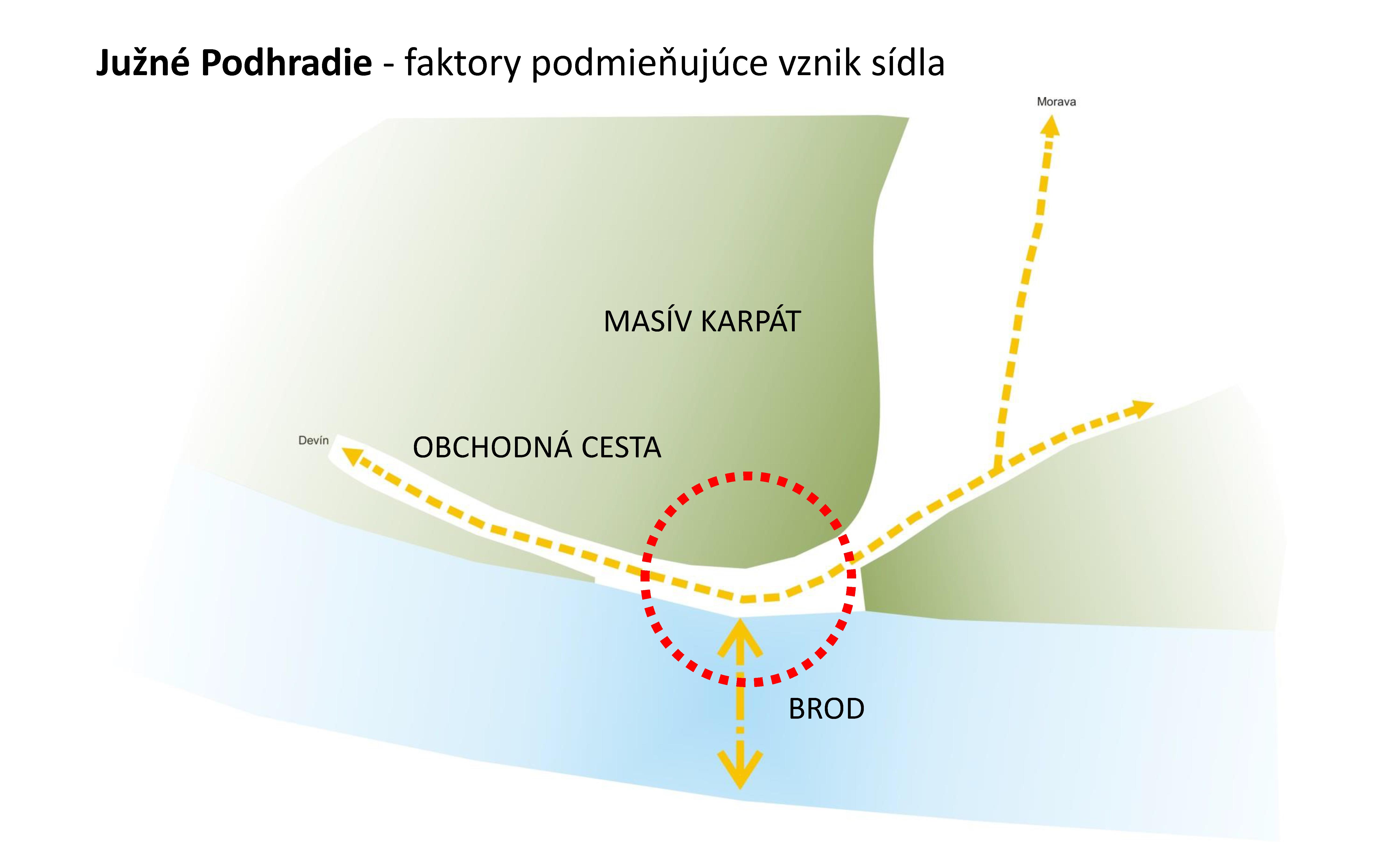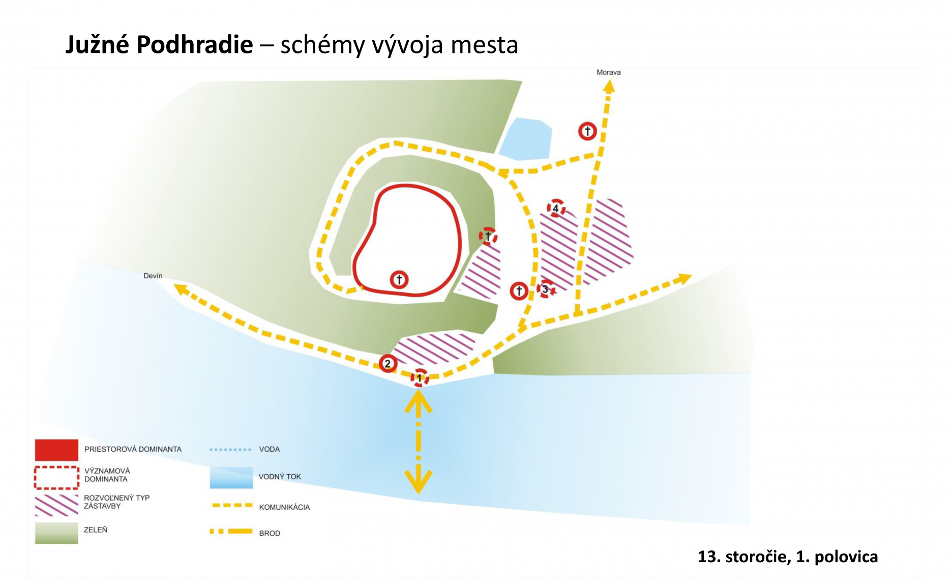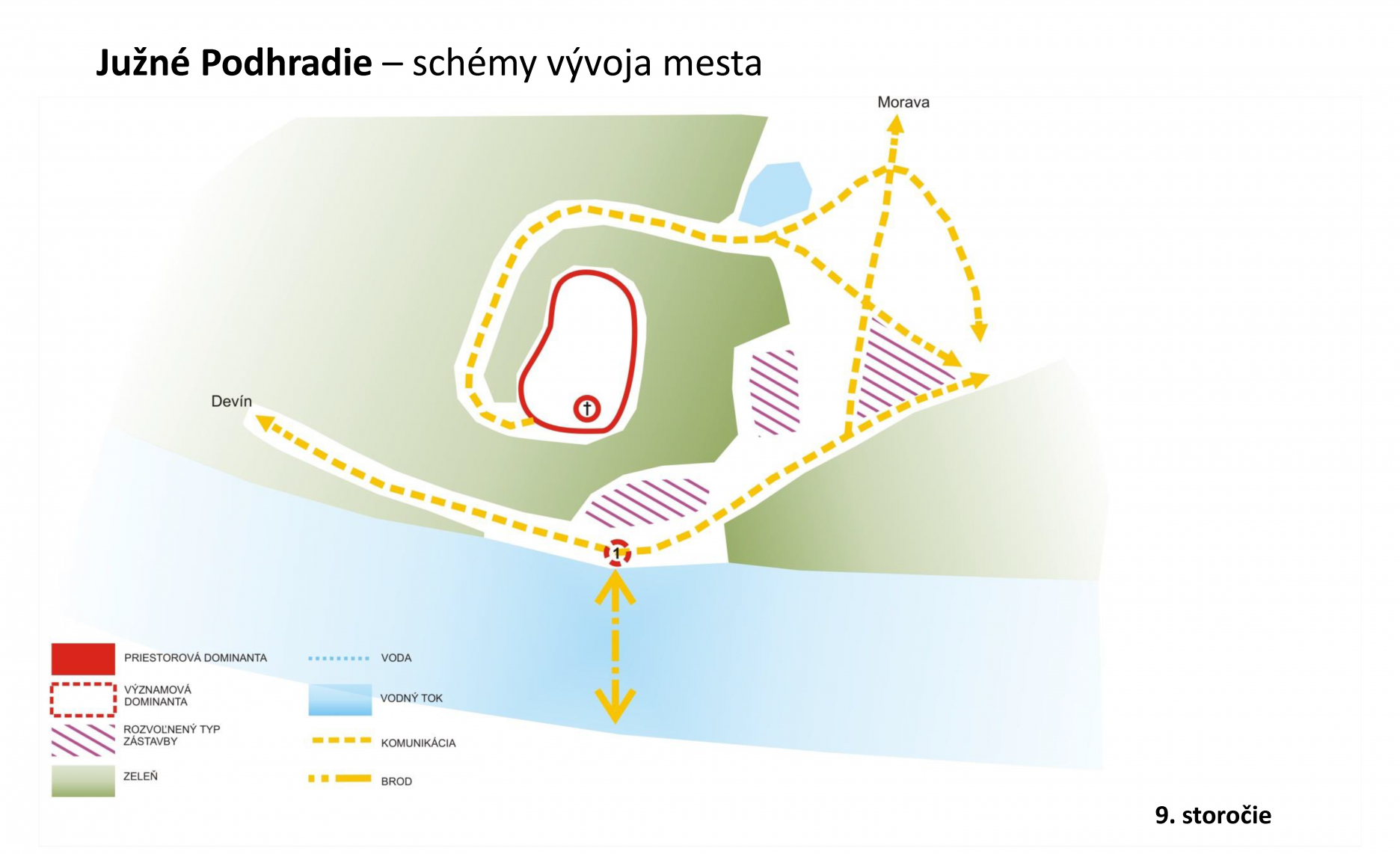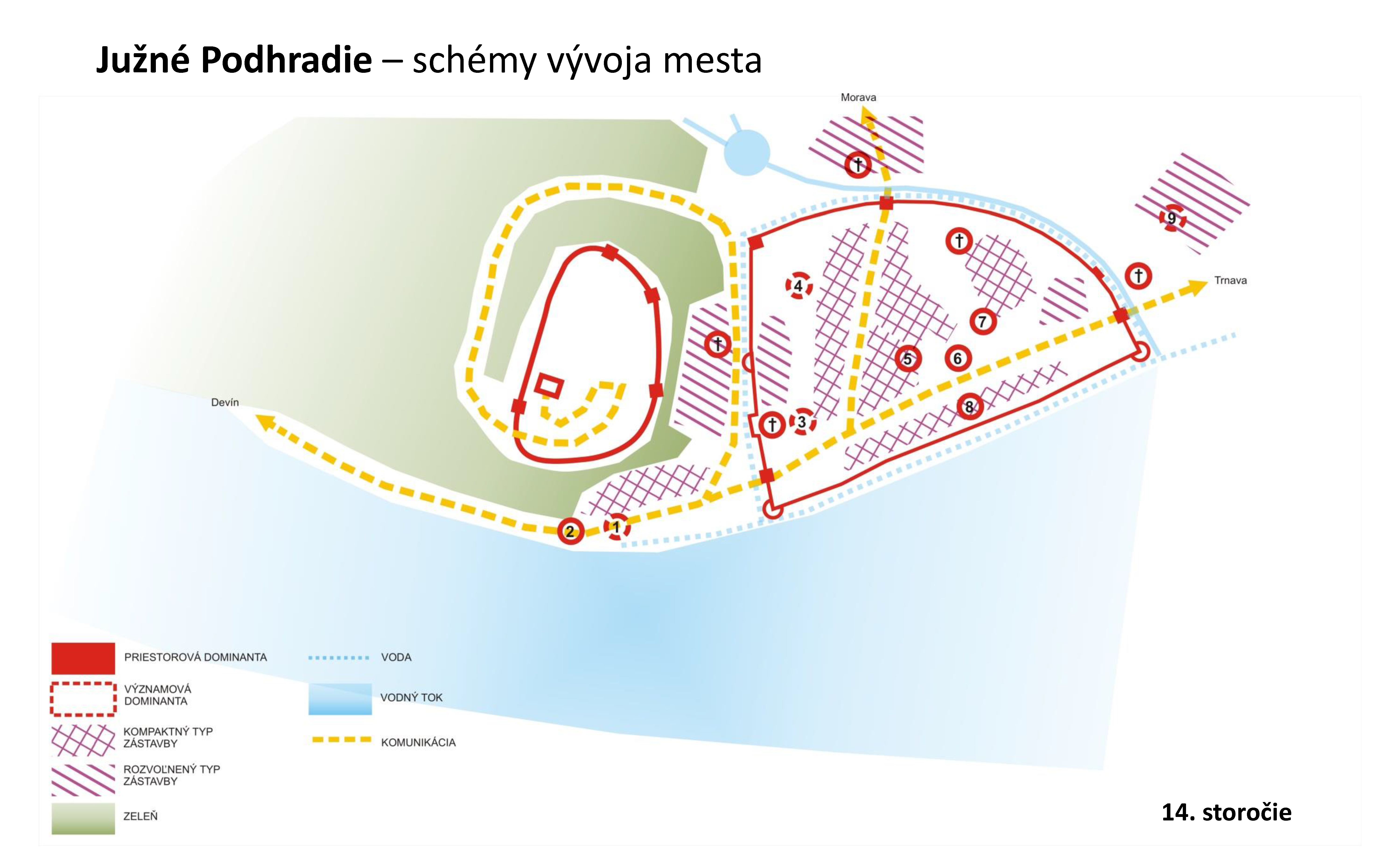 Pri hradisku na vrchu brala sa už začiatkom stredoveku začala formovať sídelná štruktúra využívajúca rovinný terén východne od horského masívu. V začiatočnom štádiu využívala inundačné územie Dunaja na svoju ochranu a opevnenie budovala iba v severovýchodnom oblúku v priamej nadväznosti na hrad. Neskôr koncom stredoveku sa vybudovaním hradieb po celom obvode mesto od hradu oddelilo. Na území medzi sídlom a hradom sa postupne vytvárali nove osady, neskôr mestské štvrte. V období baroka sa mesto rozrástlo o koncipované areály šľachtických sídiel so záhradami a cintorínmi a vytvára sa aj zárodok priemyselných enkláv, ktoré sa naplno rozvinuli v druhej polovici 19. a prvej polovici 20. storočia. Vznik výrobných zón sa v prvom štádiu viazal no vodný tok riečky Vydrica, kde sa začínalo rozvíjať najmä mlynárstvo. Neskôr sa industriálne zóny začínajú koncentrovať v blízkosti novovznikajúcej komunikačnej siete. Najväčší rozmach prišiel až s cieleným budovaním železničnej trate a postavením Starého mosta koncom storočia. Vytvoril sa tak prstenec závodov, nových mestských štvrtí východne od pôvodného jadra mesta. Jednou z významných lokalít sa stala oblasť medzi Zimným prístavom a Starým mostom (vtedy mostom Františka Jozefa 1.), kde podniky ťažili zo strategickej polohy pri Dunaji. Tu vyrástlo Kablo, Klingerova továreň, rafinéria Apollo, Mestská elektráreň a mnohé iné.