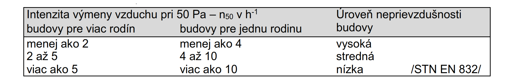 Požadovaná celková neprievzdušnosť obálky budovy (prípadne jej časti) je daná normou STN EN 832. Vychádza z celkovej intenzity výmeny vzduchu za 1 hodinu pri tlakovom rozdiele 50 Pa. Tato intenzita výmeny vzduchu je označovaná ako n50. Normové hodnoty n50 sú rôzne v závislosti na spôsobu vetrania.