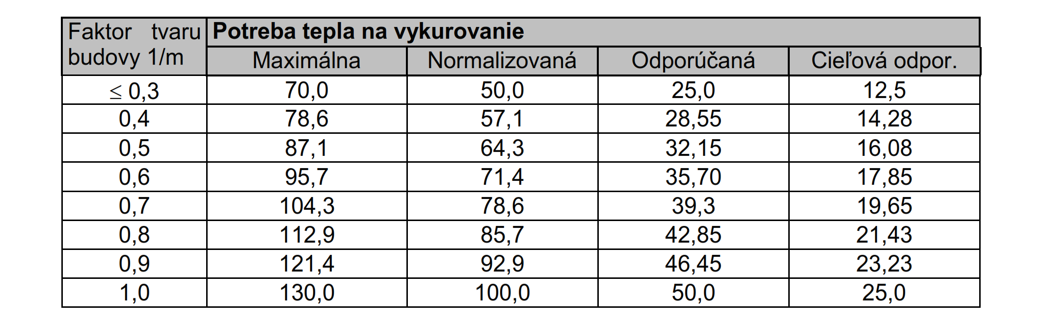 Potreba tepla na vykurovanie odráža trend sprísňovania tepelnotechnických požiadaviek na konštrukcie. Normalizovaná požadovaná hodnota by mala odpovedať nízkoenergetickému štandardu požadovanému od 1.1.2013. Odporúčaná hodnota by mala zodpovedať ultranízkoenergetickému štandardu požadovanému od 1.1.2016. Cieľová odporúčaná hodnota by mala zodpovedať TNB požadovaným od 1.1.2021 pre všetky budovy.