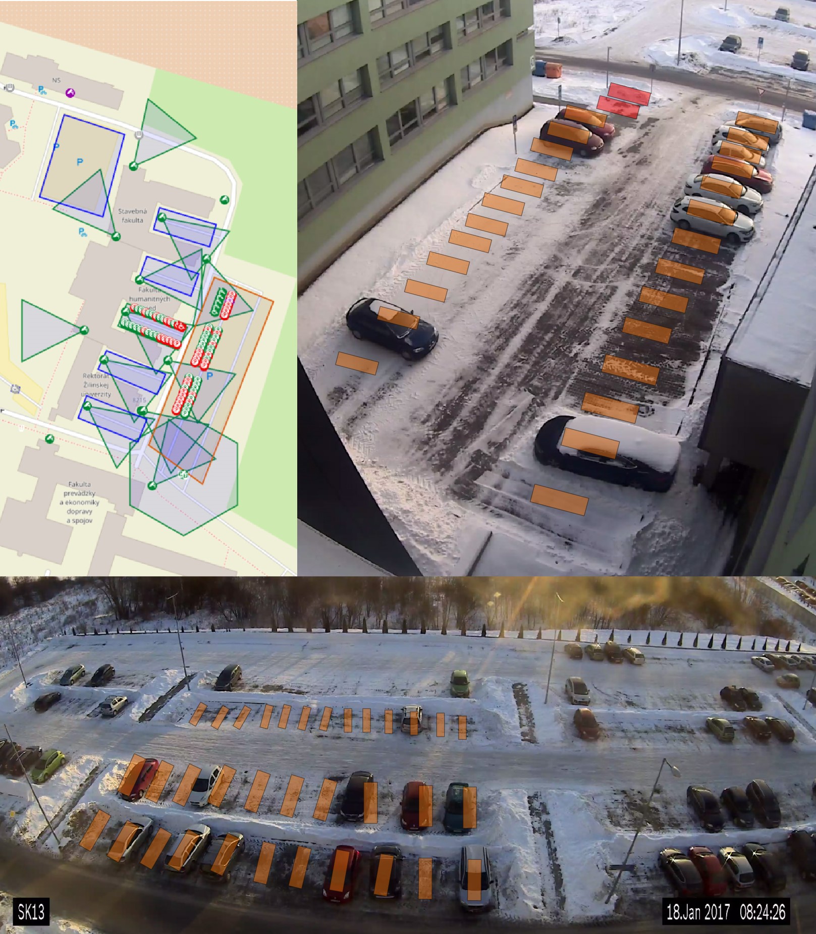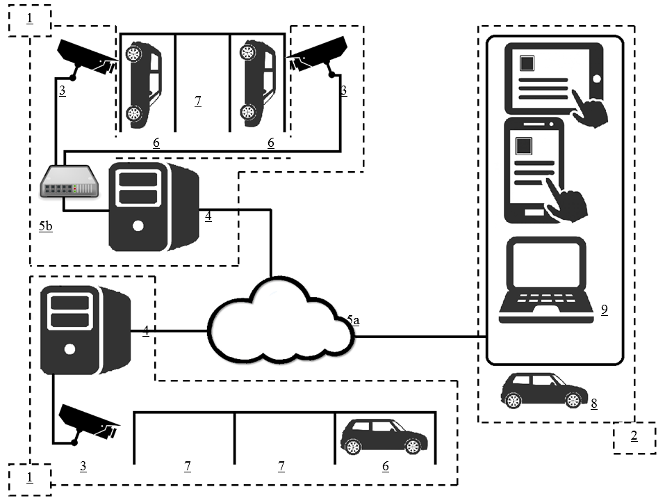 Automatizovaný systém na obrázku (časť 1) vychádza z koncepcie na základe schváleného úžitkového vzoru PUV 96-2015 "Automatizovaný systém monitorovania a stráženia dopravných prostriedkov na odstavných plochách“. Umožňuje monitorovať a strážiť dopravné prostriedky (časť 8) parkujúce na odstavných plochách (časť 6) a nachádzať voľné parkovacie miesta (časť 7)