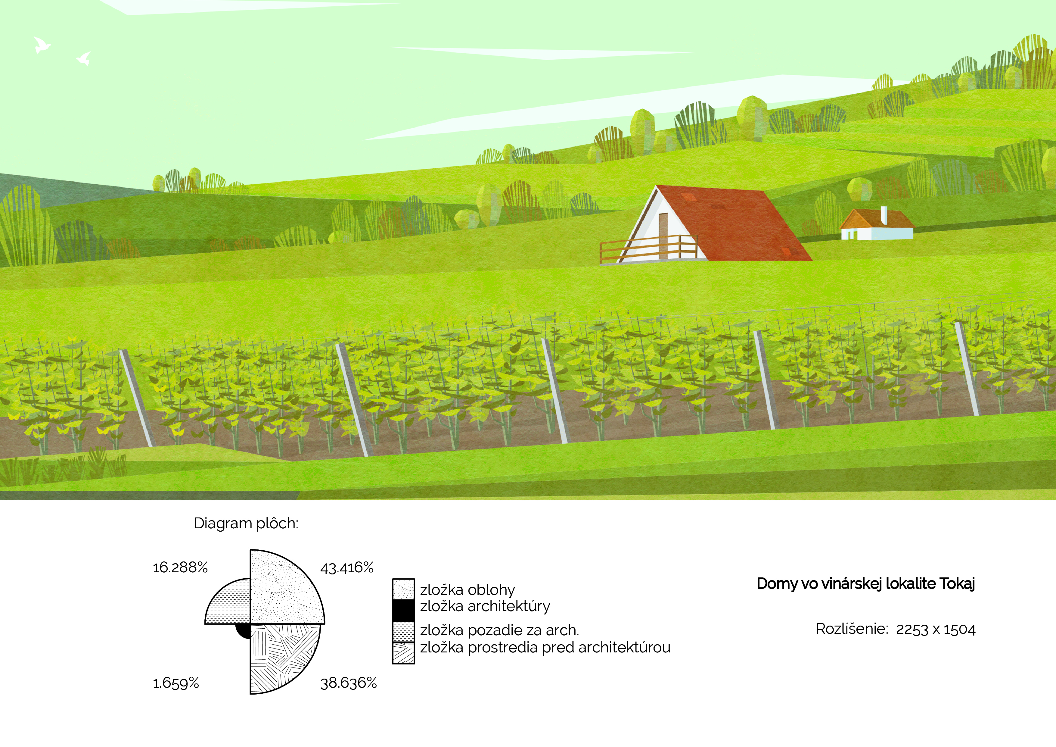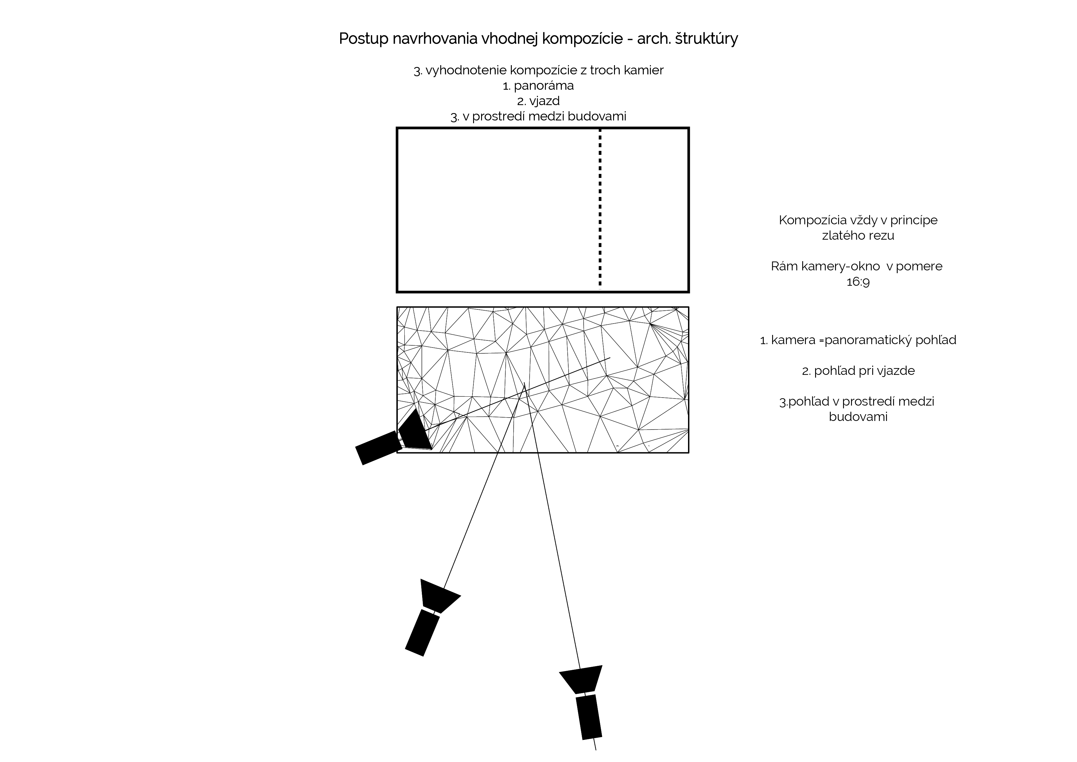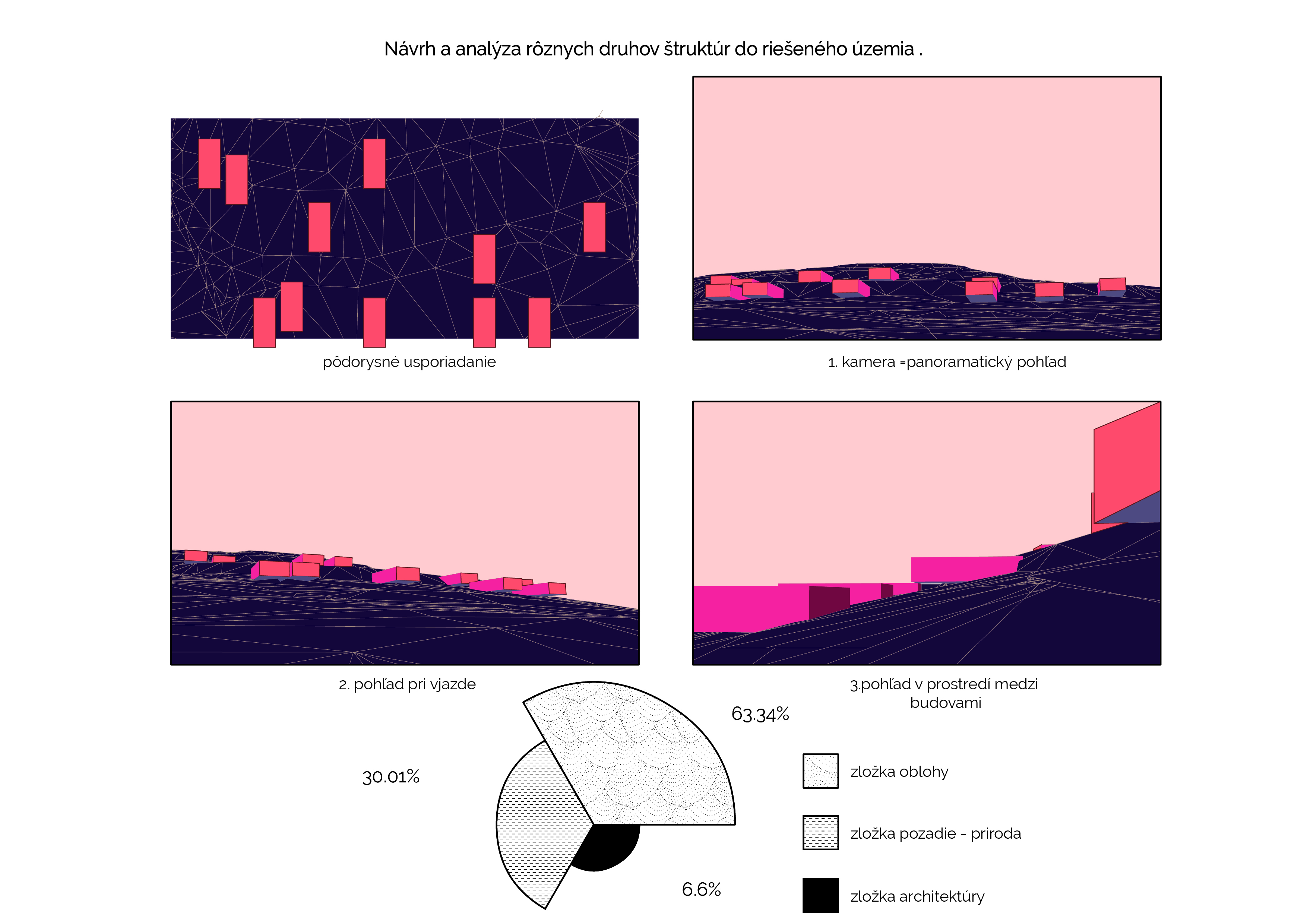 Prvá časť spracováva postup a genézu návrhu architektúry ako takej do krajiny (prostredia) Výskum je založený na definovaní pojmu krása a jeho definíciách, vnímaní a analýzach realizovaných projektov ich kompozícii na fotografi v samotnom prostredí. Vyhodnotením kompozície a plošných zložiek elementov (architektúra, prostredie pred objektom, prostredie za objektom, obloha) bolo cieľom získať a kvantifikovať postup ako by mala kompozične a objemovo architektúra obklopená prostredím (na zelenej lúke) vyzerať a pôsobiť. Výsledkom analýz je návrh rôznych štruktúr hmôt s rovnakým objemom, ktoré sú následne kompozične a plošne vyhodnotené v prostredí vždy z troch rovnakých bodov (panoramatický pohlaď, príjazdový pohlaď,bod v prostredí medzi hmotami) Všetky pohľady sú komponované, že pozorovaný objekt (centrum štruktúry) je kompozične osadené v princípe zlatého rezu v ráme, ktorý je v pomere 16:9. Z daných variant návrhov som vybral najvhodnejší, s ktorým som naďalej pracoval. Výsledná kompozícia pripomína cestu, ktorá dobre reflektuje morfológiu prostredia.