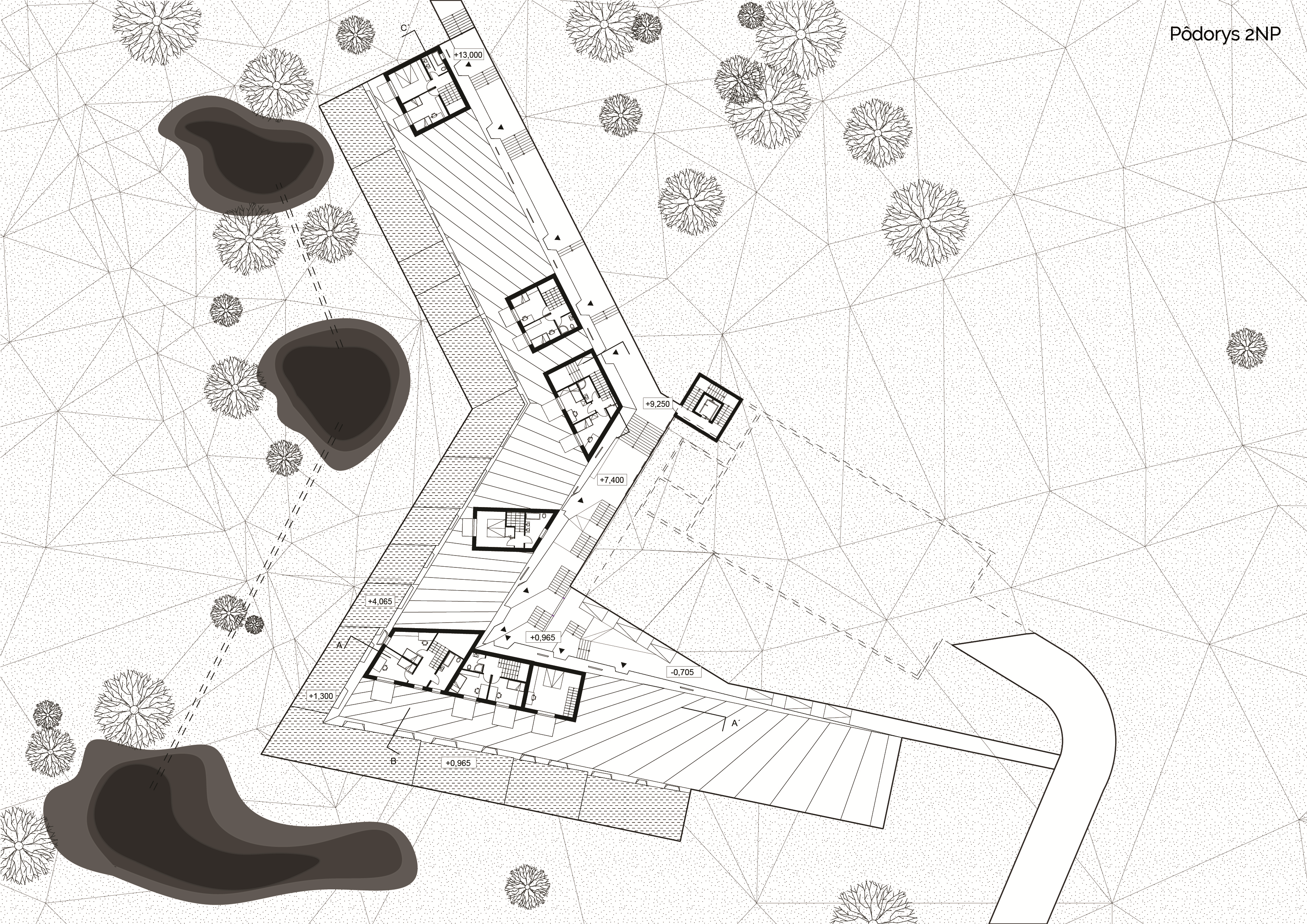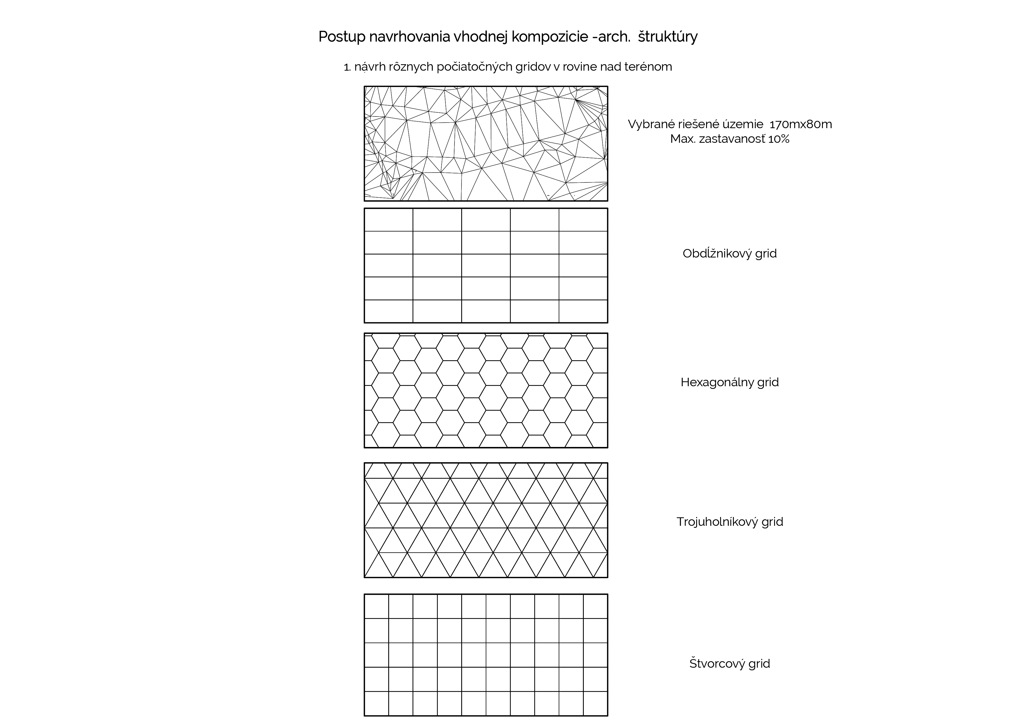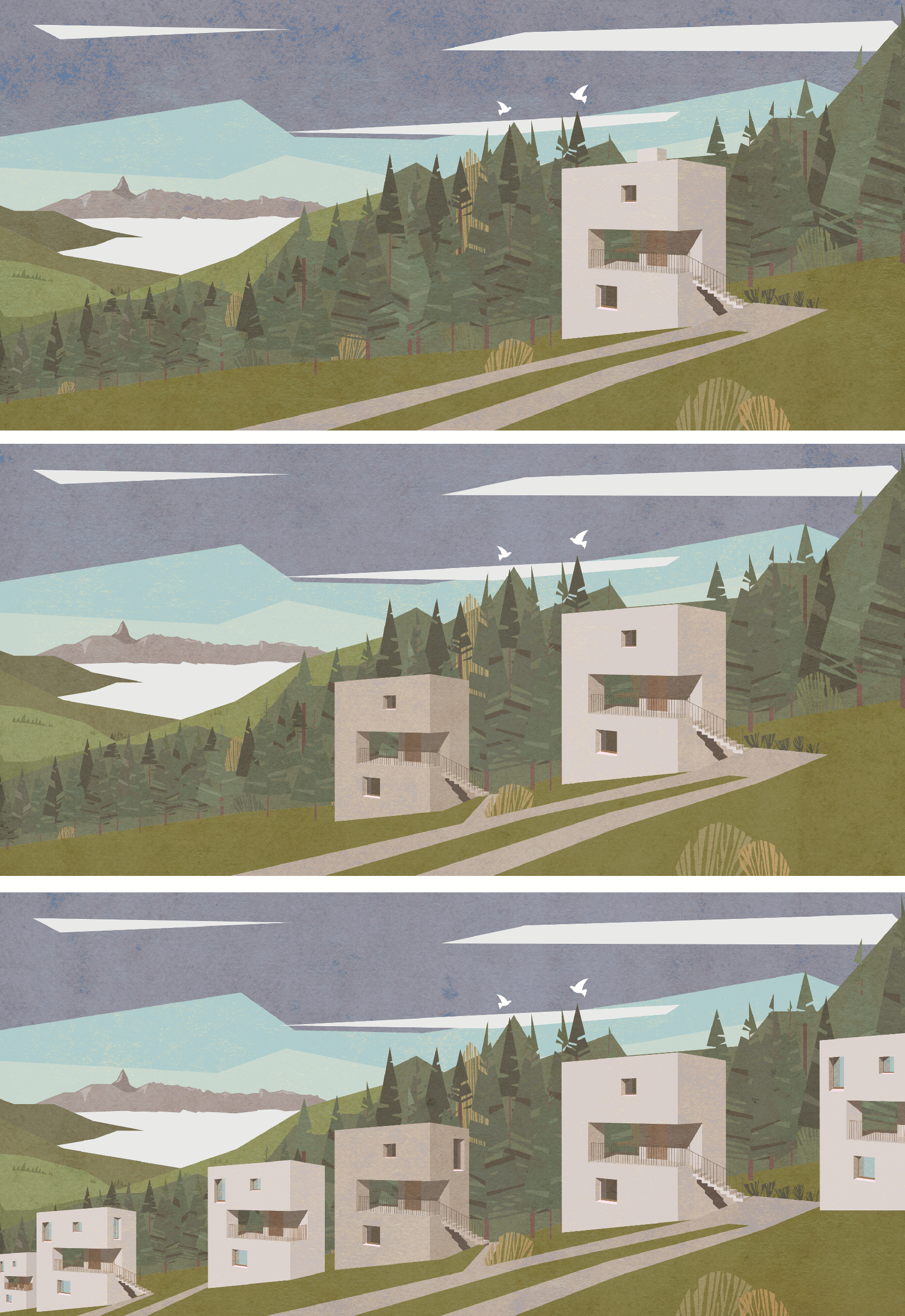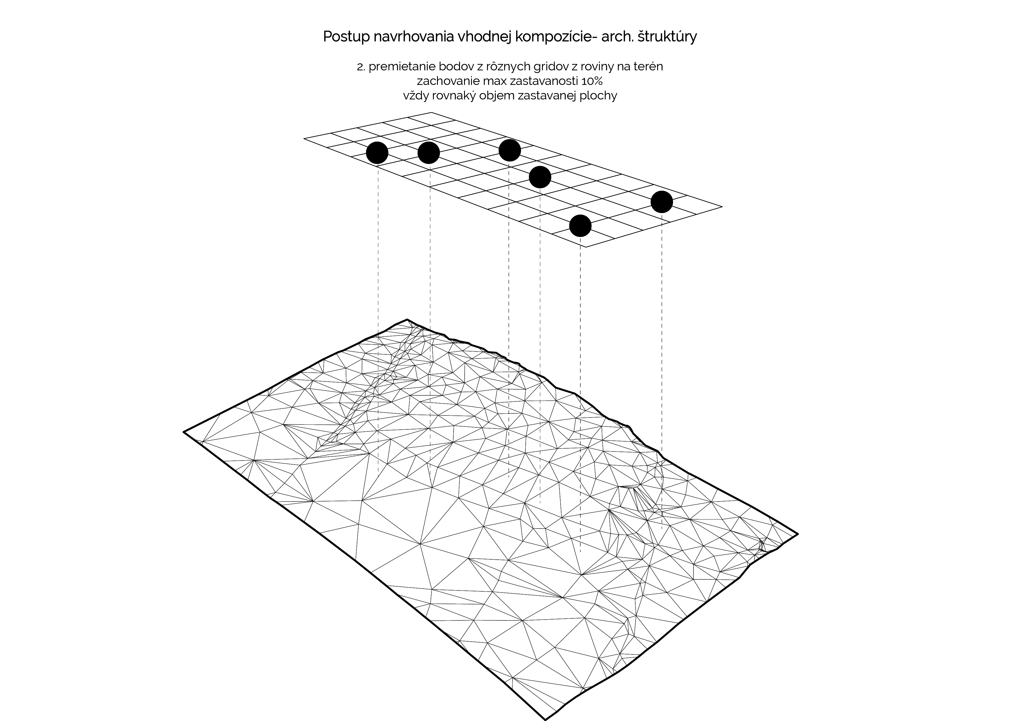 Prvá časť spracováva postup a genézu návrhu architektúry ako takej do krajiny (prostredia) Výskum je založený na definovaní pojmu krása a jeho definíciách, vnímaní a analýzach realizovaných projektov ich kompozícii na fotografi v samotnom prostredí. Vyhodnotením kompozície a plošných zložiek elementov (architektúra, prostredie pred objektom, prostredie za objektom, obloha) bolo cieľom získať a kvantifikovať postup ako by mala kompozične a objemovo architektúra obklopená prostredím (na zelenej lúke) vyzerať a pôsobiť. Výsledkom analýz je návrh rôznych štruktúr hmôt s rovnakým objemom, ktoré sú následne kompozične a plošne vyhodnotené v prostredí vždy z troch rovnakých bodov (panoramatický pohlaď, príjazdový pohlaď,bod v prostredí medzi hmotami) Všetky pohľady sú komponované, že pozorovaný objekt (centrum štruktúry) je kompozične osadené v princípe zlatého rezu v ráme, ktorý je v pomere 16:9. Z daných variant návrhov som vybral najvhodnejší, s ktorým som naďalej pracoval. Výsledná kompozícia pripomína cestu, ktorá dobre reflektuje morfológiu prostredia.
