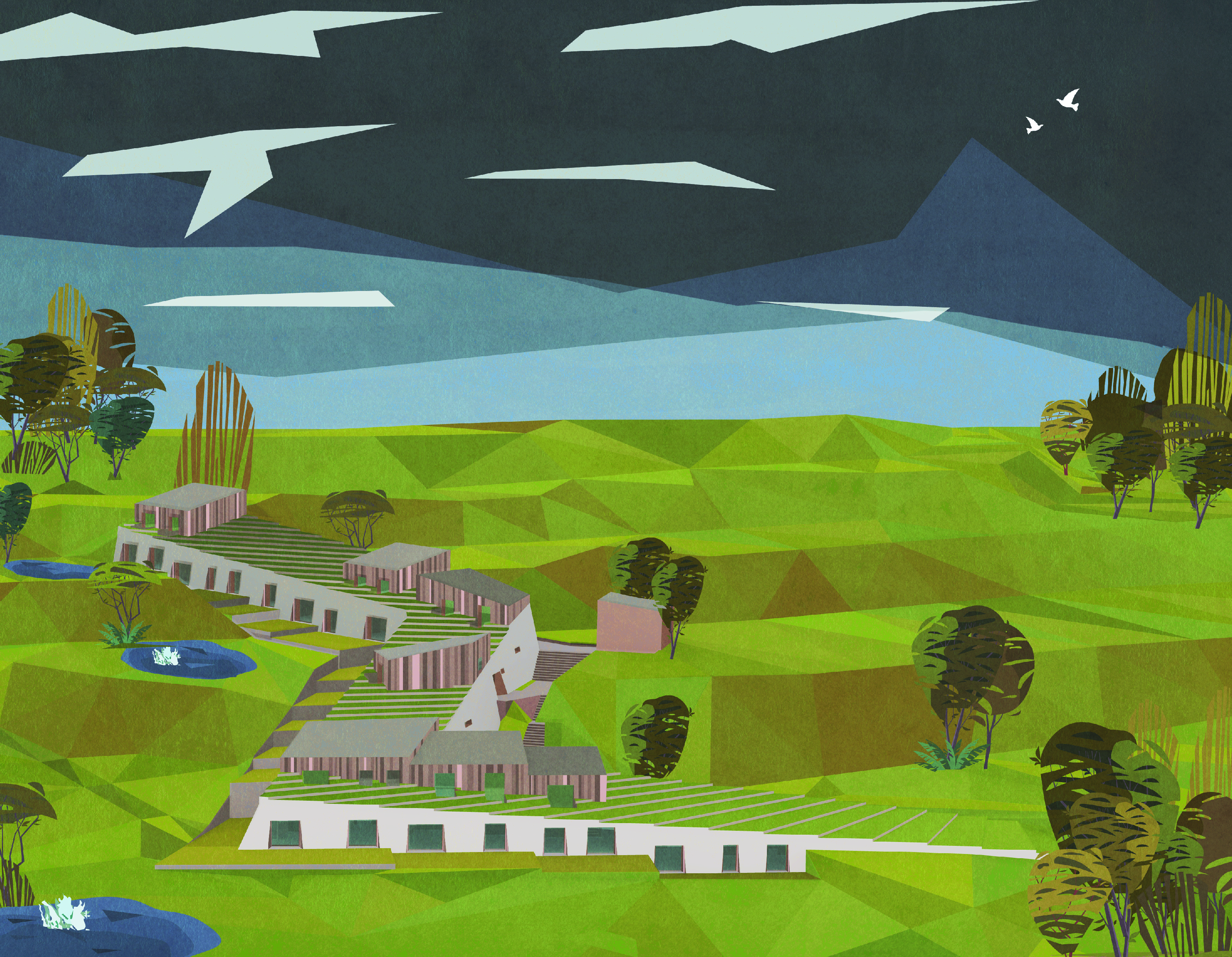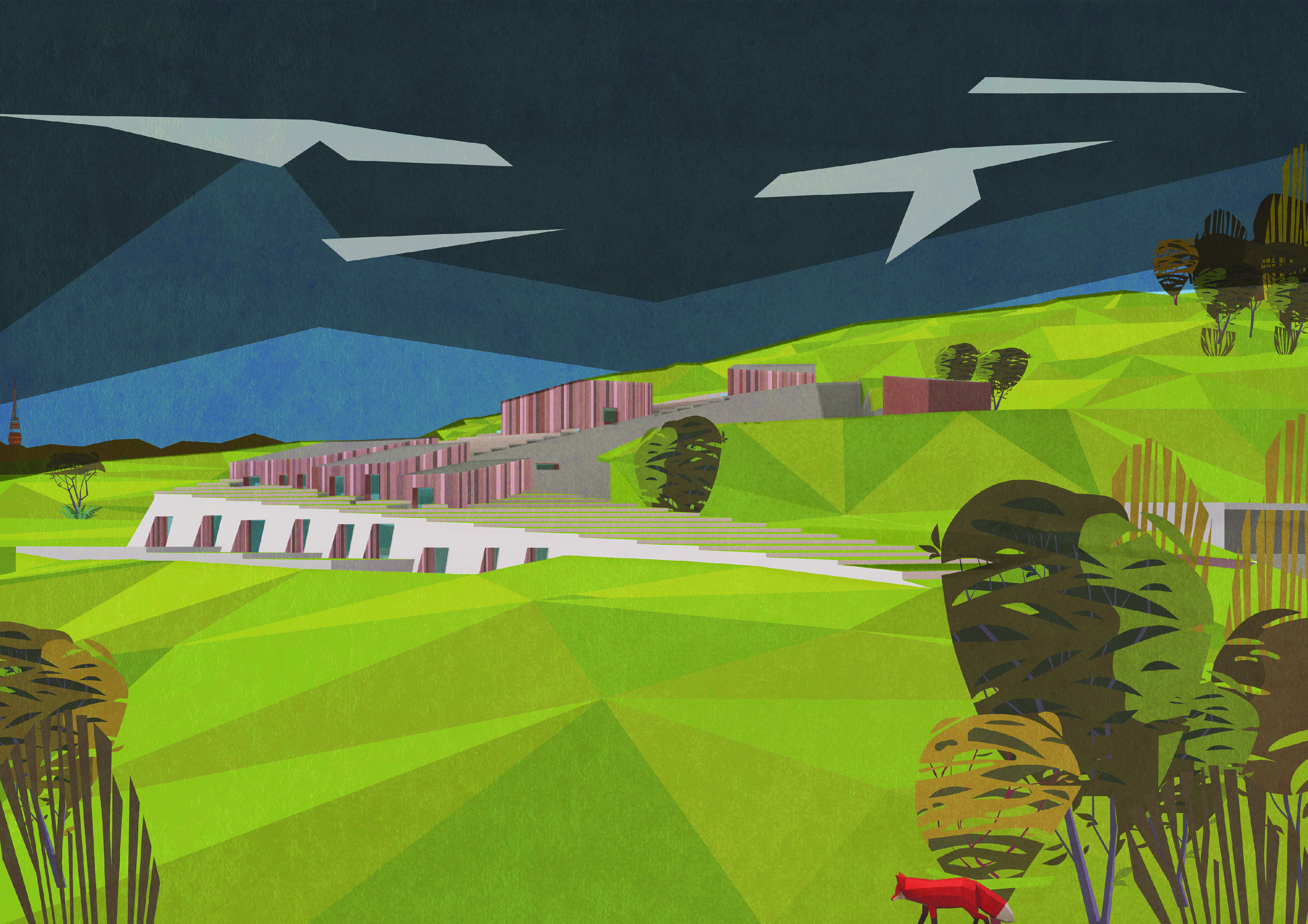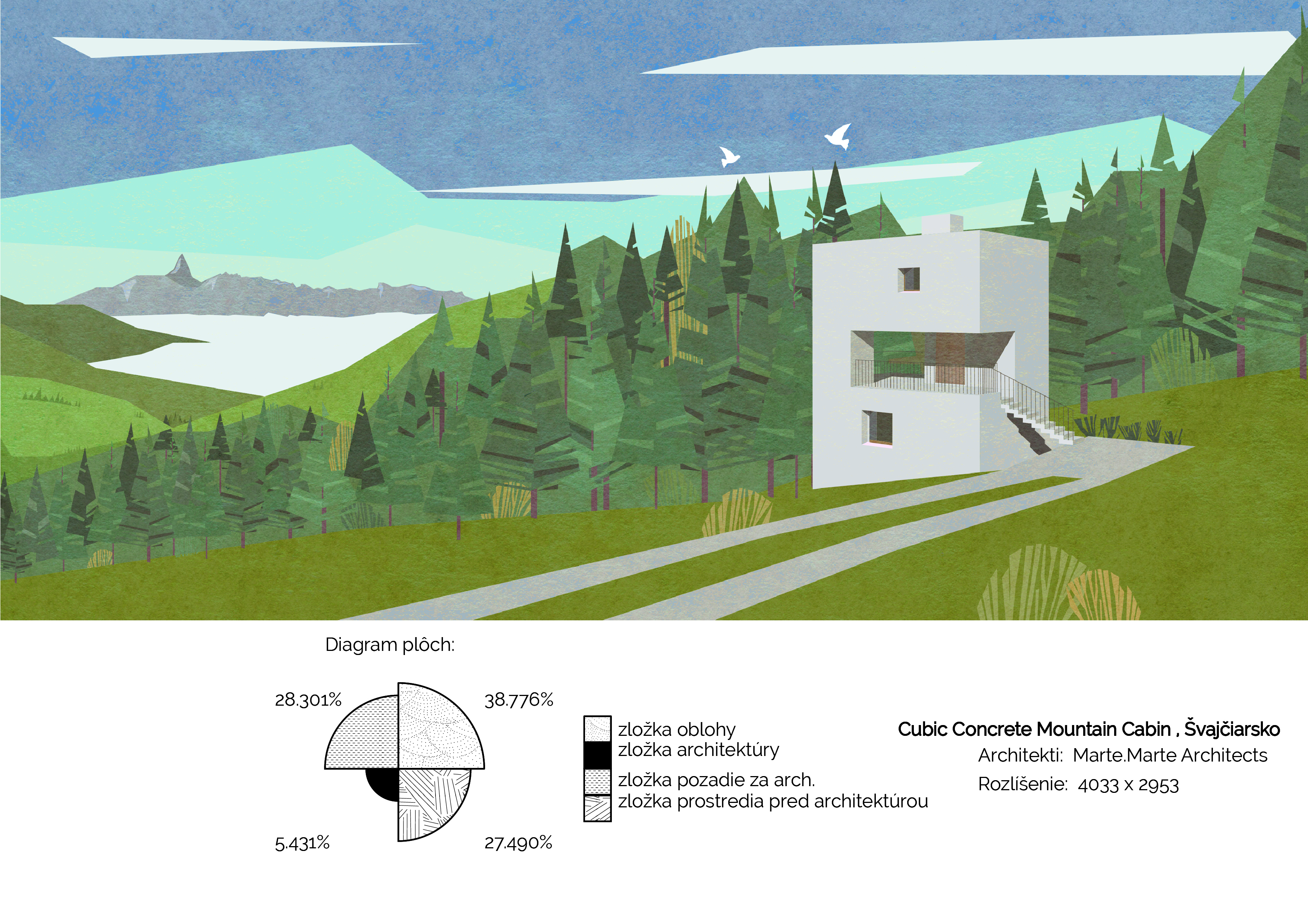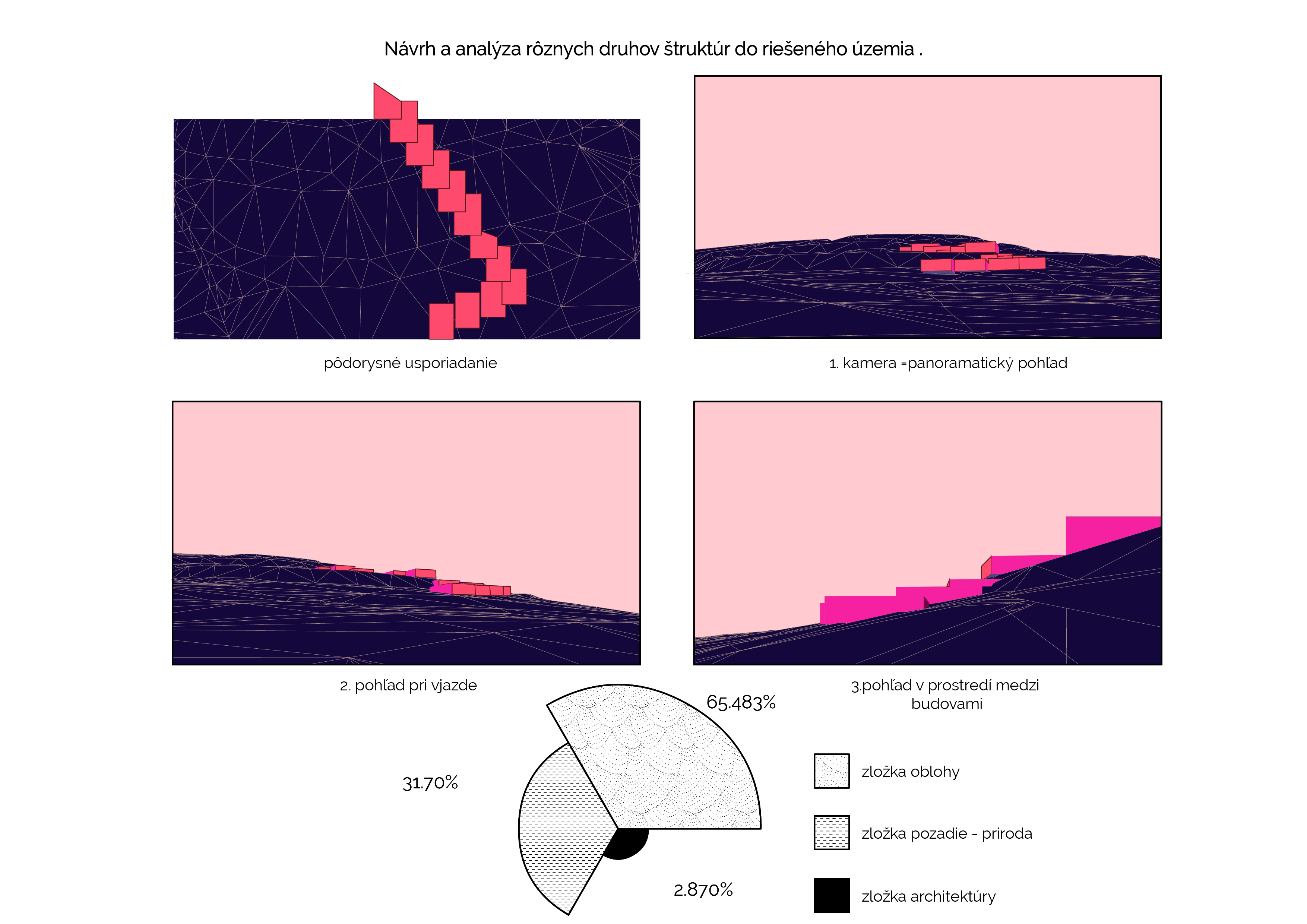 Prvá časť spracováva postup a genézu návrhu architektúry ako takej do krajiny (prostredia) Výskum je založený na definovaní pojmu krása a jeho definíciách, vnímaní a analýzach realizovaných projektov ich kompozícii na fotografi v samotnom prostredí. Vyhodnotením kompozície a plošných zložiek elementov (architektúra, prostredie pred objektom, prostredieza objektom,obloha) bolo cieľom získať a kvantifikovať postup ako by mala kompozične a objemovo architektúra obklopená prostredím (na zelenej lúke) vyzerať a pôsobiť. Výsledkom analýz je návrh rôznych štruktúr hmôt s rovnakým objemom, ktoré sú následne kompozične a plošne vyhodnotené v prostredí vždy z troch rovnakých bodov (panoramatický pohlaď, príjazdový pohlaď, bod v prostredí medzi hmotami) Všetky pohľady sú komponované, že pozorovaný objekt (centrum štruktúry) je kompozične osadené v princípe zlatého rezu v ráme, ktorý je v pomere 16:9. Z daných variant návrhov som vybral najvhodnejší, s ktorým som naďalej pracoval. Výsledná kompozícia pripomína cestu, ktorá dobre reflektuje morfológiu prostredia.