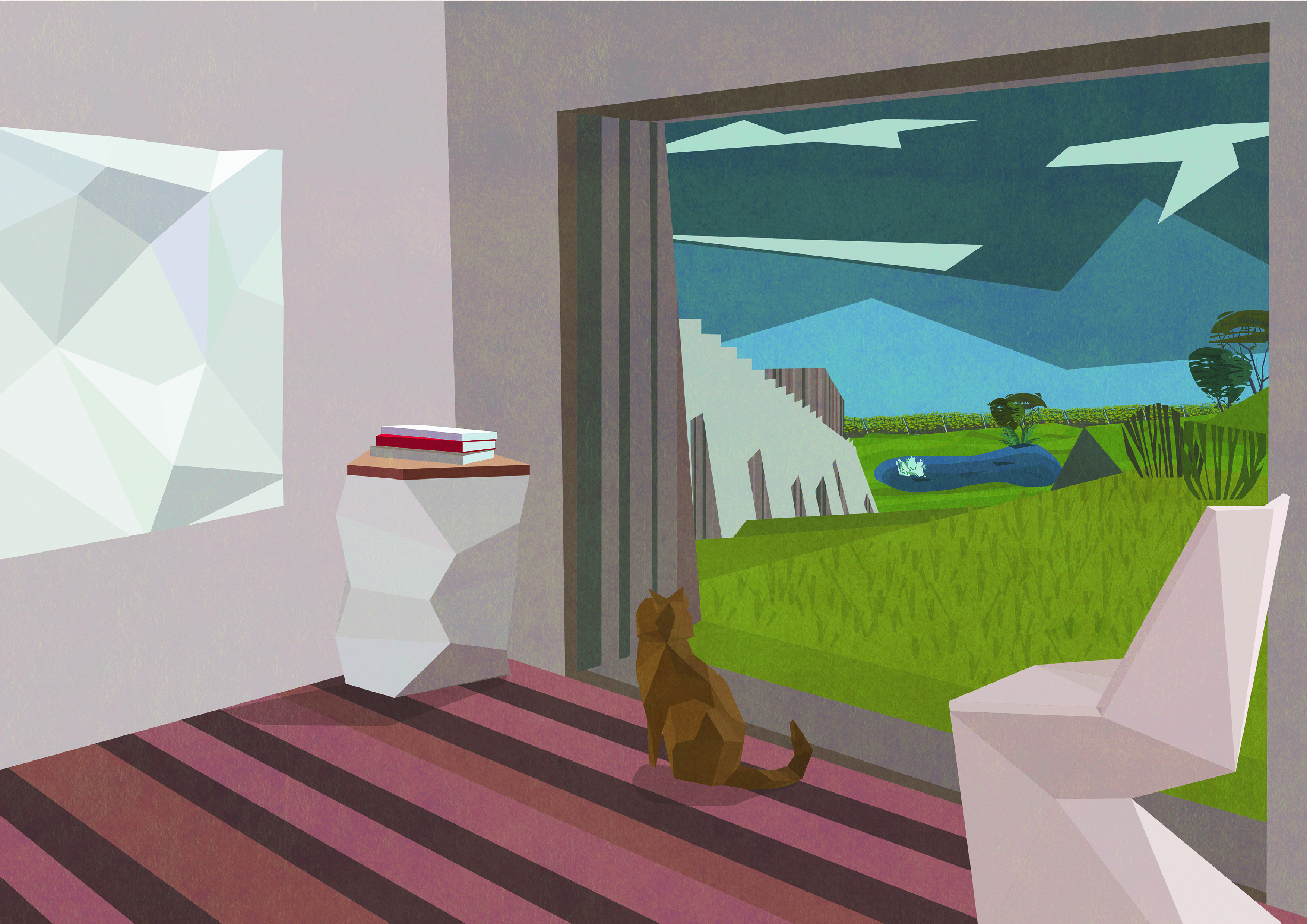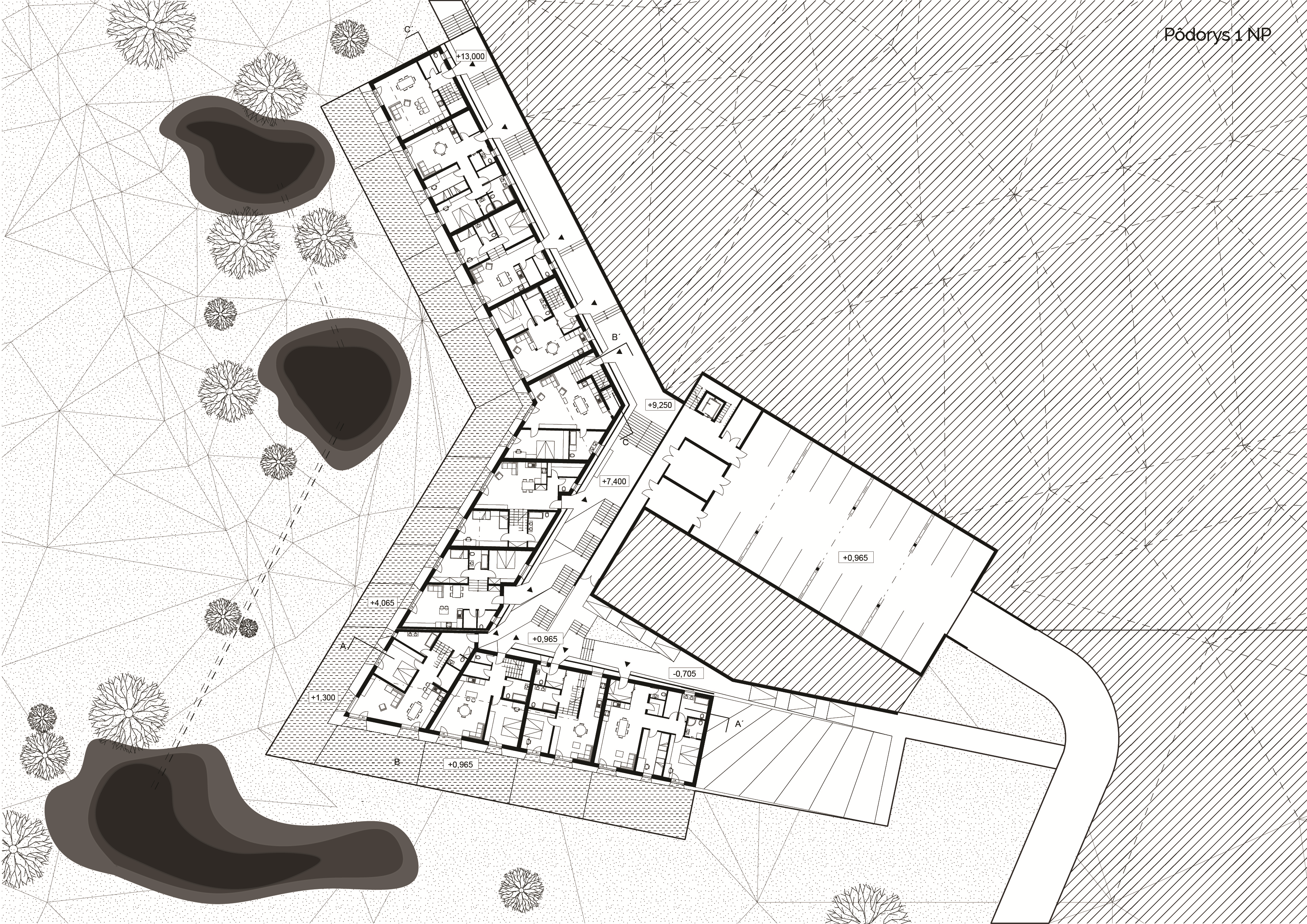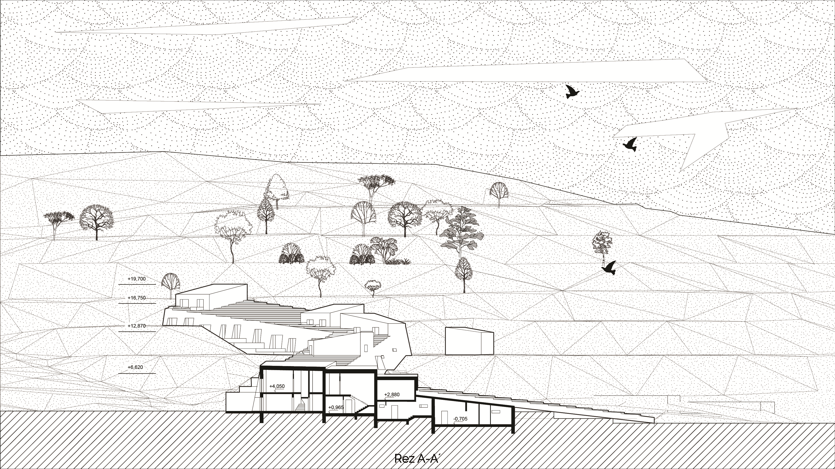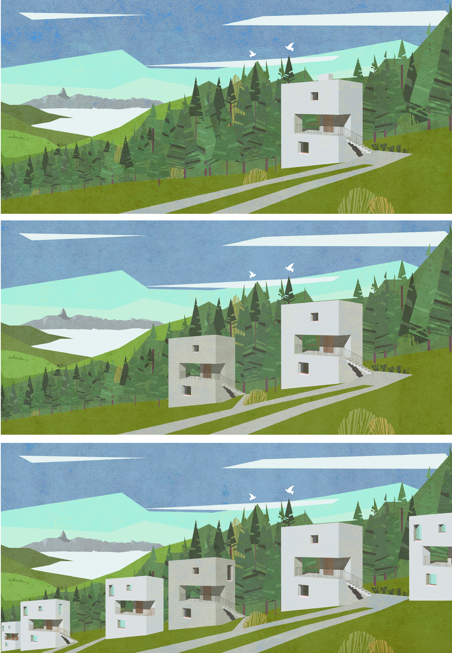 Prvá časť spracováva postup a genézu návrhu architektúry ako takej do krajiny (prostredia) Výskum je založený na definovaní pojmu krása a jeho definíciách, vnímaní a analýzach realizovaných projektov ich kompozícii na fotografi v samotnom prostredí. Vyhodnotením kompozície a plošných zložiek elementov (architektúra, prostredie pred objektom, prostredieza objektom,obloha) bolo cieľom získať a kvantifikovať postup ako by mala kompozične a objemovo architektúra obklopená prostredím (na zelenej lúke) vyzerať a pôsobiť. Výsledkom analýz je návrh rôznych štruktúr hmôt s rovnakým objemom, ktoré sú následne kompozične a plošne vyhodnotené v prostredí vždy z troch rovnakých bodov (panoramatický pohlaď, príjazdový pohlaď, bod v prostredí medzi hmotami) Všetky pohľady sú komponované, že pozorovaný objekt (centrum štruktúry) je kompozične osadené v princípe zlatého rezu v ráme, ktorý je v pomere 16:9. Z daných variant návrhov som vybral najvhodnejší, s ktorým som naďalej pracoval. Výsledná kompozícia pripomína cestu, ktorá dobre reflektuje morfológiu prostredia.