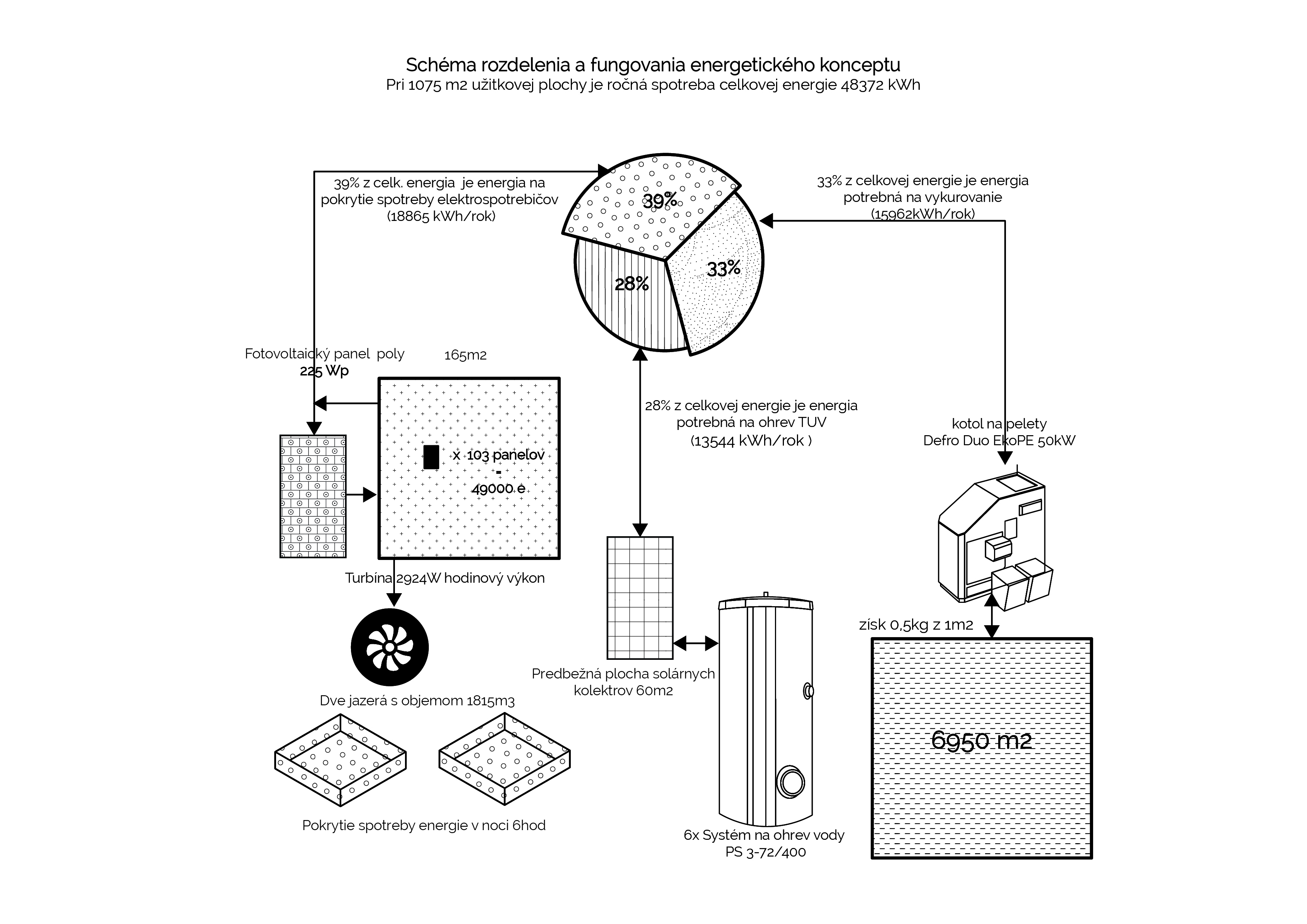 Druhá časť sa venuje problematike a spôsobom zásobovania objektu energiou potrebnou na prevádzku. Objekt je situovaný na základe výstupov z GIS máp v oblasti s najväčšími solárnymi ziskami 6201-6648 Wh/m2/deň. Táto slnečná energia by sa mala využiť na výrobu elektrickej energie a ohrev vody. Prírodné prostredie ma tiež tendenciu zadržiavať zrážkovú vodu a uchovávať ju ako zdroj živín a energie. Vzhľadom na morfológiu prostredia sa ponúkala možnosť využiť systém prečerpávacích elektrárni, ktoré sú využívané ako zdroj elektrickej energie v časoch keď nie je možne využiť slnečnú energiu. Tak isto recyklácia vody od samotných užívateľov bola zohľadnená ako zdroj vody. Tiež som sa zaoberal otázkou využitia ostrihaných častí vinohradu ako zdroj biomasy, ktorá by bola využívaná ako palivo pre kotol na vykurovanie. Všetky časti systému boli generované vďaka PC podpore na základe objemu hmoty, orientácie, počtu obyvateľov a energetického štandardu budovy.