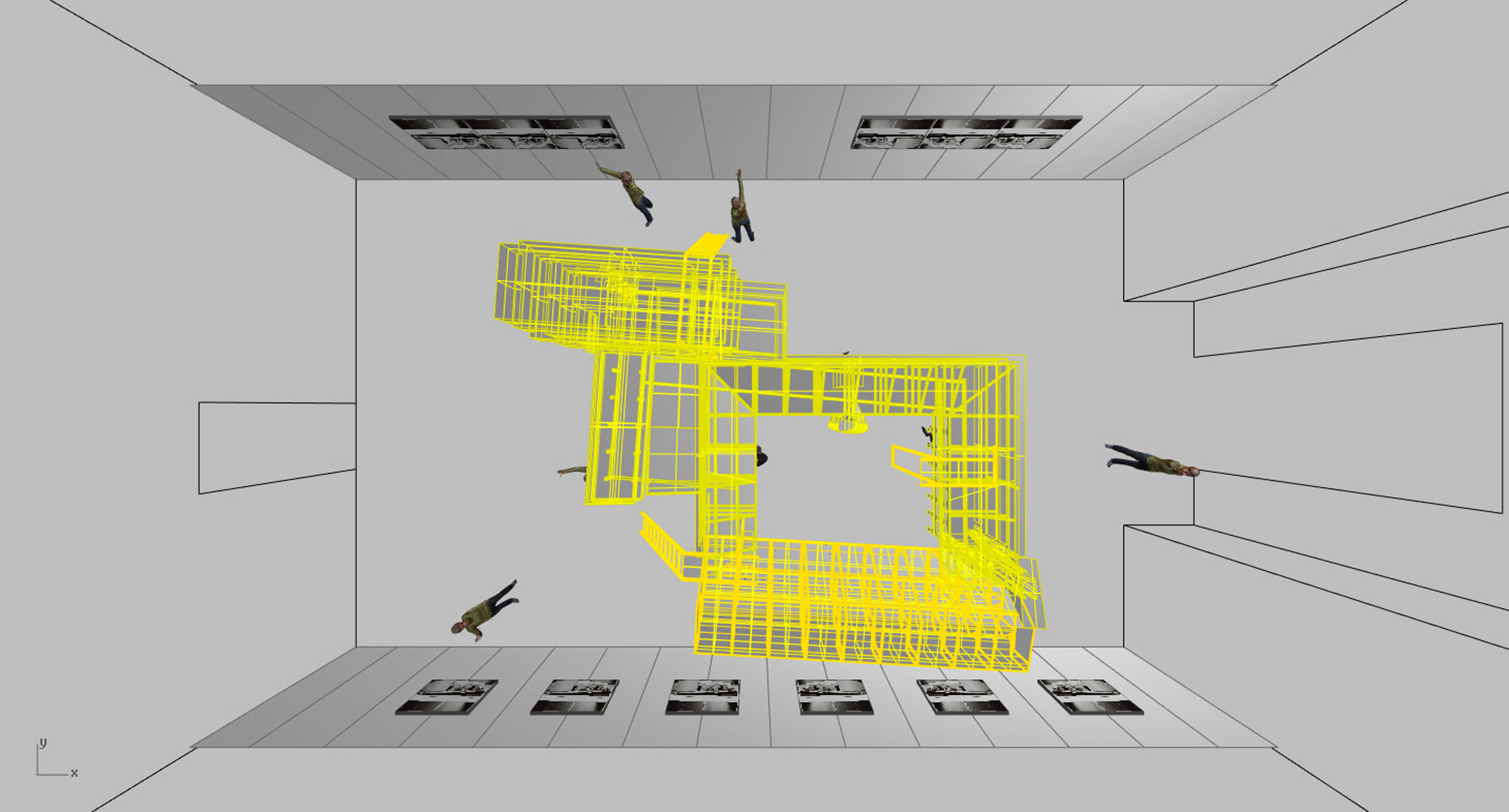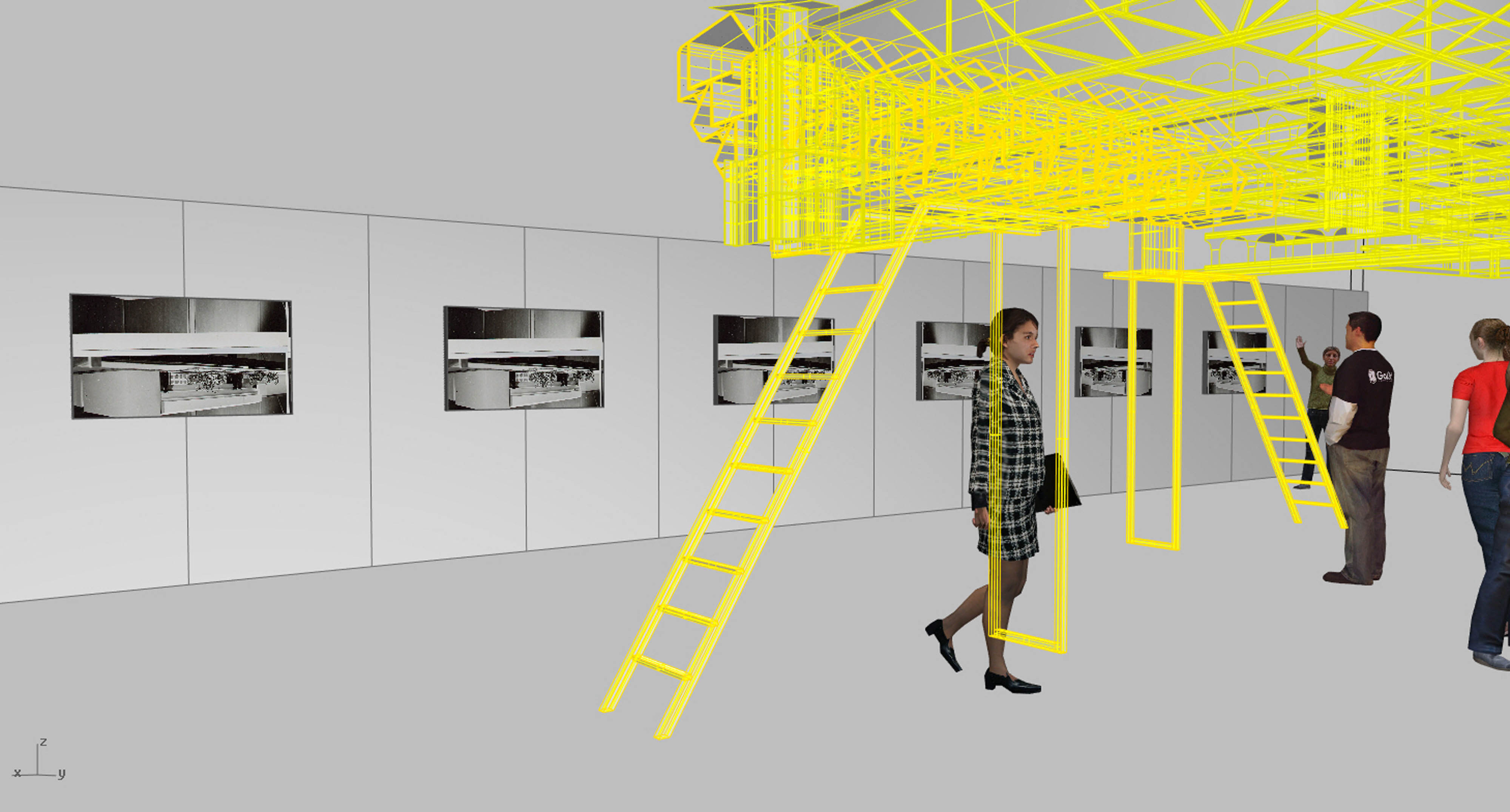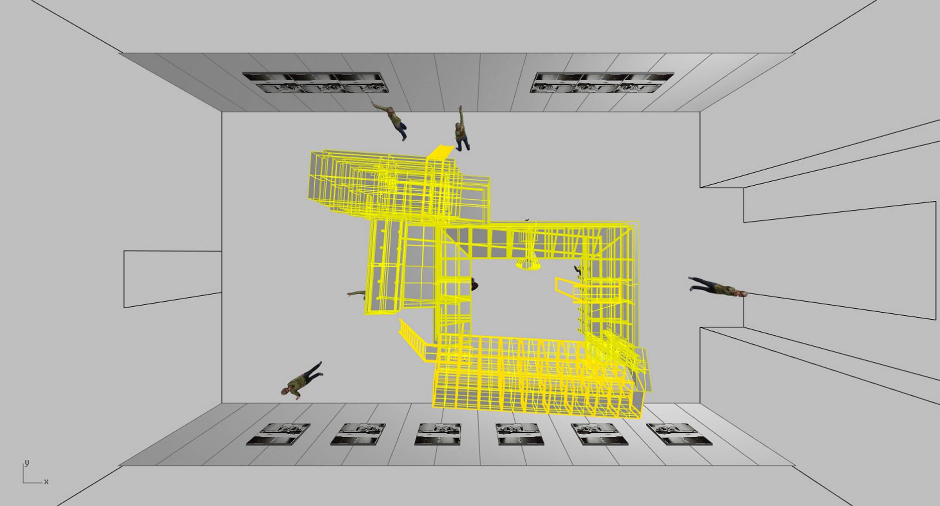 Model je postavený v strede medzi dvoma bočnými stenami pavilónu. Plochy stien predstavujú dve prostredia, dve diferencované stratégie: a/ prostredie zápasu, boja, stratégie starostlivosti, obstarávania a práce s dokumentmi na jednej strane a b/ prostredie výziev do tanca, stratégie starosti a projektu na strane druhej.