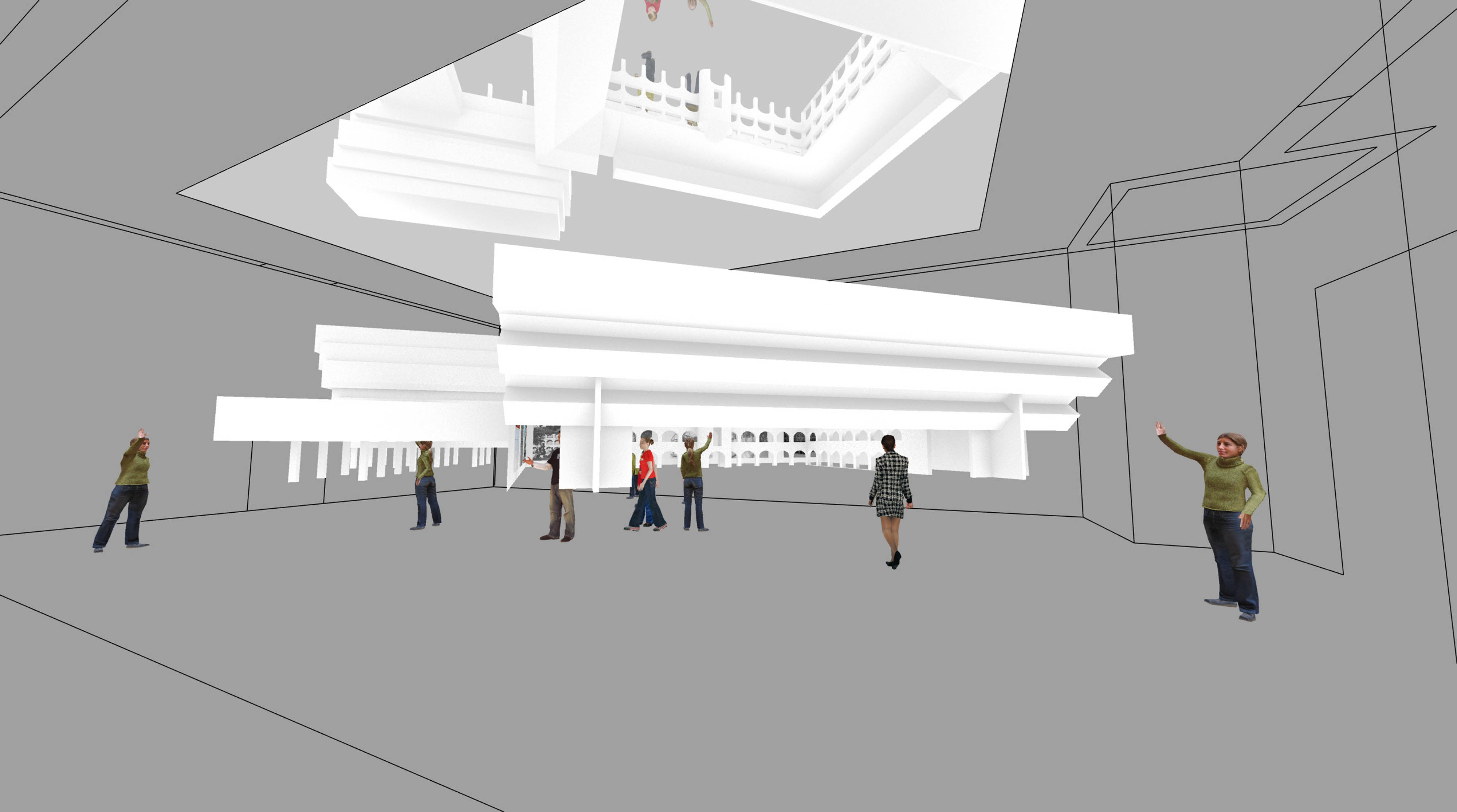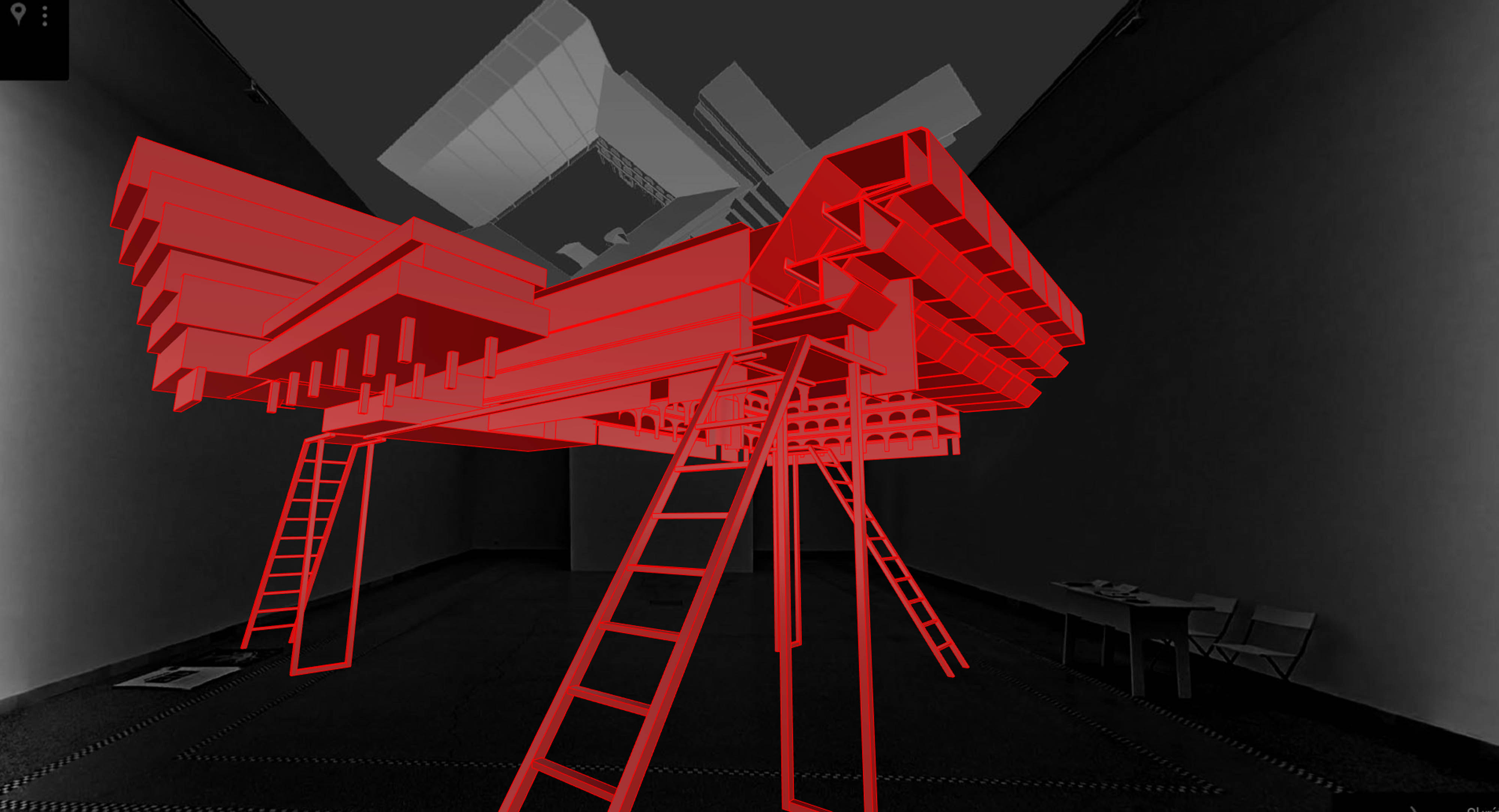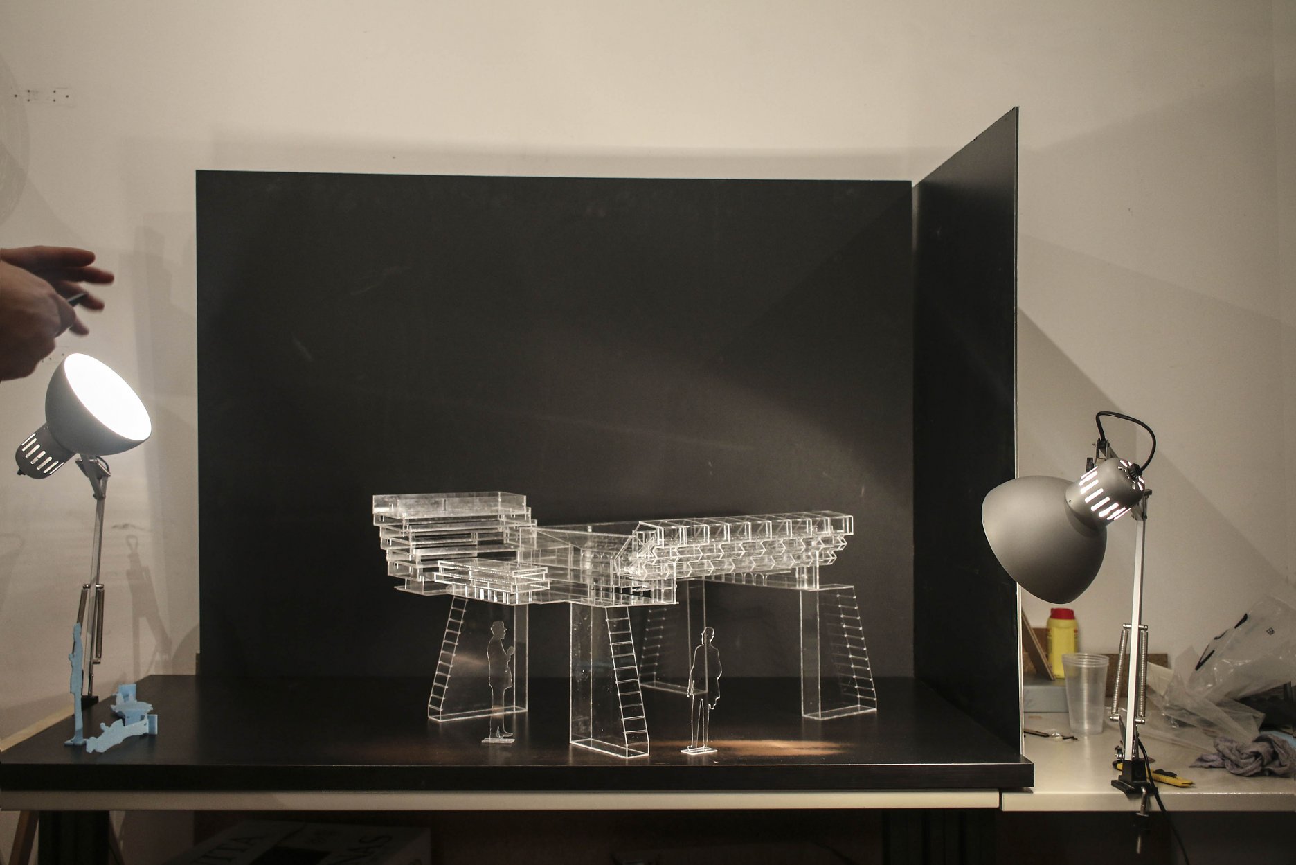 Model je postavený v strede medzi dvoma bočnými stenami pavilónu. Plochy stien predstavujú dve prostredia, dve diferencované stratégie: a/ prostredie zápasu, boja, stratégie starostlivosti, obstarávania a práce s dokumentmi na jednej strane a b/ prostredie výziev do tanca, stratégie starosti a projektu na strane druhej.