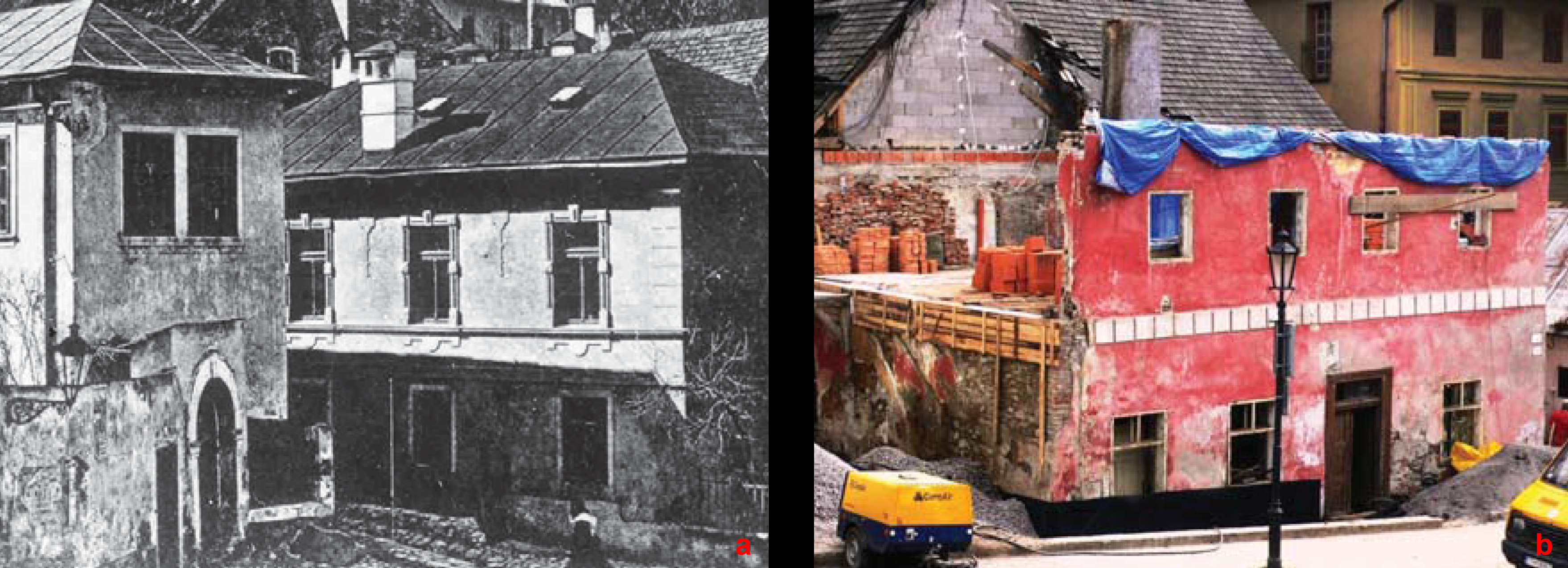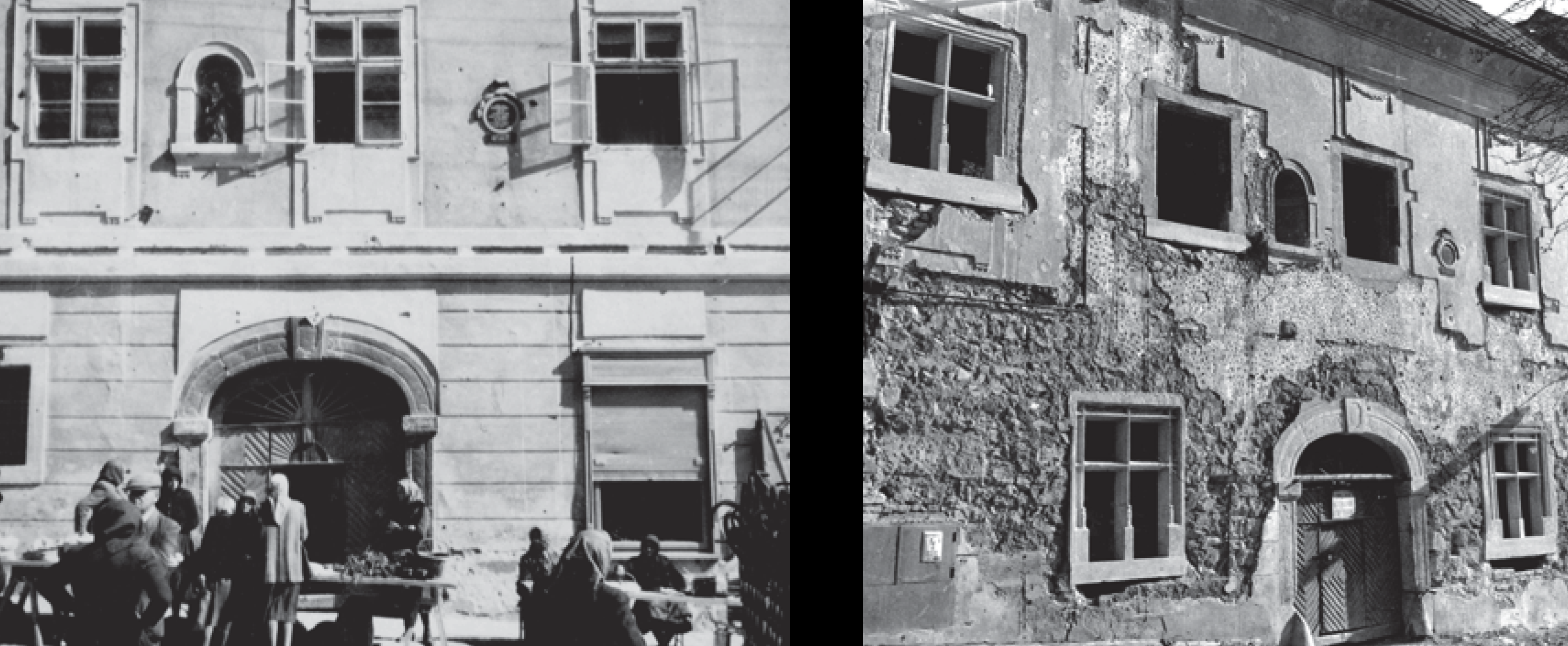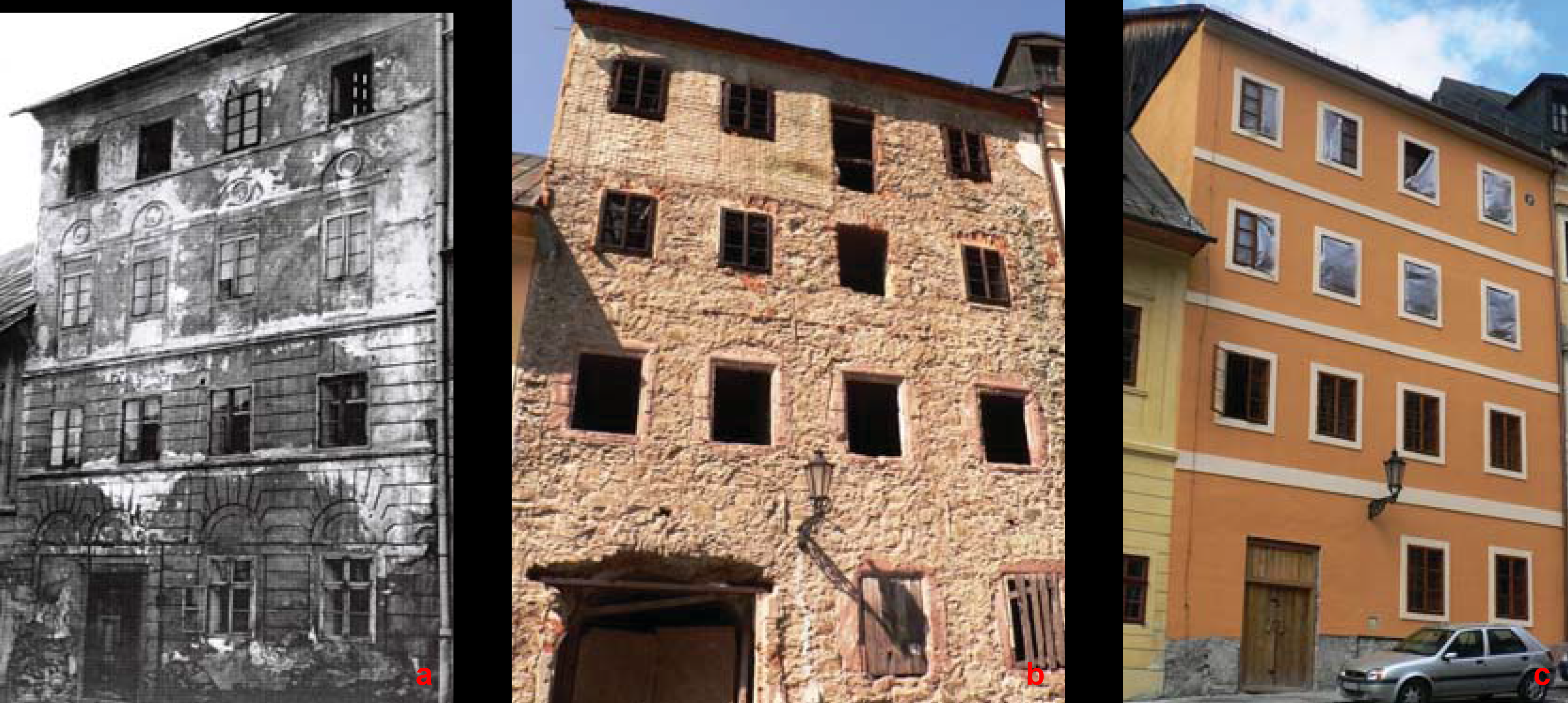 - strata pôvodných konštrukcií a materiálu, pôvodných kultúrnych vrstiev, pôvodných konštrukcií, najmä drevených (stropov, krovov, okien, dverí, podláh a pod.); odstraňovaním kultúrnych omietkových vrstiev, ktoré boli nositeľmi slohových prejavov z času svojho vzniku (takmer všetky palácové domy na východnej strane Nám. Sv. Trojice mali odstránené dve slohové kultúrne vrstvy – klasicistickú a barokovú, aby mohli byť reštaurované fasády z obdobia renesancie. (Tento prístup nie je ojedinelý ani dnes. S obľubou ho presadzujú reštaurátori (môže súvisieť aj s finančne výhodnejšou zákazkou). Odstraňovanie mladších kultúrnych vrstiev je však v rozpore s výzvami medzinárodného odborného spoločenstva už od začiatku 20. storočia, hlavne s Benátskou chartou ICOMOS). Tieto tendencie ilustruje príklad obnovy meštianskeho domu na Nám. sv. Trojice č. 11, ktorý bol v roku 2003 s metodickým usmernením reštaurovaný v zmysle Benátskej charty, následne v roku 2010 bol novým metodickým usmernením znova reštaurovaný, pričom boli zlikvidované tri kultúrne omietkové vrstvy z fasády, aby mohla byť hypoteticky rekonštruovaná podoba z obdobia renesancie. (Príklad bude ilustrovaný vo výskume „testu autenticity“ v kapitole 5.3.1 Aplikácia „testu autenticity“ – overenie miery zachovania autenticity).