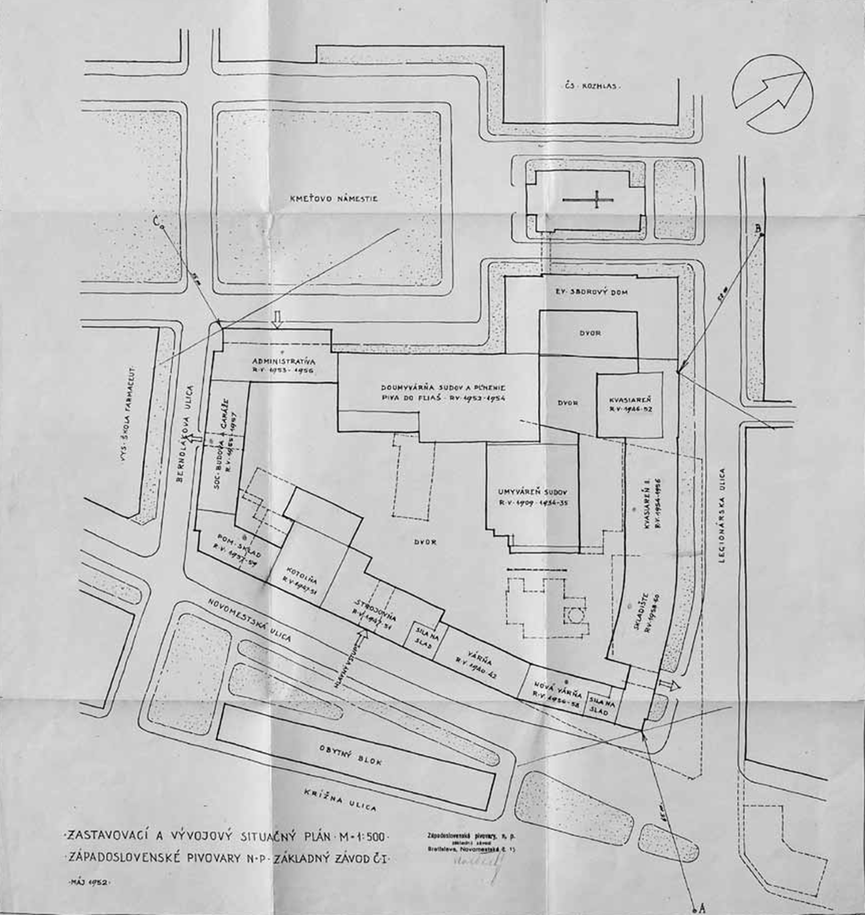 Na základe historických dokumentov sme pomerne dobre informovaní o rozsahu a skladbe budov v areáli pivovaru koncom tridsiatych rokov 20. storočia i vtedajšom strojovom zariadení. Najstaršie budovy stojace vtedy v areáli pochádzali z rokov 1876 – 1896 a patrili k nim aj hlavné výrobné objekty – varňa a kvasiarne, ktoré stáli pri uličnej čiare Legionárskej ulice a tiež strojovňa a stará kotolňa situované z dvorovej strany. Ďalej tu bola budova, ktorá plnila funkciu umyvárne a smoliarne sudov a stáčiarne piva, pod ktorou bol rozsiahly ležiacky suterén. K podružným, ale nemenej dôležitým súčastiam výrobného areálu patrili objekt ľadovej pivnice, vodný filter, garáž a hostinec a najstarší objekt z roku 1876, ktorý vtedy plnil funkciu fľašovne a sušiarne mláta. Zo strany Novomestskej ulice (dnes Blumentálskej stáli hlavné brány do pivovaru a solitérna administratívna budova, v ktorej sa nachádzali kancelárie i bytové jednotky. V období prvej svetovej vojny bola postavená výrobňa ľadu (umelá ľadovňa) a chladiareň, ku koncu dvadsiatych rokov 20. storočia tiež vodná veža so strojovňou vybudovaná nad ležiackymi pivnicami a v roku 1936 nová kotolňa s komínom a budovou zmäkčovania vody. K pivovaru prináležali tiež rôzne dielne a pomocné prevádzky (práčovňa, maštale, sklad benzínu...). Architektúru budov z tohto obdobia charakterizujú klasické tvary kvádrových hmôt tehlovej konštrukcie so sedlovými strechami a murovanými štítmi tvorené v duchu historizmu, ktorých autormi boli pravdepodobne bratislavskí stavitelia Ignác a Karol Feiglerovci. V rámci najstaršieho stavebného fondu pivovaru sa progresívnym typom železobetónovej konštrukcie vymyká stavba chladiarne s vodnou vežou z roku 1929 realizovaná stavebnou firmou Pittel & Brausewetter.