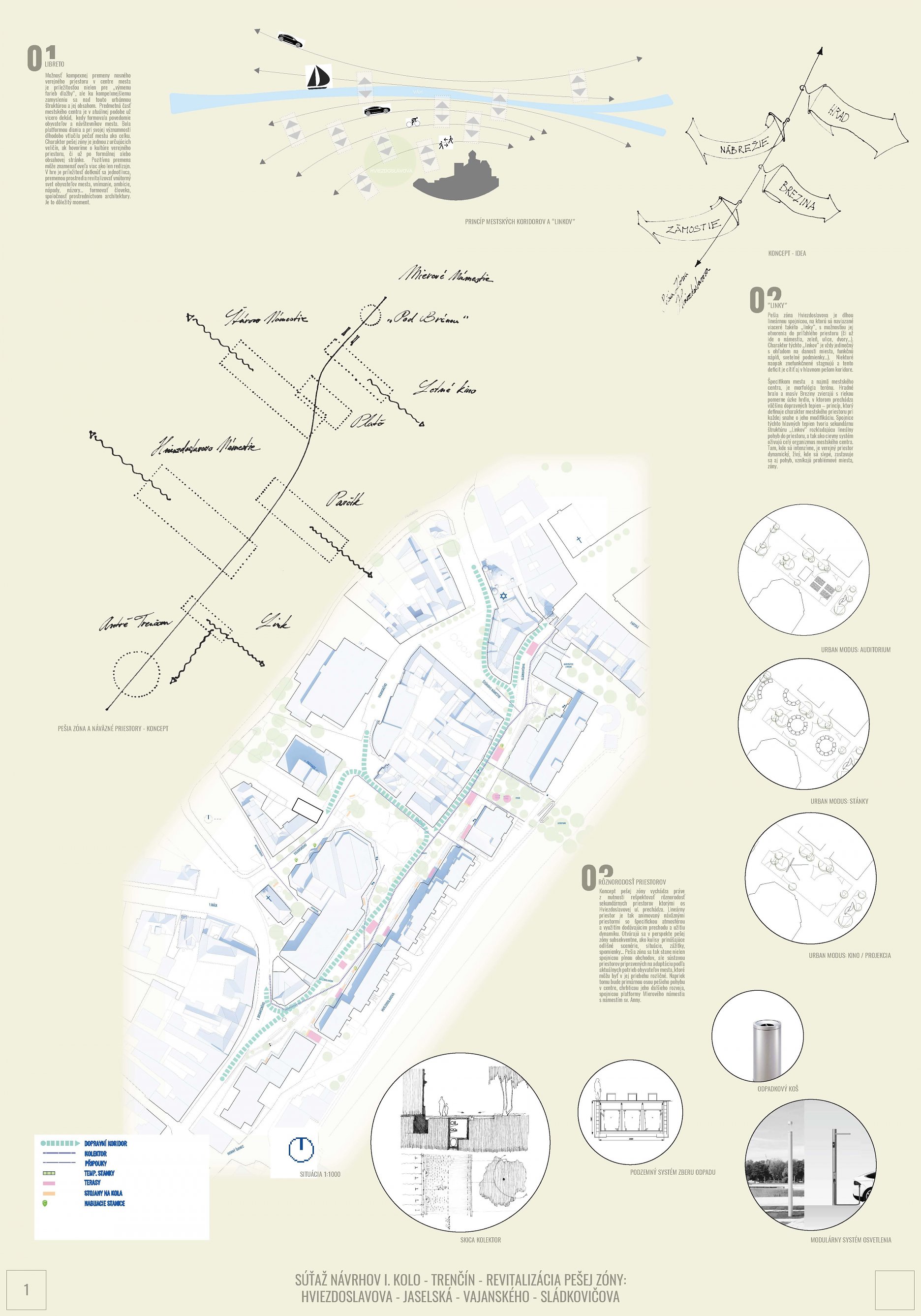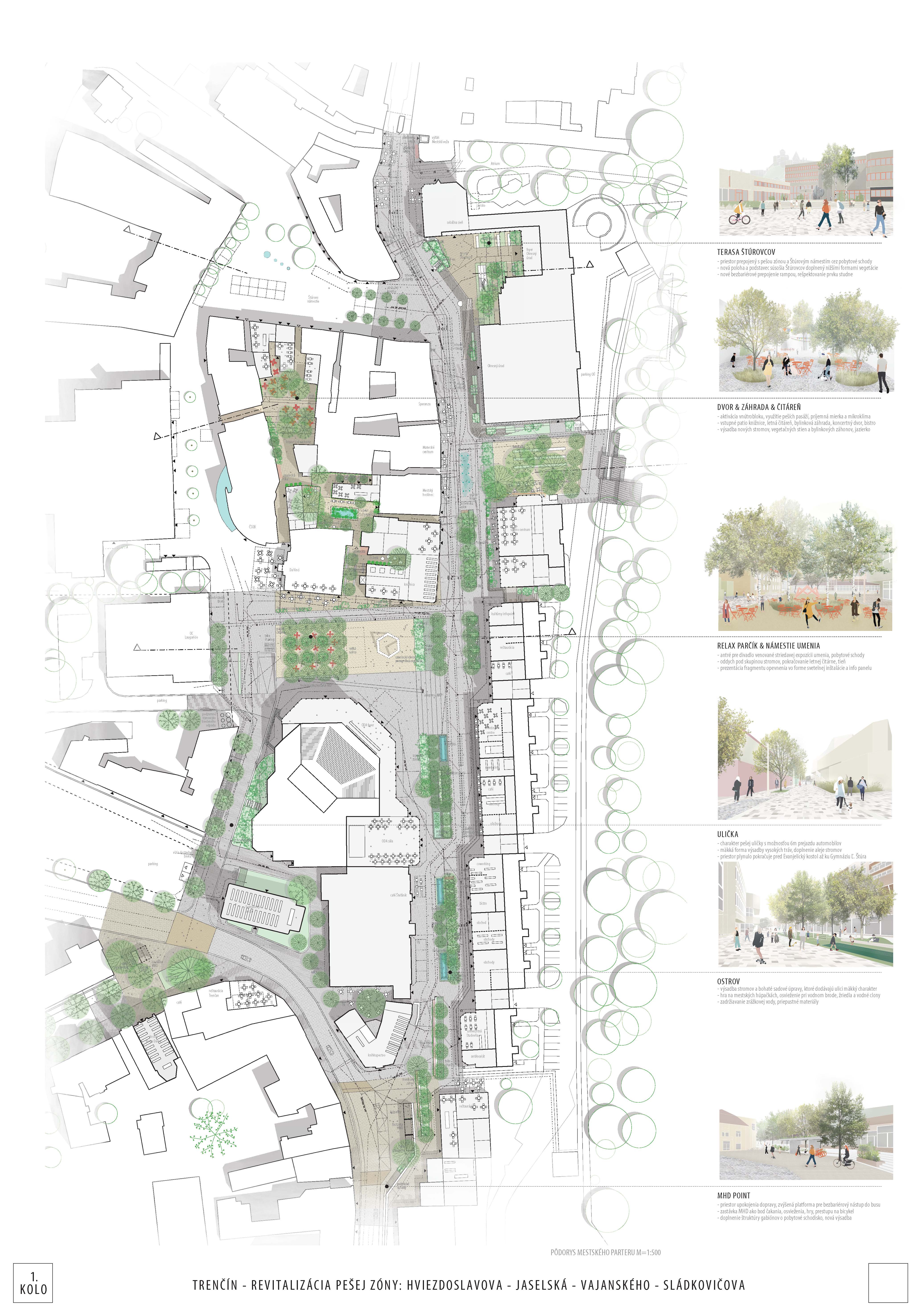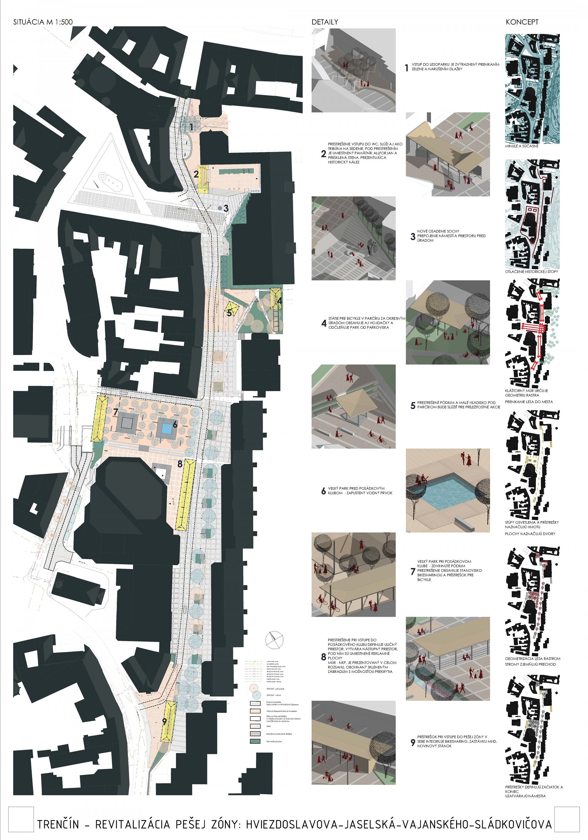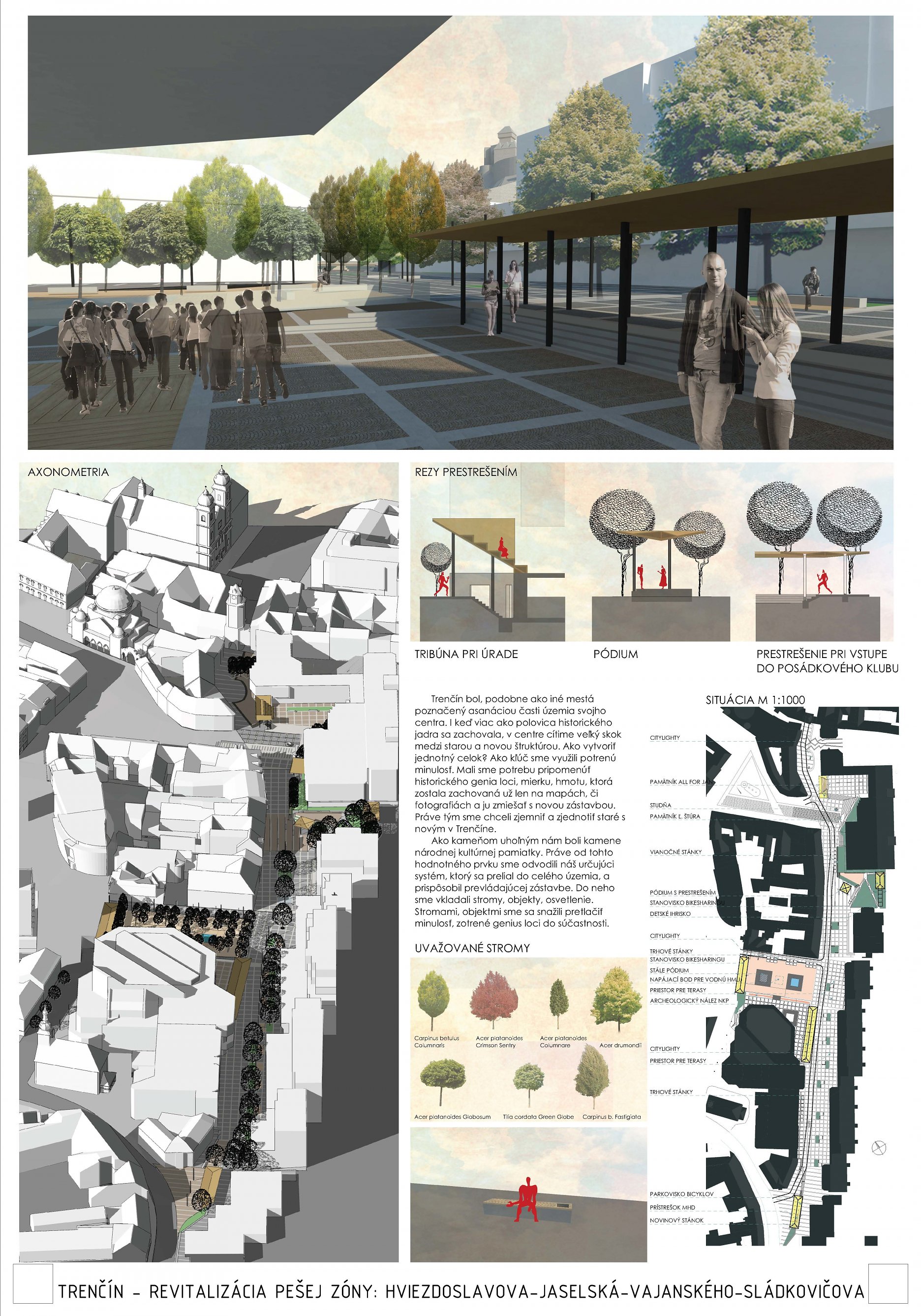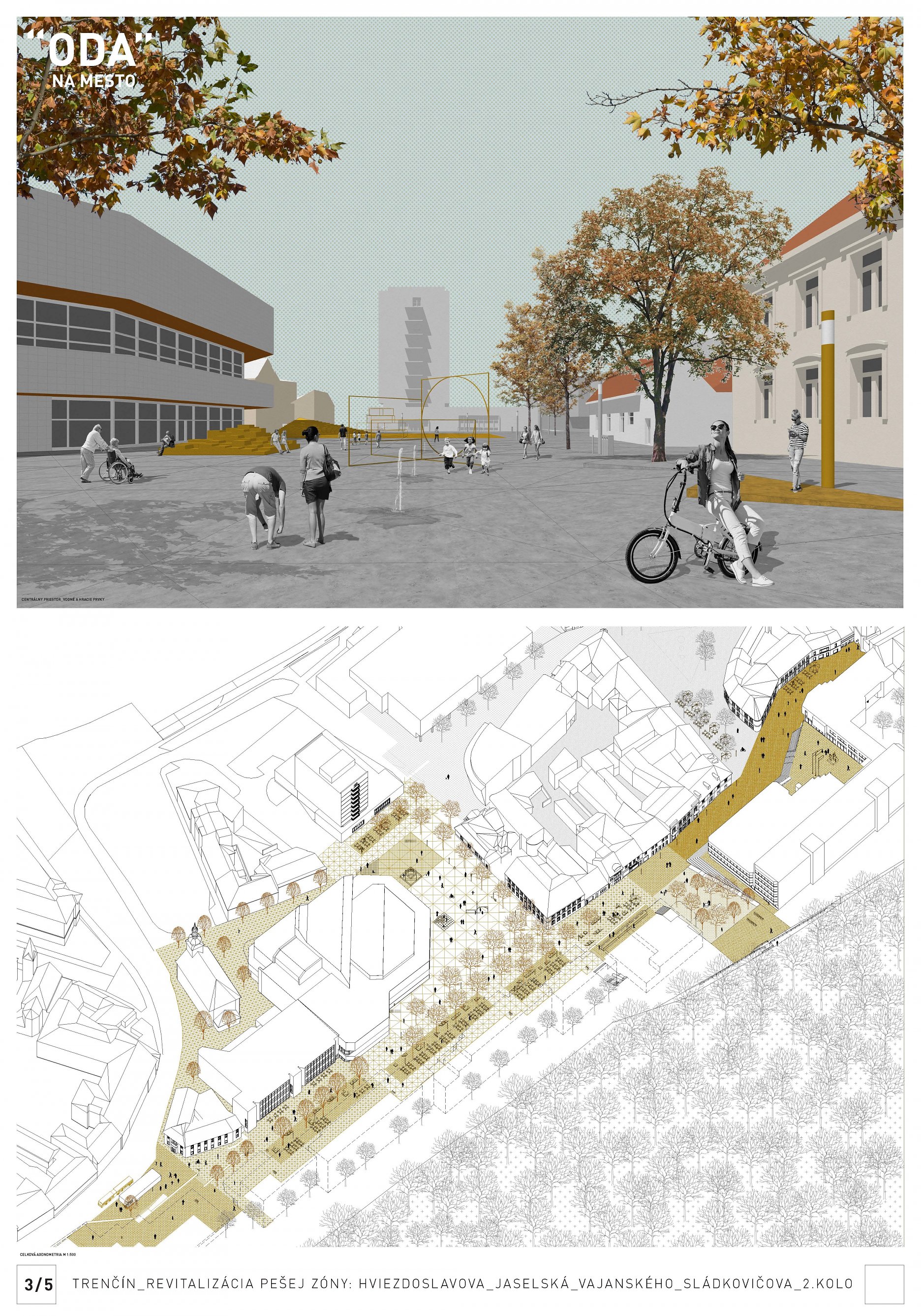 Rok po dokončení rozsiahlej rekonštrukcie Mierového námestia (ateliér RAW - súťaž 2007) vyhlásilo mesto Trenčín súťaž na revitalizáciu nadväzujúcich priestorov pešej zóny. Predmetom riešenia boli frekventované priestory ulíc Hviezdoslavova, Jaselská, Vajanského a Sládkovičova.