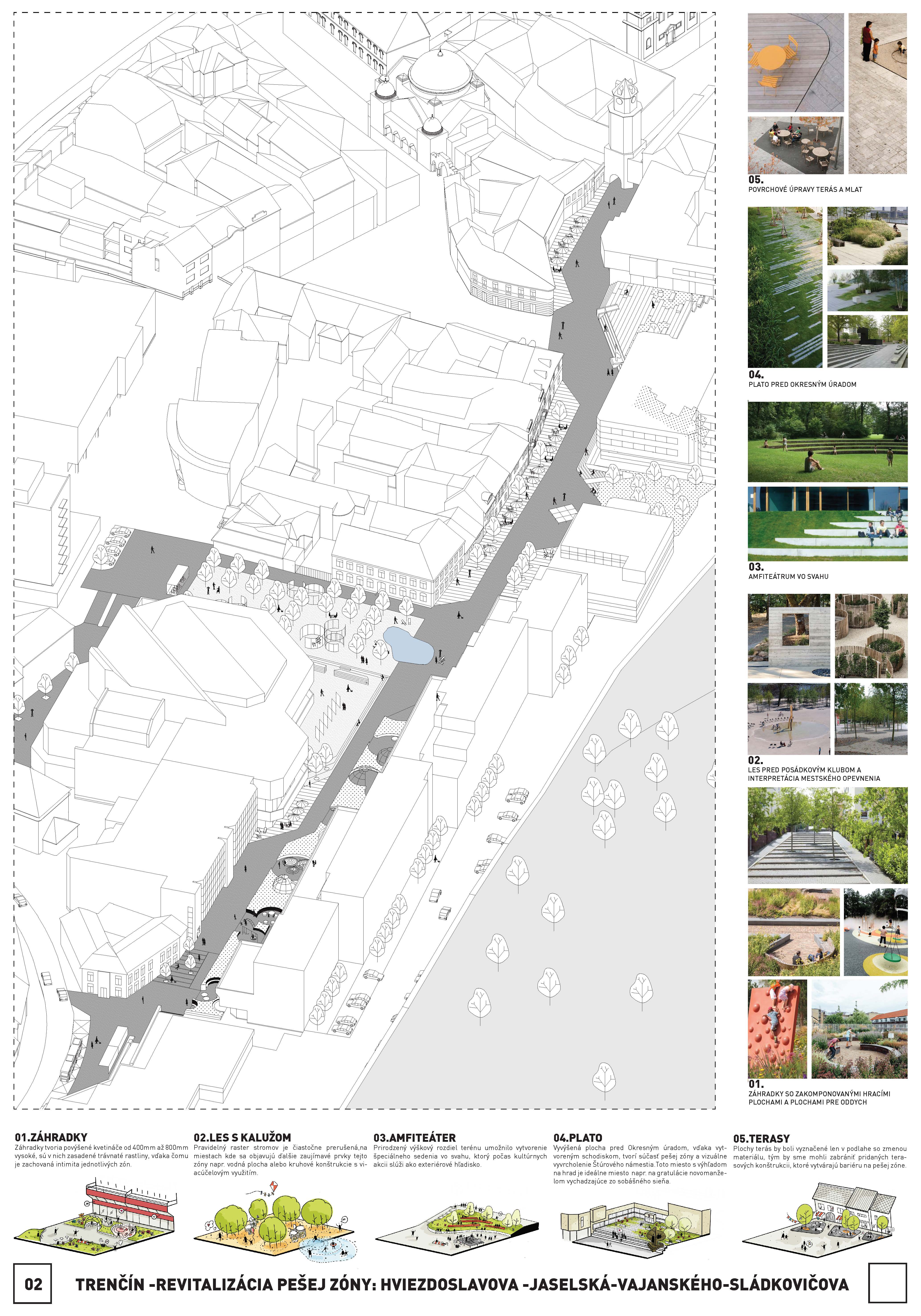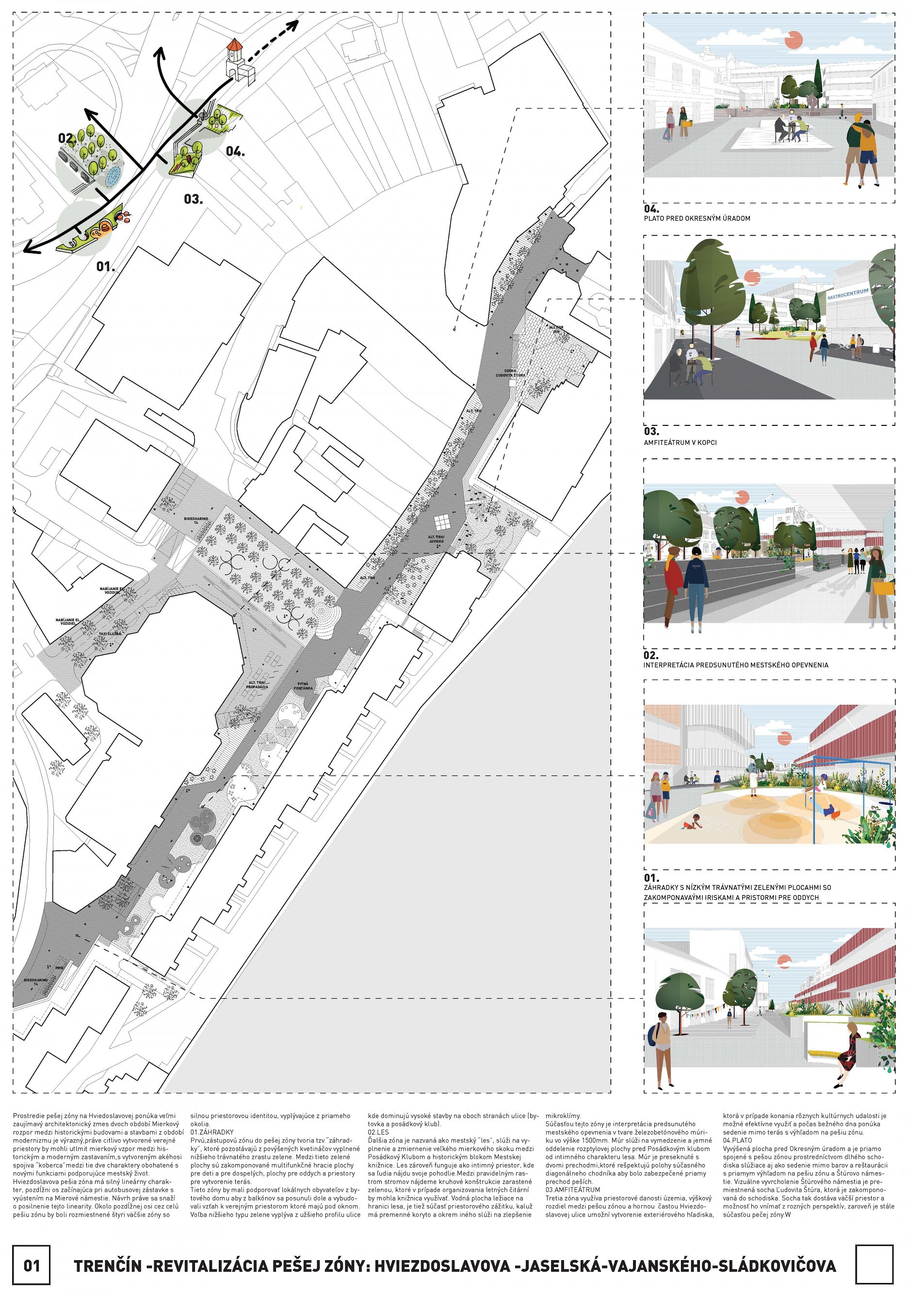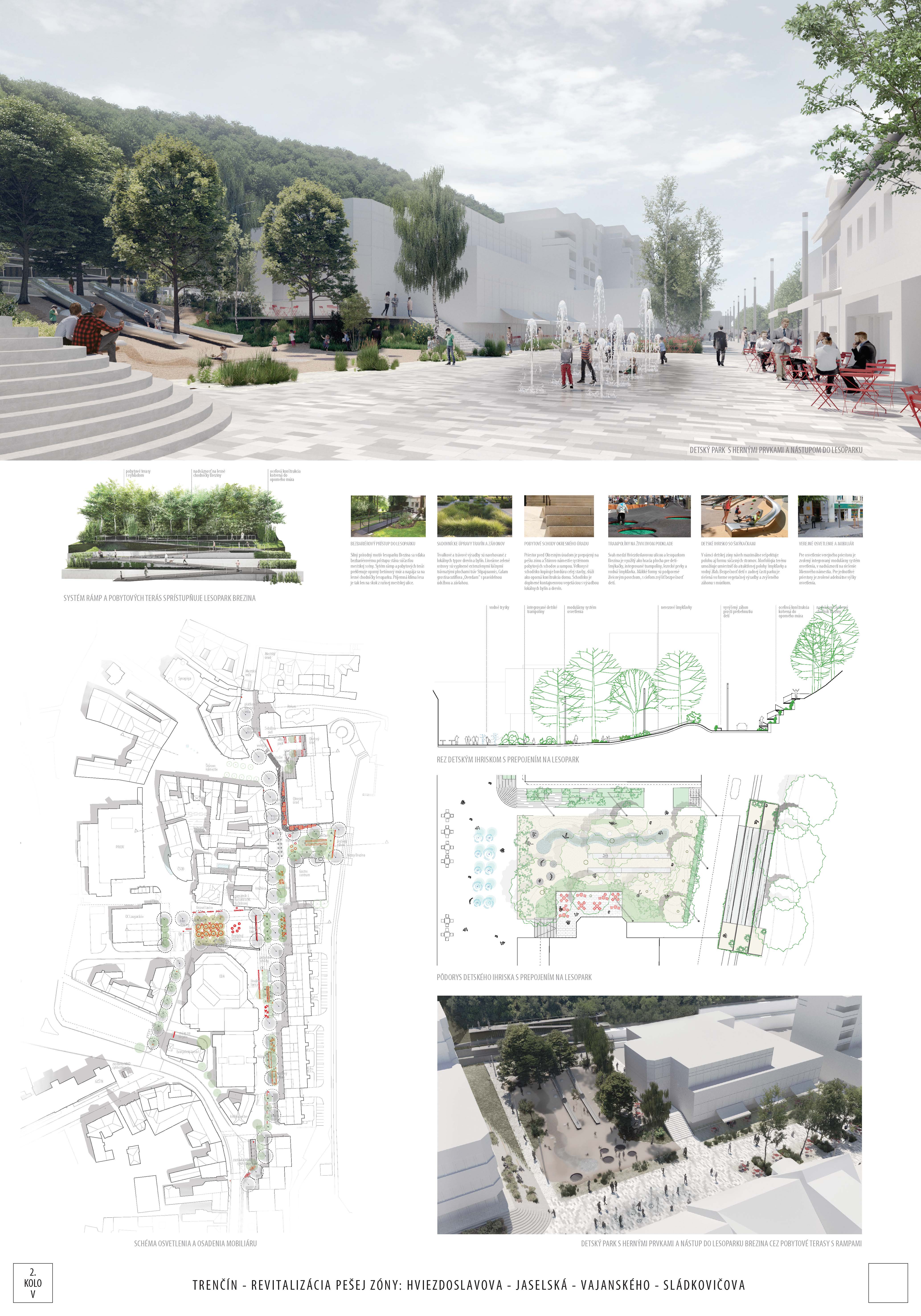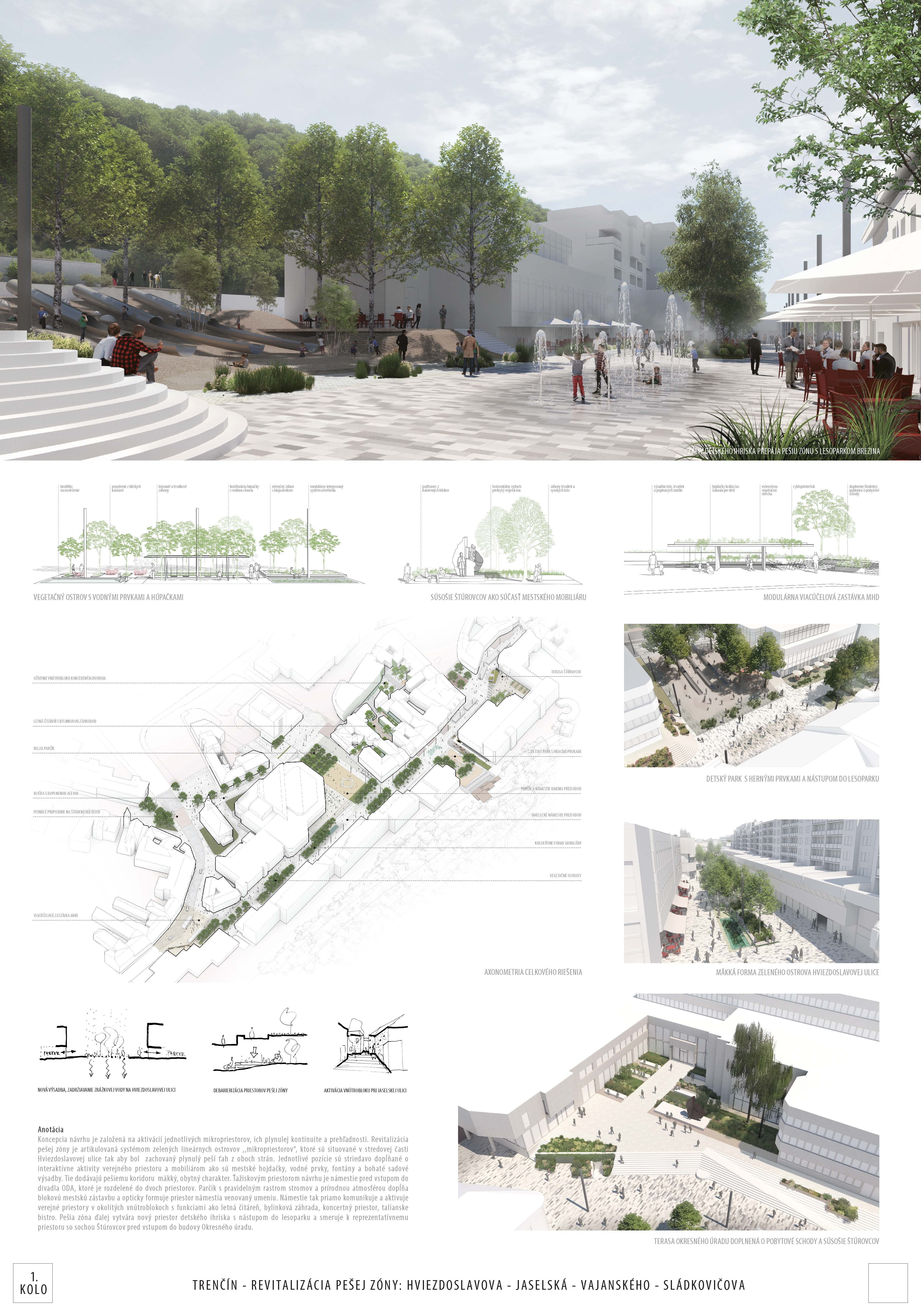 Porota v návrhu ocenila najlepšiu a poctivú analýzu zadania a následne aj riešeného územia, polyfunkčnosť a diverzifikáciu jednotlivých urbanistických mikropriestorov vo vzťahu k funkčnosti jednotlivých celkov - pri dodržaní jednotnej ucelenej koncepcie celého riešeného územia, primeranú formu i podiel zelene a proporcie spevnených a nespevnených plôch, atraktívne zapojenie lesoparku do pešej zóny prírodným prechodom s najprijateľnejším prepojením Breziny. Samotné prepojenie parčíka s pešou zónou však porota odporúča riešiť ešte prírodnejšími povrchmi formou trávnikov, záhonov a podobne - na úkor navrhnutých povrchov pod šmykľavkami. Návrh je jednoznačne najpresvedčivejší vo všetkých aspektoch a jedná sa o najlepšie ucelené komplexné riešenie. Porota oceňuje zrozumiteľnú artikuláciu veľkej plochy na jednotlivé mikropriestory, ktoré majú silné vlastné charaktery, architektonický (a aj grafický) prejav je veľmi kultivovaný, návrh vynikajúco pracuje s primerane malou mierkou vhodnou do jednotlivých prostredí územia a perfektne vytvára vhodnú atmosféru v každej časti. Zároveň návrh dosahuje zaujímavú (a potrebnú) variabilitu priestoru pred Posádkovým klubom vo vzťahu k využiteľnosti územia, pričom tento priestor je primerane oddelený od samotnej Hviezdoslavovej ulice. Porota odporúča zvážiť diferenciáciu jednotlivých mikropriestorov aj formou úpravy jednotlivých povrchov, ďalej odporúča zvážiť priamu dominantnú líniu verejného osvetlenia, zvážiť formu rampy k okresnému úradu a doladenie urbanistických detailov. Ako problematické zatiaľ porota vníma prevádzku a údržbu niektorých nespevnených častí - napr. trávnik pred Posádkovým klubom vo vzťahu k príležitostným trhom alebo koncertom a použitie štrku v ostrovčekoch.