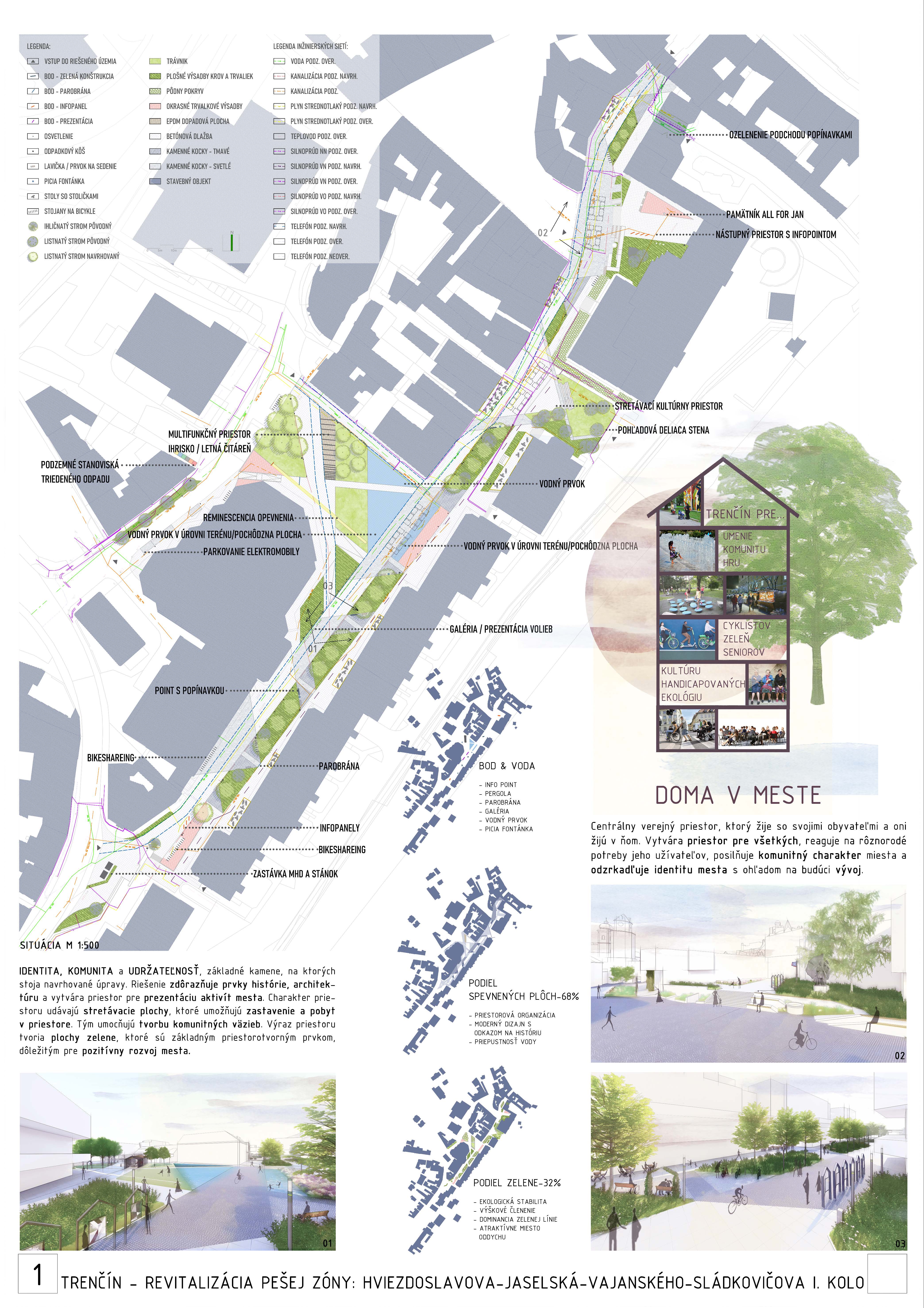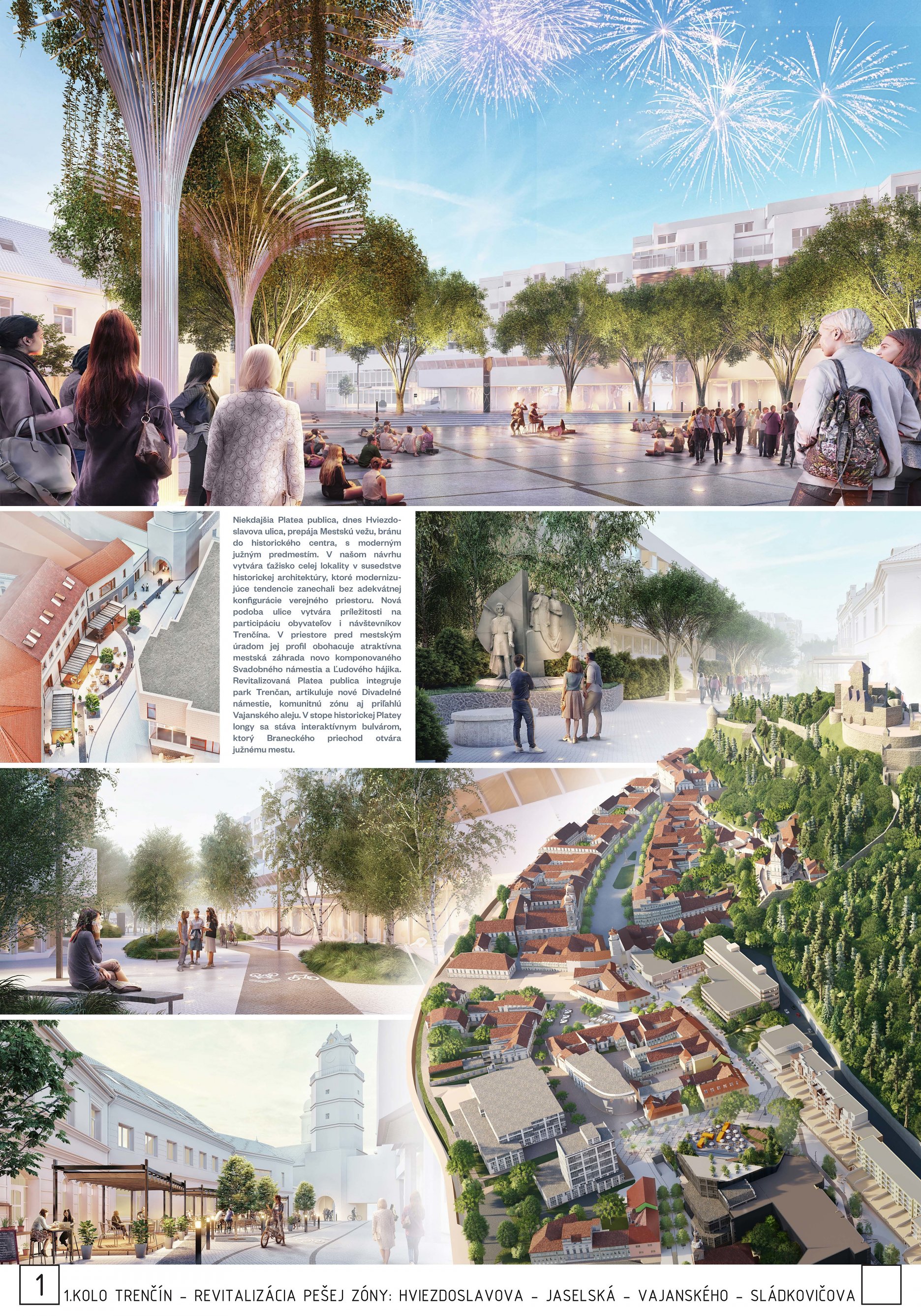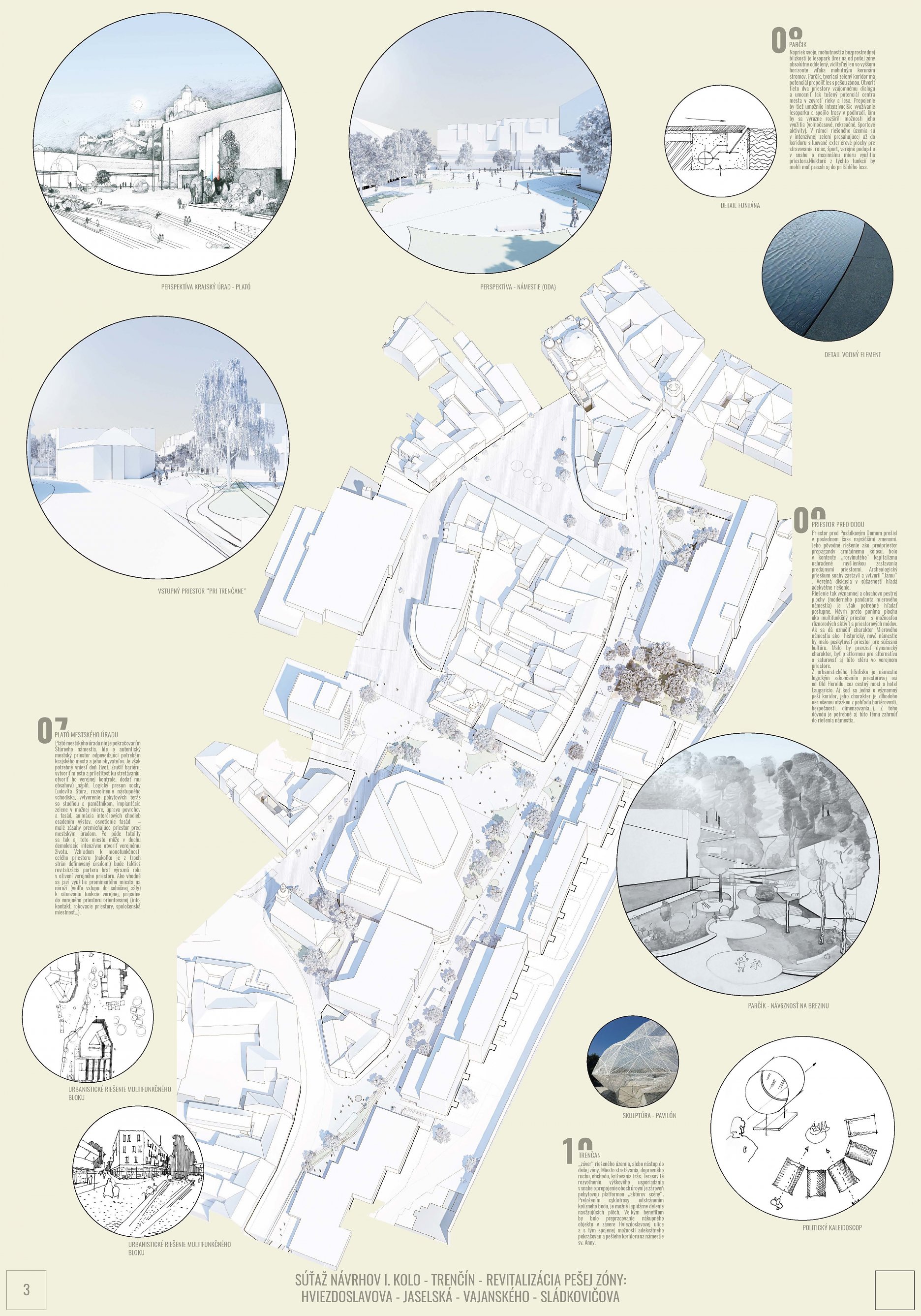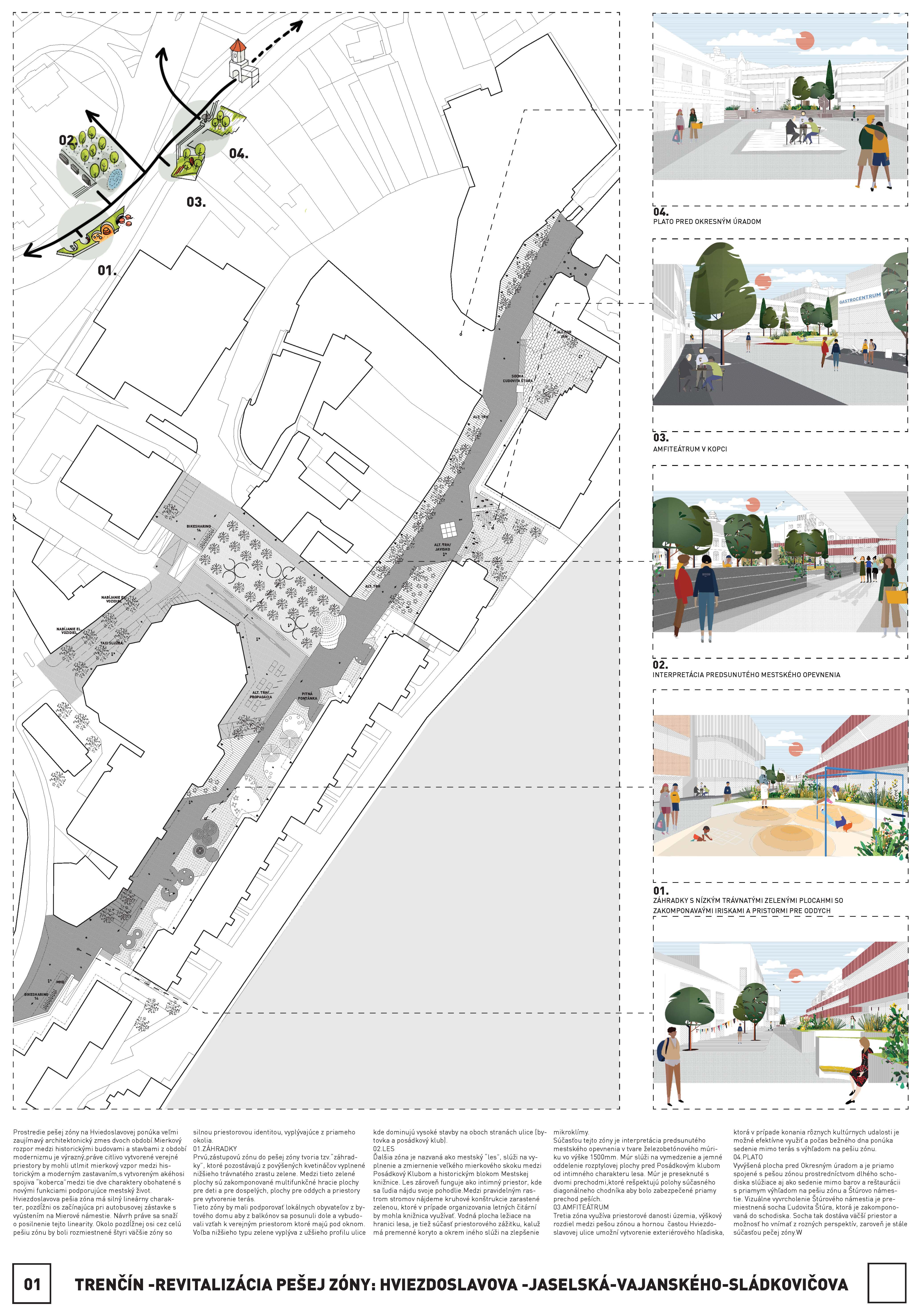 Porota v návrhu ocenila najlepšiu a poctivú analýzu zadania a následne aj riešeného územia, polyfunkčnosť a diverzifikáciu jednotlivých urbanistických mikropriestorov vo vzťahu k funkčnosti jednotlivých celkov - pri dodržaní jednotnej ucelenej koncepcie celého riešeného územia, primeranú formu i podiel zelene a proporcie spevnených a nespevnených plôch, atraktívne zapojenie lesoparku do pešej zóny prírodným prechodom s najprijateľnejším prepojením Breziny. Samotné prepojenie parčíka s pešou zónou však porota odporúča riešiť ešte prírodnejšími povrchmi formou trávnikov, záhonov a podobne - na úkor navrhnutých povrchov pod šmykľavkami. Návrh je jednoznačne najpresvedčivejší vo všetkých aspektoch a jedná sa o najlepšie ucelené komplexné riešenie. Porota oceňuje zrozumiteľnú artikuláciu veľkej plochy na jednotlivé mikropriestory, ktoré majú silné vlastné charaktery, architektonický (a aj grafický) prejav je veľmi kultivovaný, návrh vynikajúco pracuje s primerane malou mierkou vhodnou do jednotlivých prostredí územia a perfektne vytvára vhodnú atmosféru v každej časti. Zároveň návrh dosahuje zaujímavú (a potrebnú) variabilitu priestoru pred Posádkovým klubom vo vzťahu k využiteľnosti územia, pričom tento priestor je primerane oddelený od samotnej Hviezdoslavovej ulice. Porota odporúča zvážiť diferenciáciu jednotlivých mikropriestorov aj formou úpravy jednotlivých povrchov, ďalej odporúča zvážiť priamu dominantnú líniu verejného osvetlenia, zvážiť formu rampy k okresnému úradu a doladenie urbanistických detailov. Ako problematické zatiaľ porota vníma prevádzku a údržbu niektorých nespevnených častí - napr. trávnik pred Posádkovým klubom vo vzťahu k príležitostným trhom alebo koncertom a použitie štrku v ostrovčekoch.