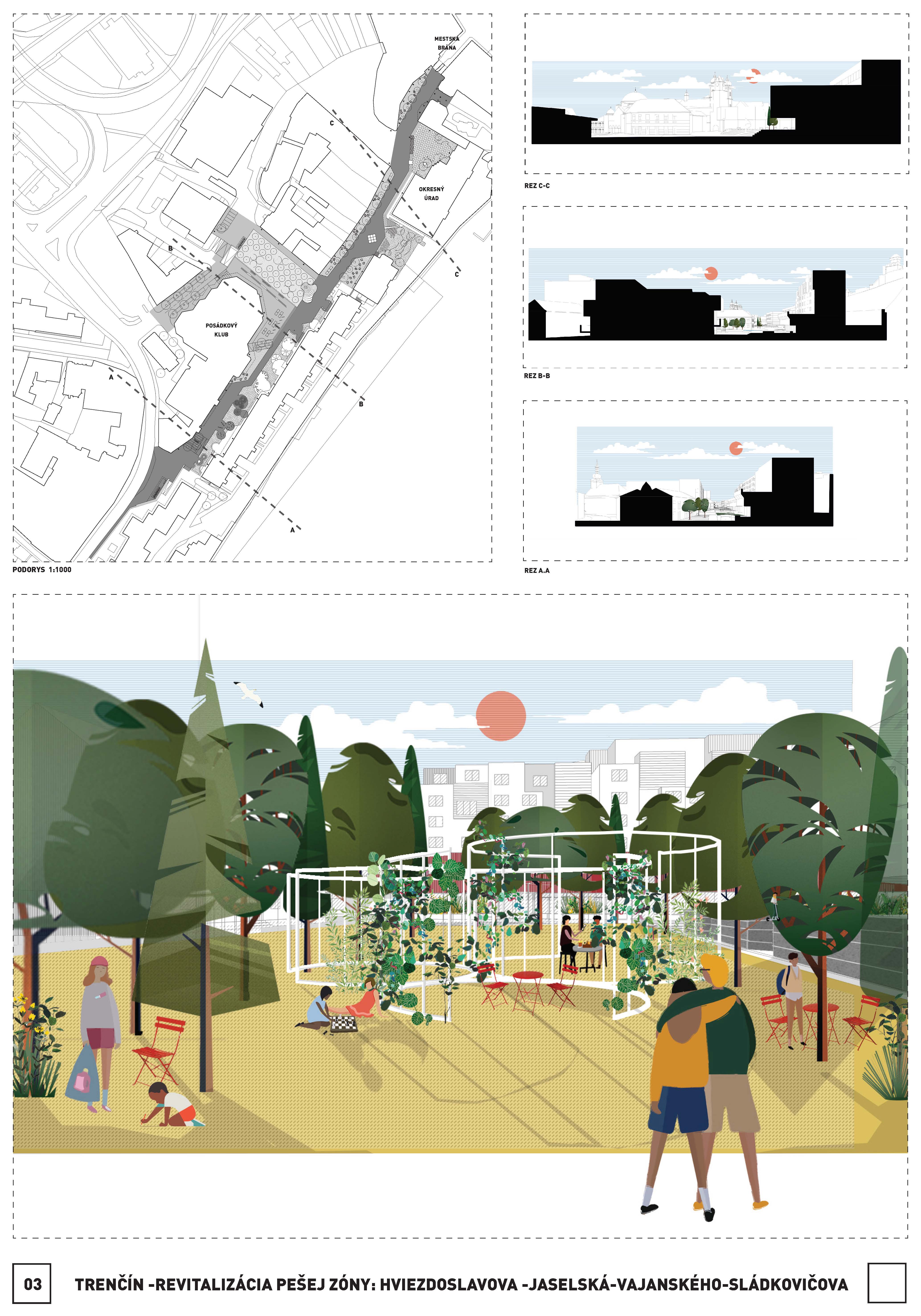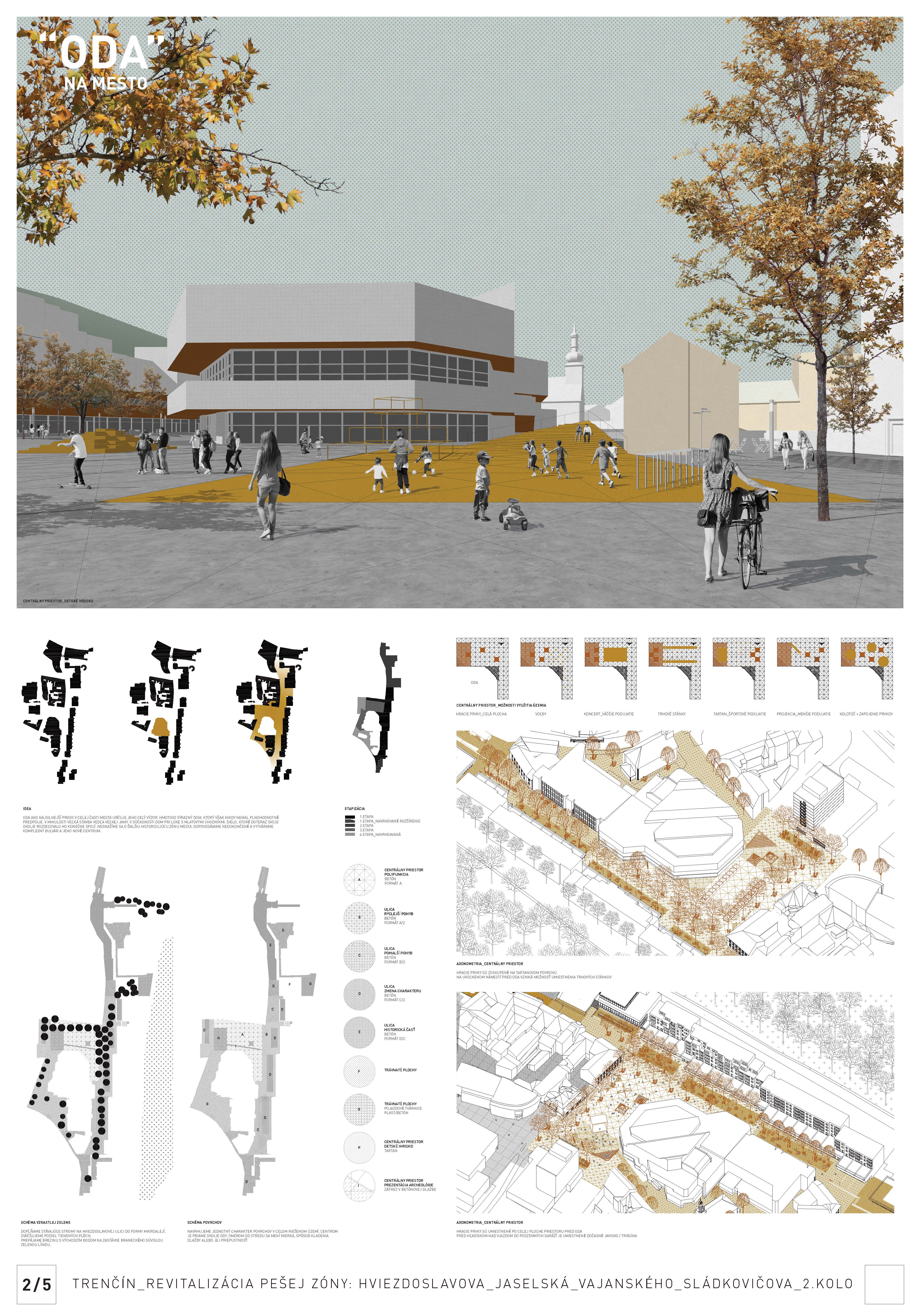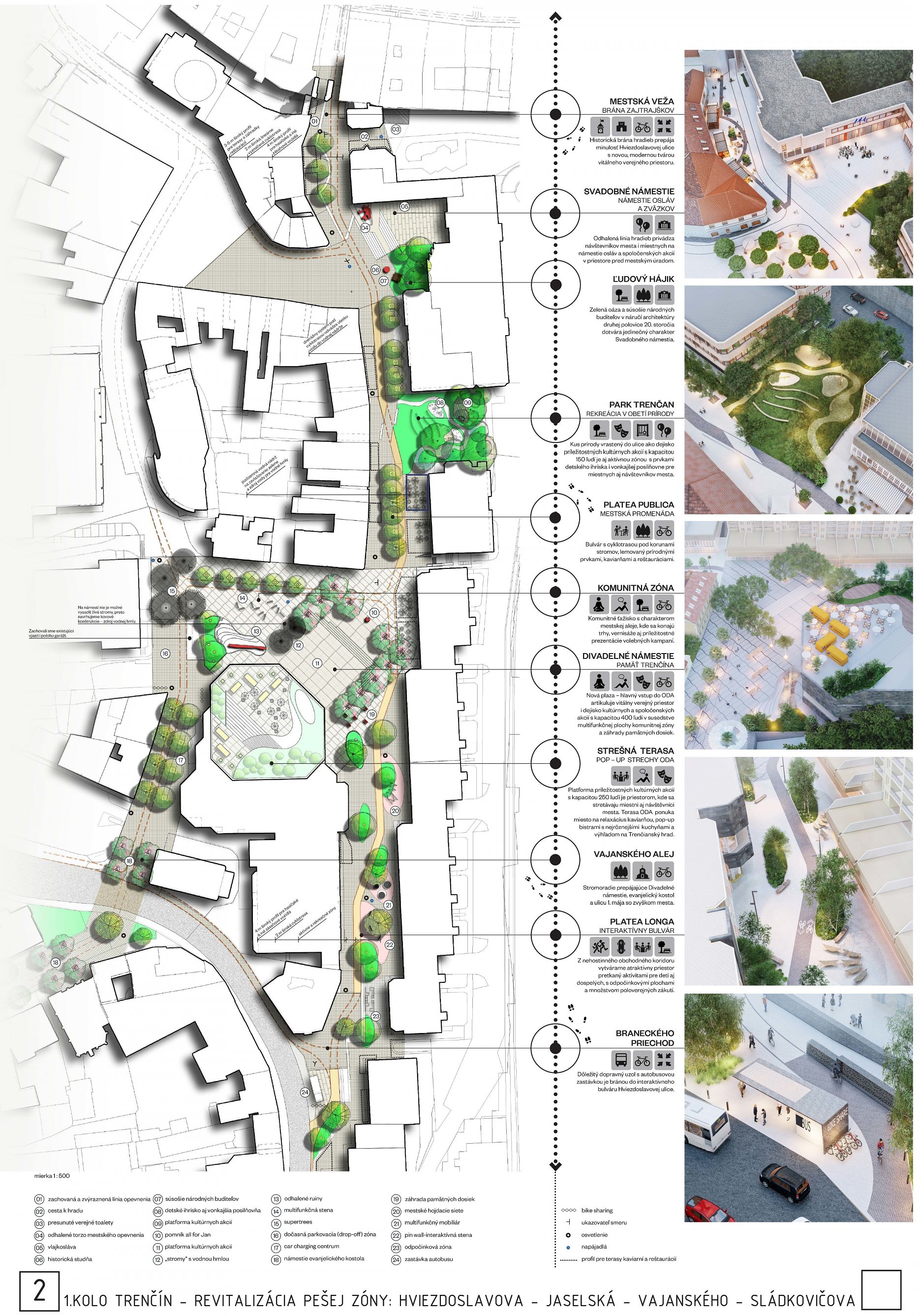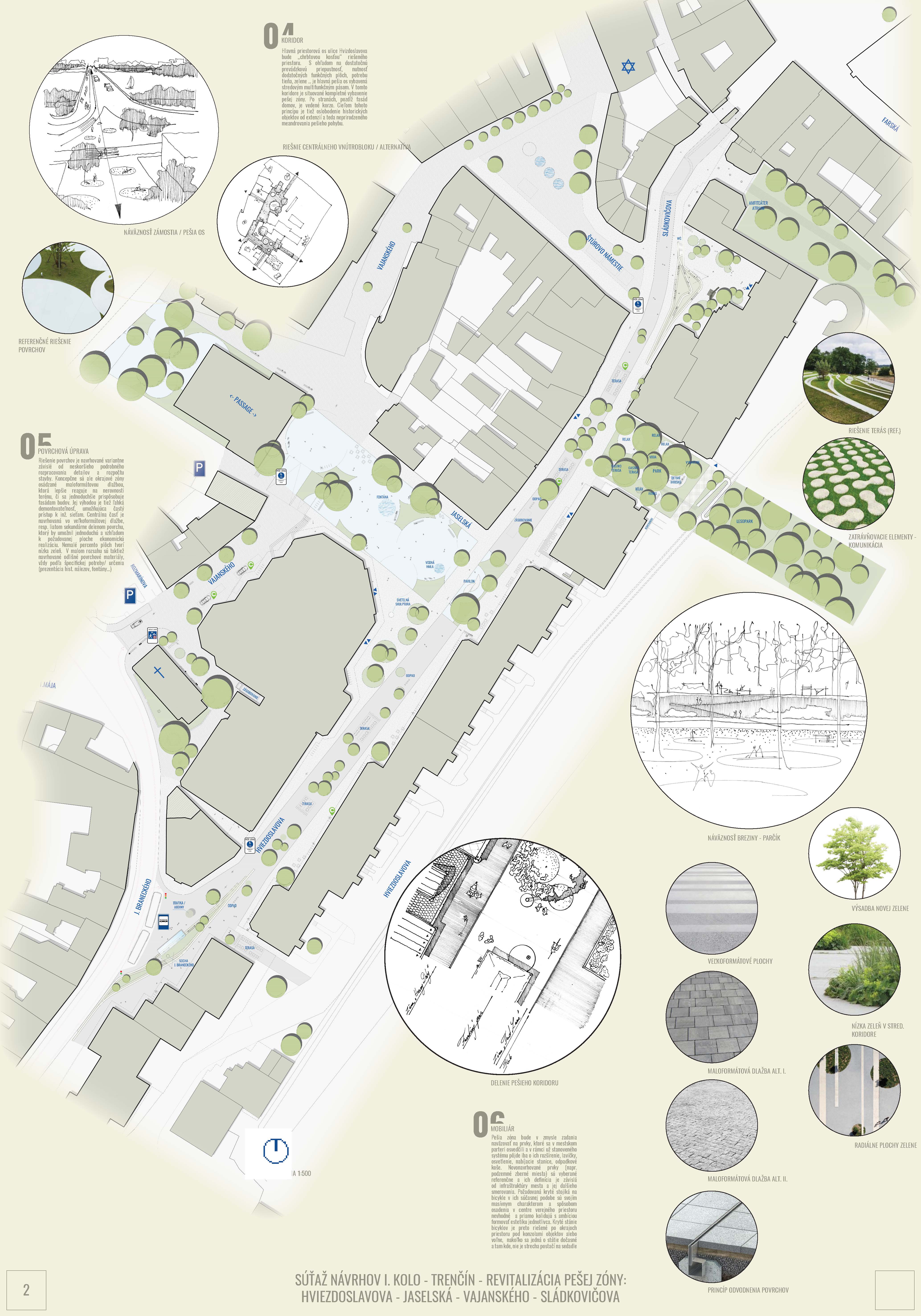 Porota v návrhu ocenila najlepšiu a poctivú analýzu zadania a následne aj riešeného územia, polyfunkčnosť a diverzifikáciu jednotlivých urbanistických mikropriestorov vo vzťahu k funkčnosti jednotlivých celkov - pri dodržaní jednotnej ucelenej koncepcie celého riešeného územia, primeranú formu i podiel zelene a proporcie spevnených a nespevnených plôch, atraktívne zapojenie lesoparku do pešej zóny prírodným prechodom s najprijateľnejším prepojením Breziny. Samotné prepojenie parčíka s pešou zónou však porota odporúča riešiť ešte prírodnejšími povrchmi formou trávnikov, záhonov a podobne - na úkor navrhnutých povrchov pod šmykľavkami. Návrh je jednoznačne najpresvedčivejší vo všetkých aspektoch a jedná sa o najlepšie ucelené komplexné riešenie. Porota oceňuje zrozumiteľnú artikuláciu veľkej plochy na jednotlivé mikropriestory, ktoré majú silné vlastné charaktery, architektonický (a aj grafický) prejav je veľmi kultivovaný, návrh vynikajúco pracuje s primerane malou mierkou vhodnou do jednotlivých prostredí územia a perfektne vytvára vhodnú atmosféru v každej časti. Zároveň návrh dosahuje zaujímavú (a potrebnú) variabilitu priestoru pred Posádkovým klubom vo vzťahu k využiteľnosti územia, pričom tento priestor je primerane oddelený od samotnej Hviezdoslavovej ulice. Porota odporúča zvážiť diferenciáciu jednotlivých mikropriestorov aj formou úpravy jednotlivých povrchov, ďalej odporúča zvážiť priamu dominantnú líniu verejného osvetlenia, zvážiť formu rampy k okresnému úradu a doladenie urbanistických detailov. Ako problematické zatiaľ porota vníma prevádzku a údržbu niektorých nespevnených častí - napr. trávnik pred Posádkovým klubom vo vzťahu k príležitostným trhom alebo koncertom a použitie štrku v ostrovčekoch.