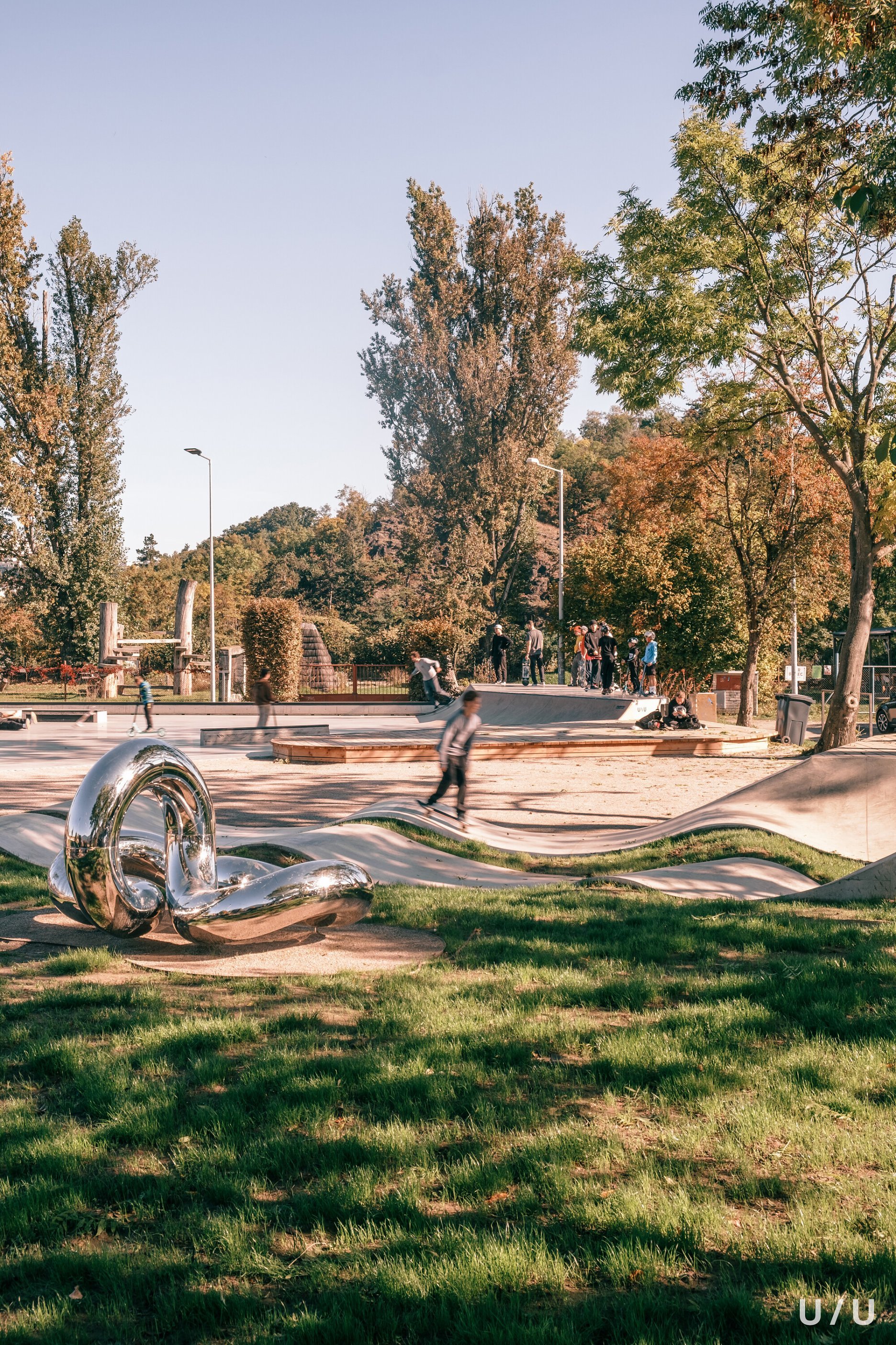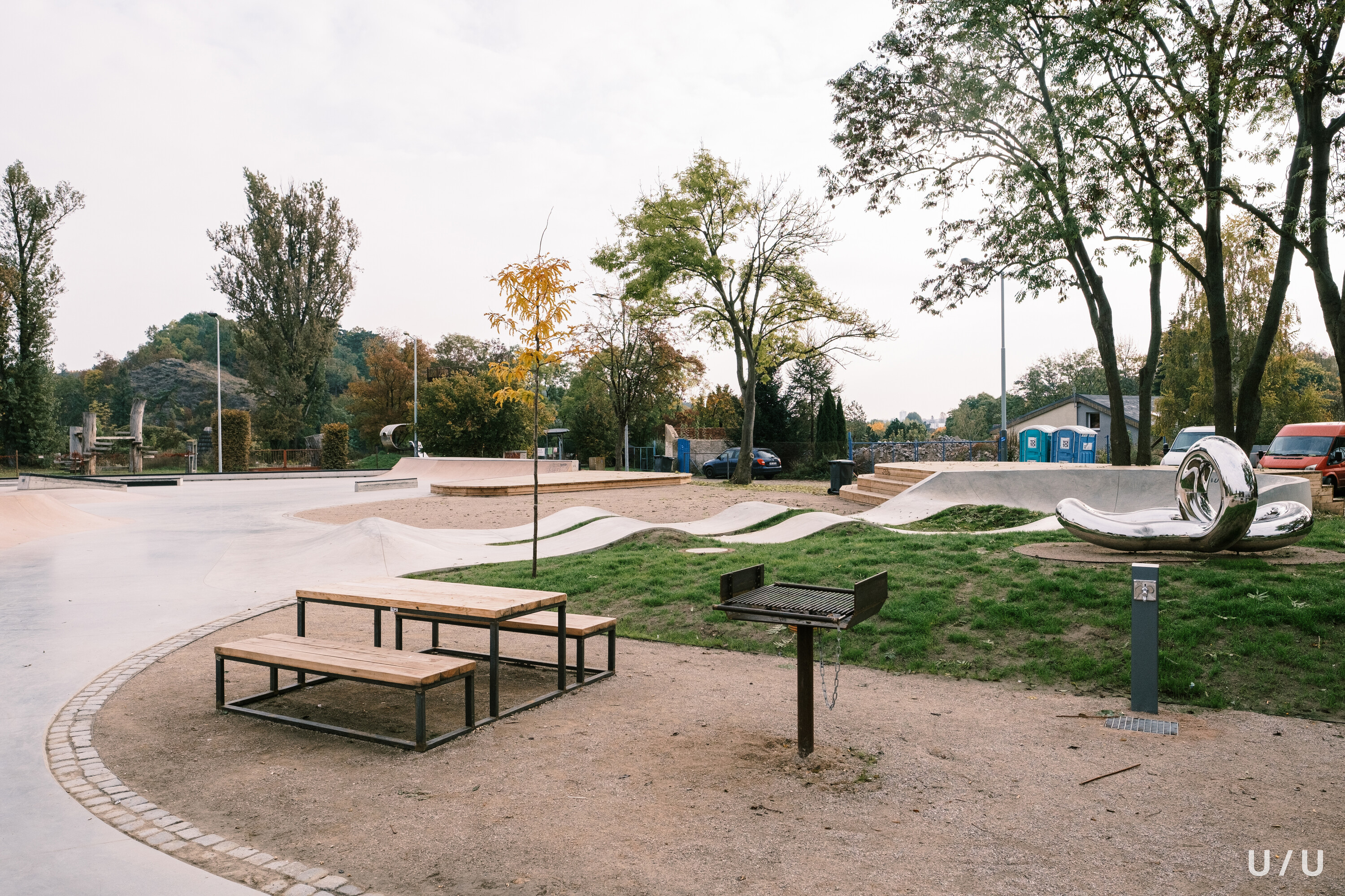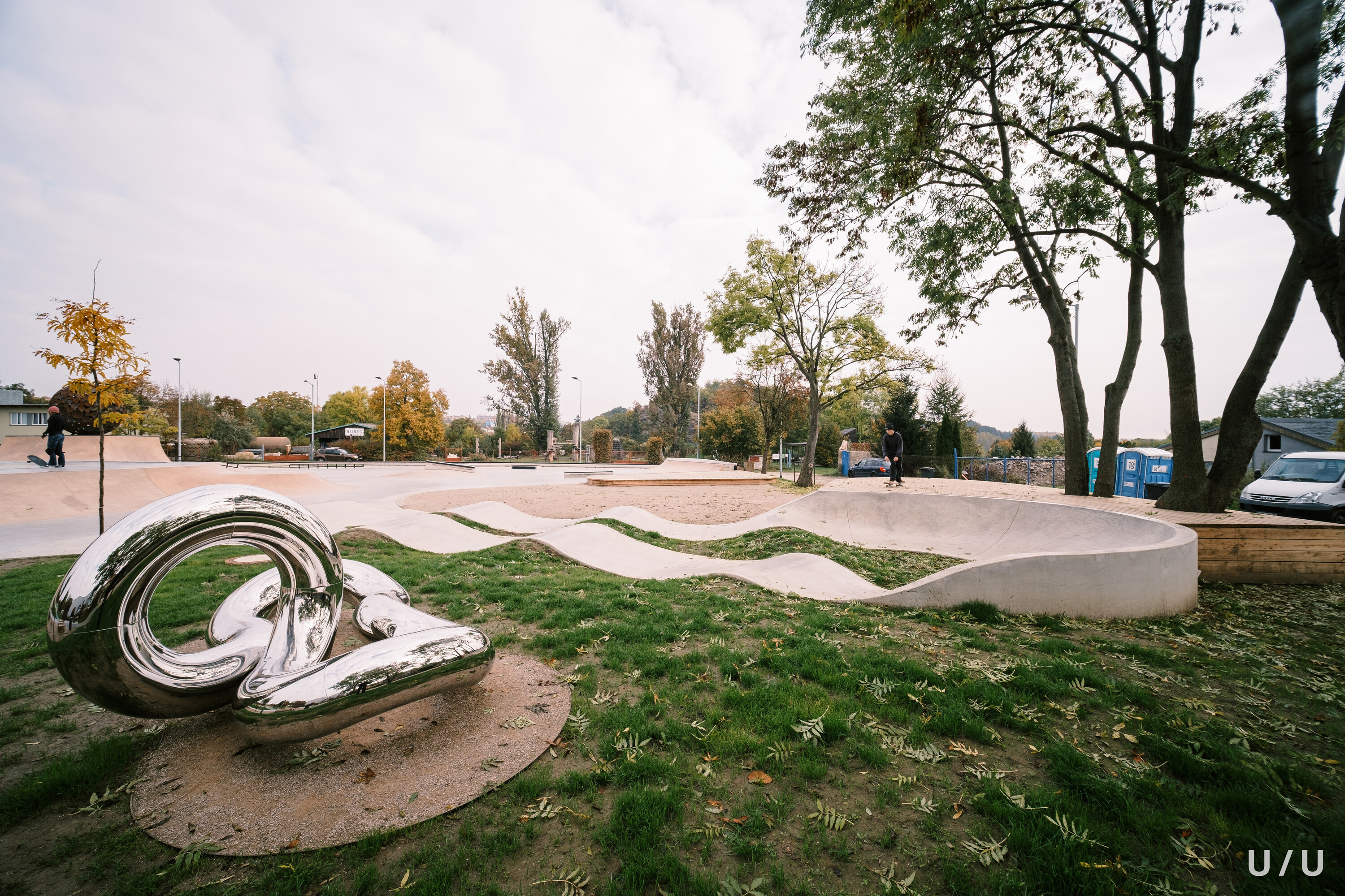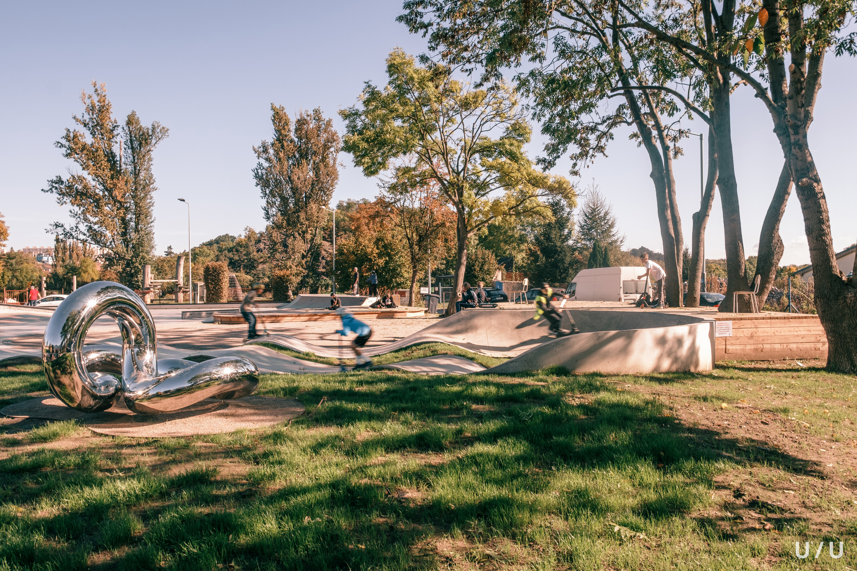Areál zahŕňa galériu, skatepark, parkour zónu, pumptrack, letné kino a drevené pódiá pre kultúrne akcie. Všetko dokopy tvorí živý a fungujúci celok. Mobiliár svojou materialitou rešpektuje sochy, ktoré navrhli mladí českí umelci. “Sochy jsou v přímém dialogu s kompozicí a prvky sportoviště. V prostoru jsme také umístili nové veřejné osvětlení, piknik zónu s grilem, pingpongový stůl, nabíjecí sloupky a pítko, což by mělo být na podobných místech standardem. V blízkosti parkour hřiště je návrh připraven na rozšíření v podobě zázemí pro uživatele areálu.,” vysvetľujú svoj zámer architekti.