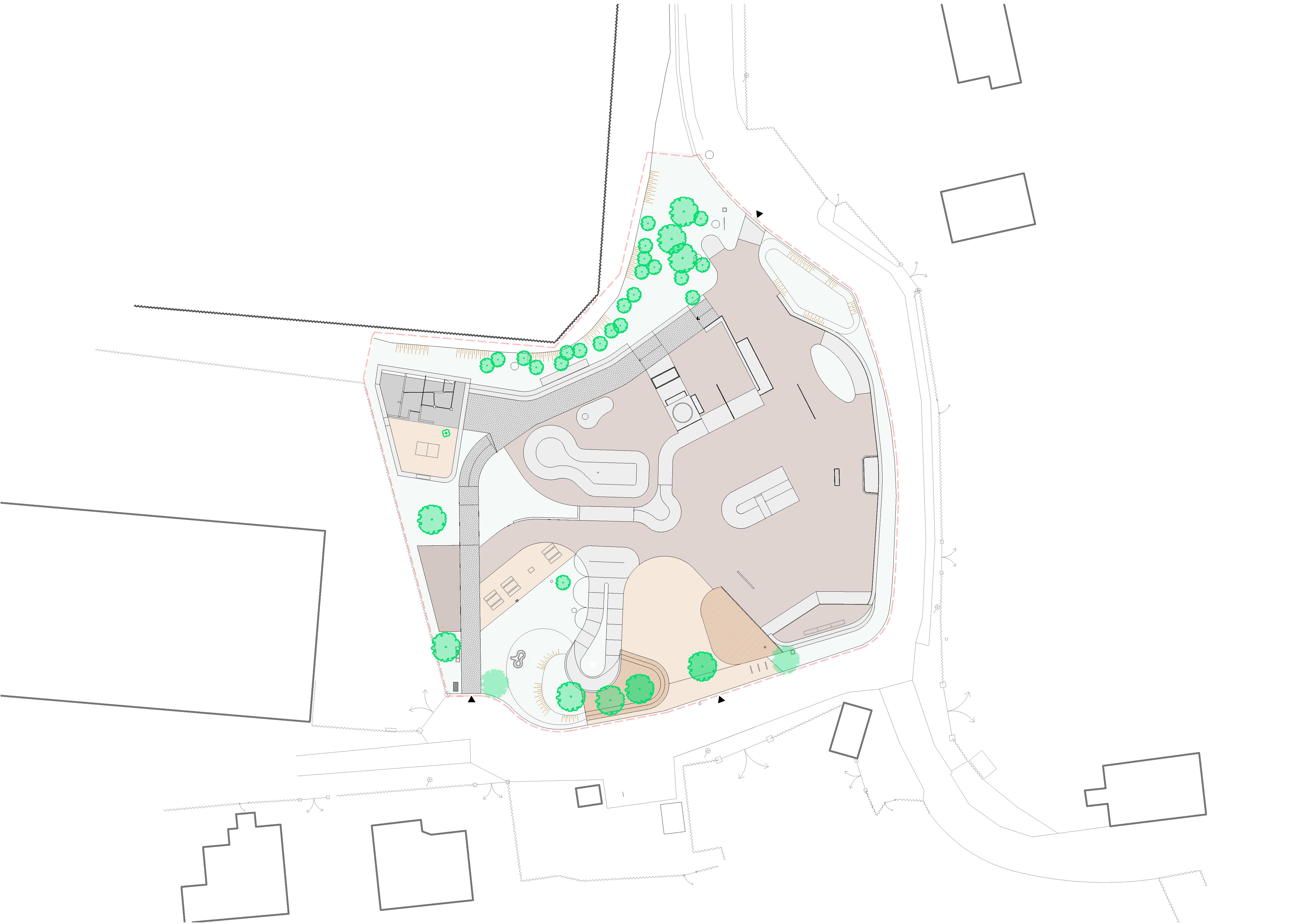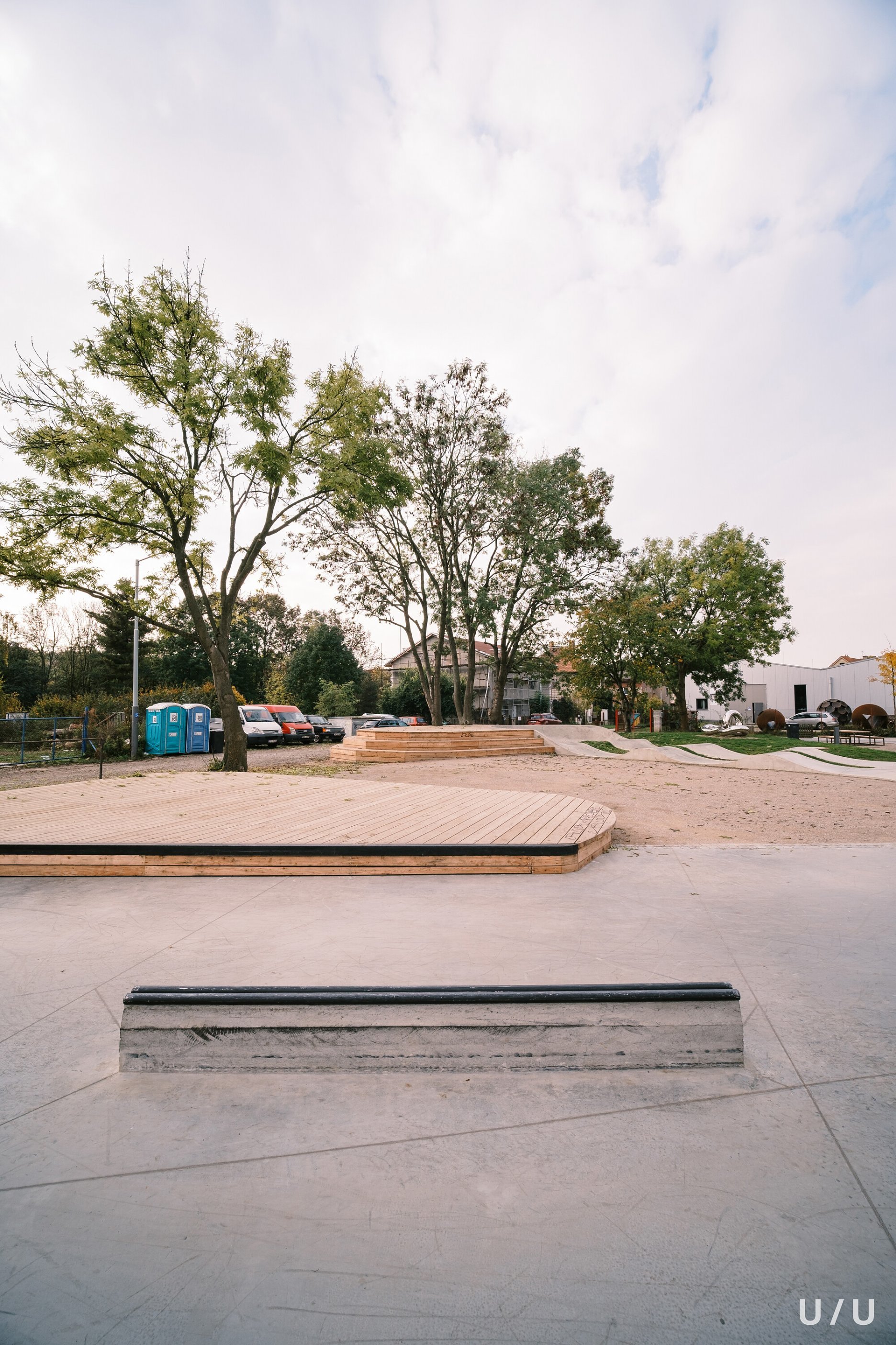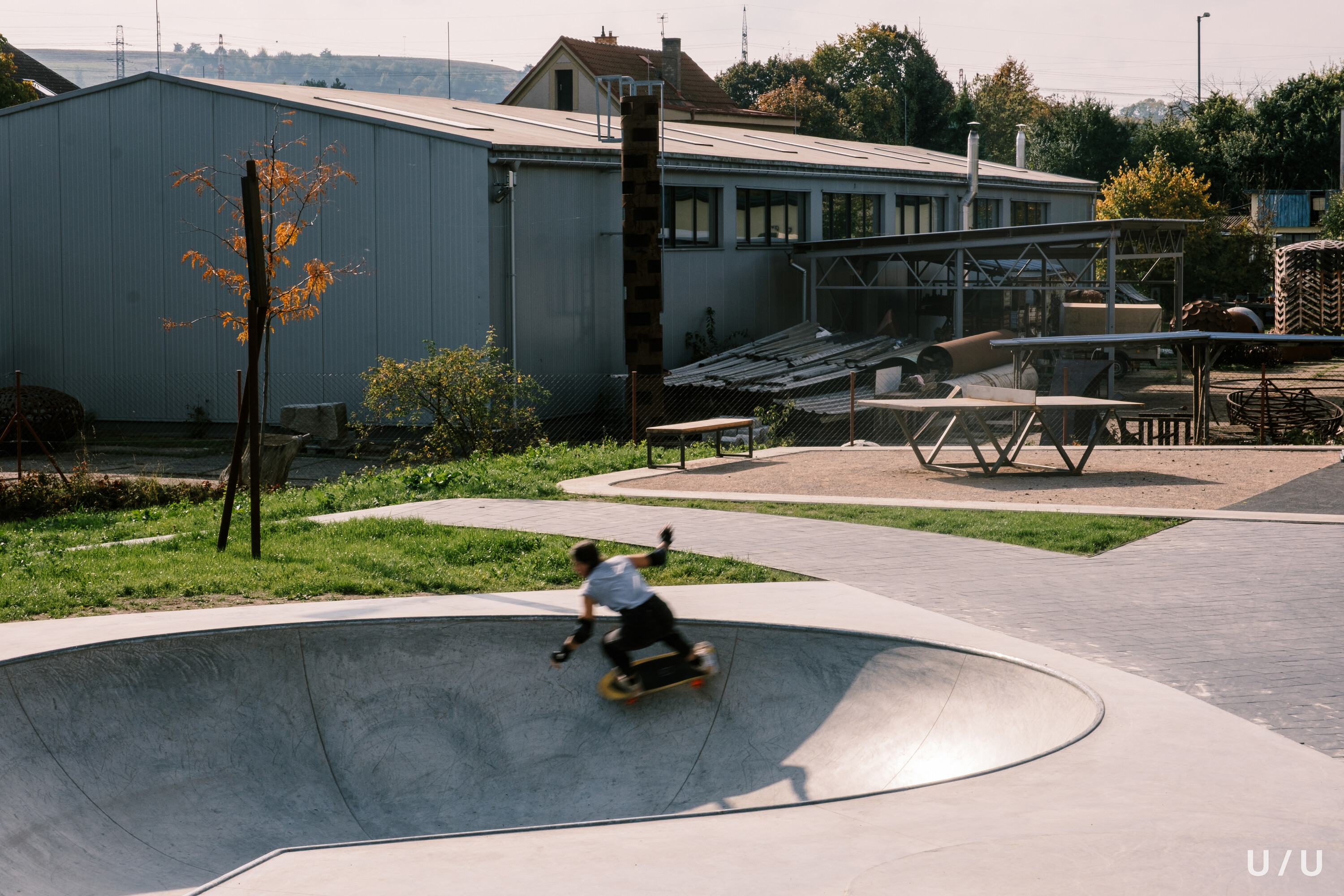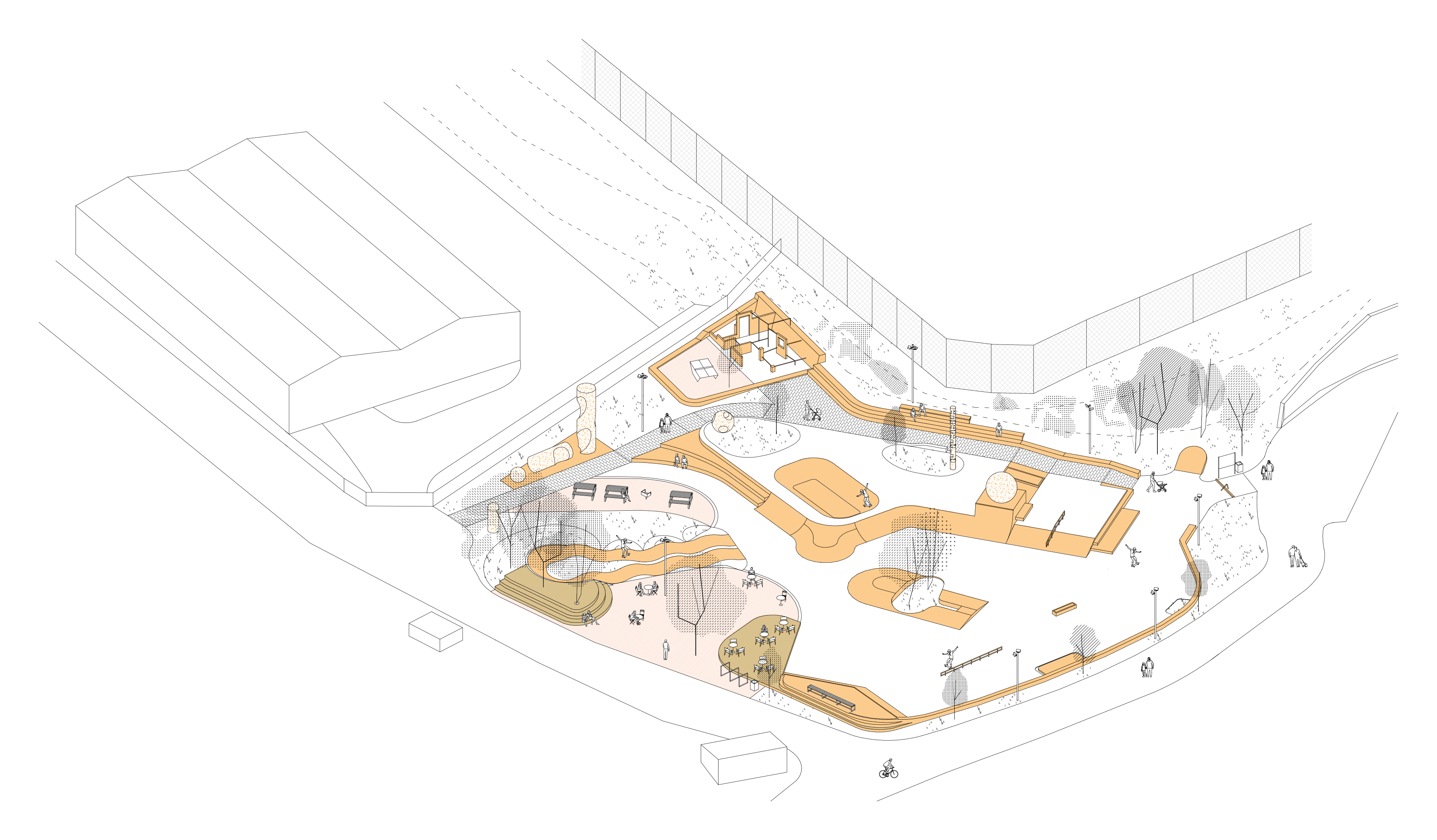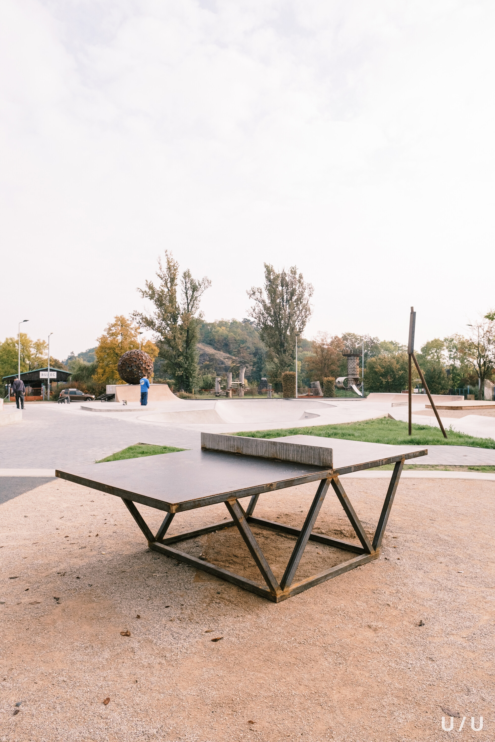 Areál zahŕňa galériu, skatepark, parkour zónu, pumptrack, letné kino a drevené pódiá pre kultúrne akcie. Všetko dokopy tvorí živý a fungujúci celok. Mobiliár svojou materialitou rešpektuje sochy, ktoré navrhli mladí českí umelci. “Sochy jsou v přímém dialogu s kompozicí a prvky sportoviště. V prostoru jsme také umístili nové veřejné osvětlení, piknik zónu s grilem, pingpongový stůl, nabíjecí sloupky a pítko, což by mělo být na podobných místech standardem. V blízkosti parkour hřiště je návrh připraven na rozšíření v podobě zázemí pro uživatele areálu.,” vysvetľujú svoj zámer architekti.