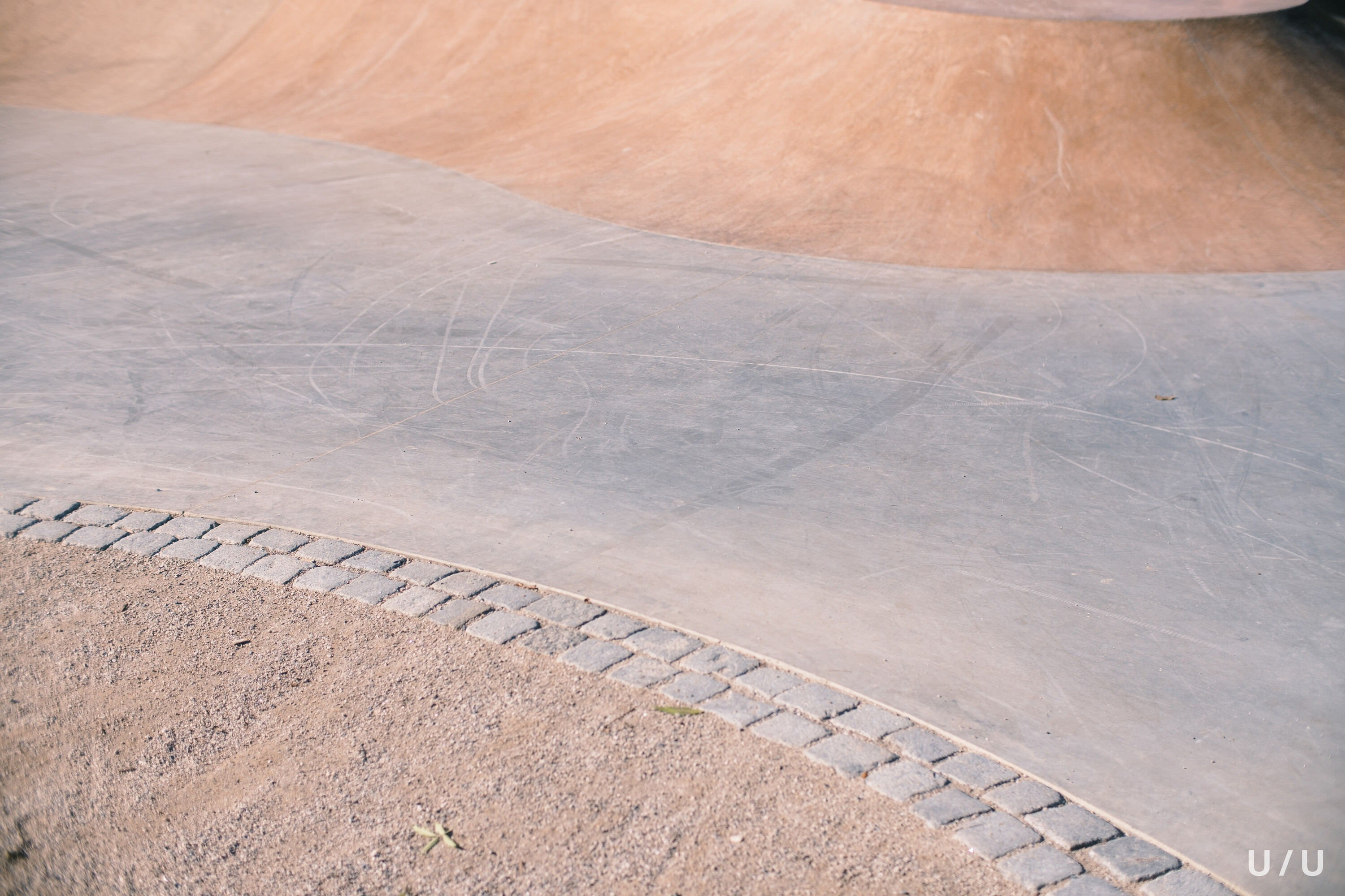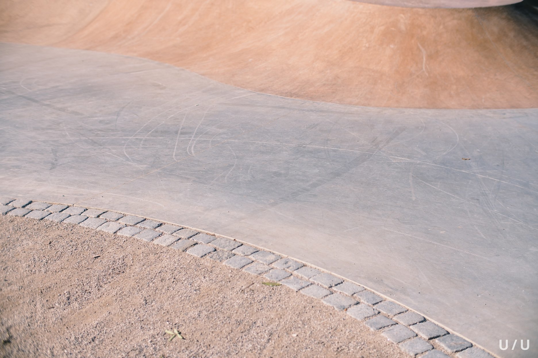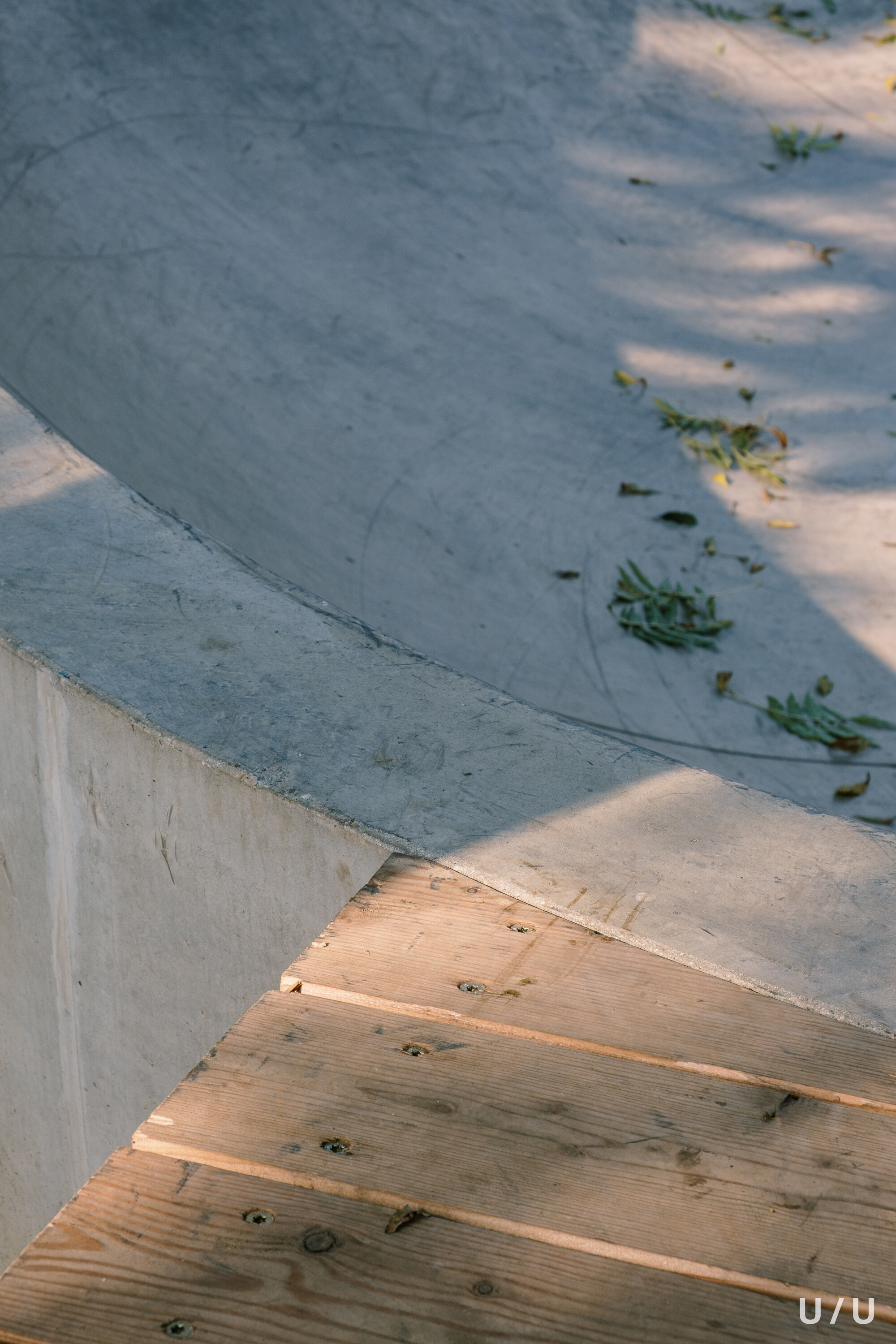 Hlavným konštrukčným materiálom skateparku je hladený betón. Časť betónových plôch akcentuje pigment zemitej farby, ktorý podľa slov autorov podporuje začlenenie stavby do okolia. Diagonálnu komunikáciu odlišuje dláždený povrch. Hrany prekážok a tyčové prvky z farbenej ocele, rovnako ako konštrukcia drevených pobytových zón vyžadujú minimálnu údržbu. Časti areálu pre odpočinok vymedzuje mlatový povrch, ktorý dotvára prírodný charakter územia. Všetka dažďová voda, vedená systémom drenážnych potrubí a prievalov, vsakuje priamo na pozemku.