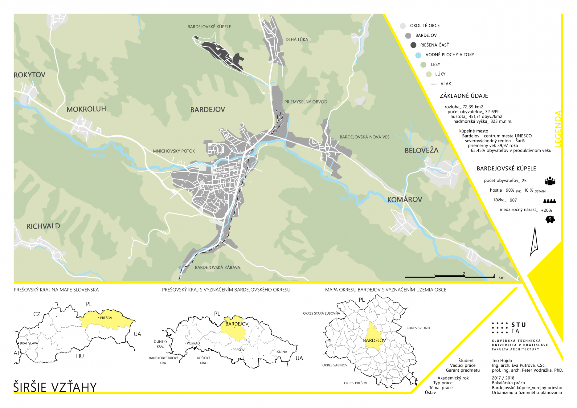 Bardejovské Kúpele sa nachádzajú na severovýchode Slovenska, v Prešovskom kraji blízko hranice s Poľskom. Sú miestnou časťou Bardejova, od ktorého sú vzdialené 5 km. Ležia v 2 km doline pohoria Ondavská vrchovina, obklopené vrchmi so zmiešaným lesom s prevahou ihličnatých stromov. Kúpele sú koncovou zastávkou automobilov (cesta ďalej nevedie). Využívajú sa hlavne ako rekreačná oblasť, domácich obyvateľov tu žije veľmi málo (okolo 50). Do služieb ľudia dochádzajú z blízkeho okolia. Na území pred kúpeľmi je plánovaná a čiastočne rozbehnutá individuálna bytová výstavba. Veľké percento objektov a verejných priestorov patrí súkromnému investorovi, čo môže byť dôvodom ich zanedbania. Návrh v širšej mierke rieši problémy miesta, avšak detailnejšie sa zameriava na ústredný priestor kúpeľov pri kolonáde.