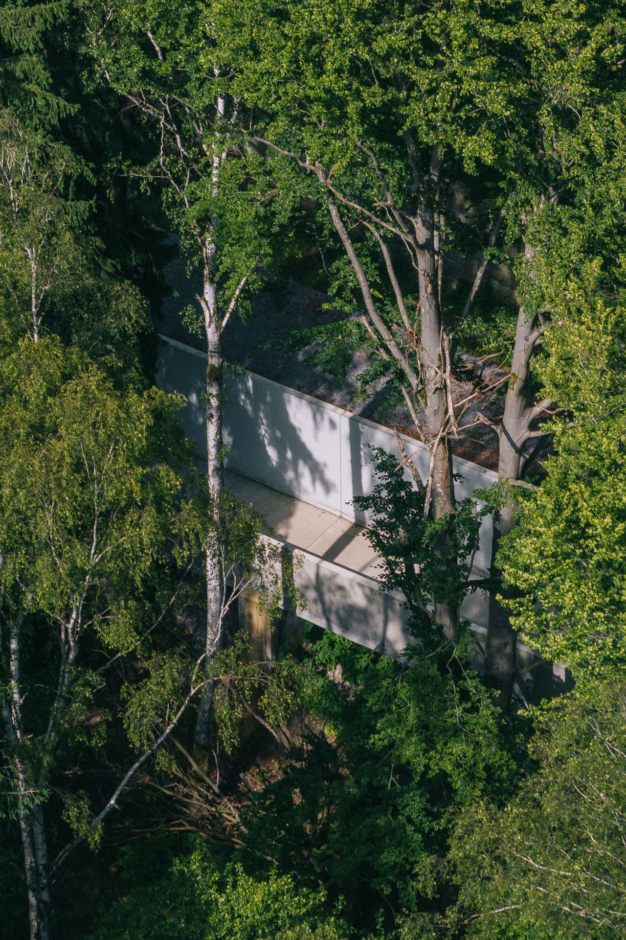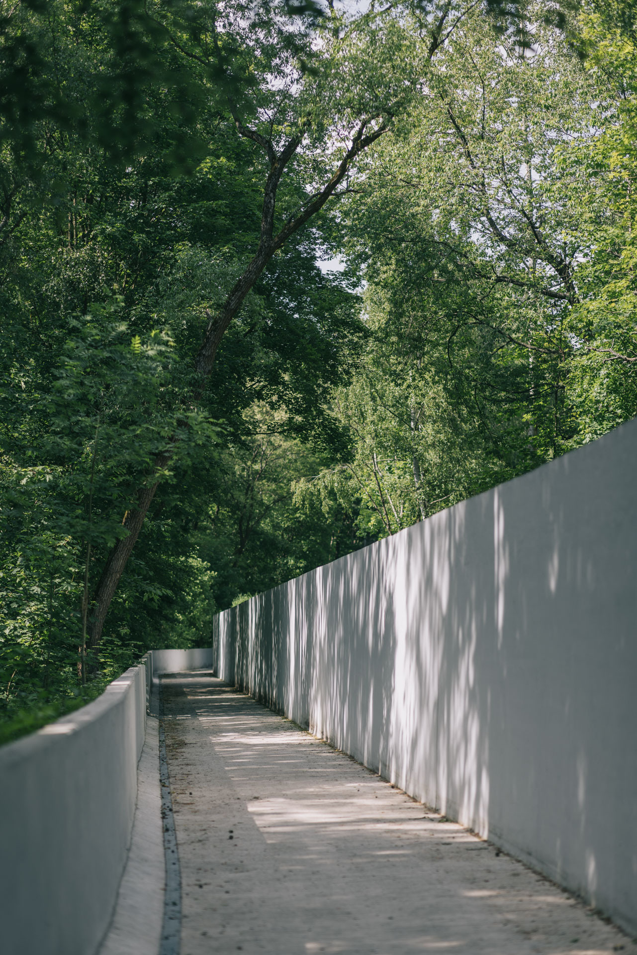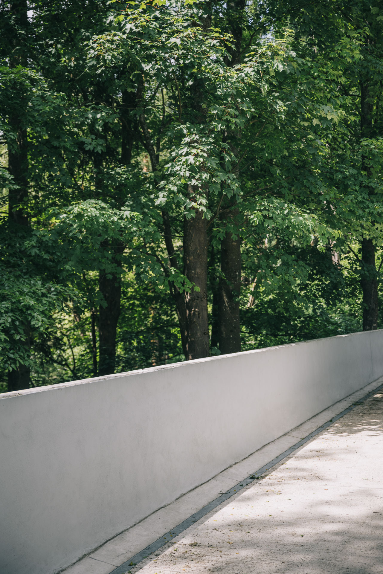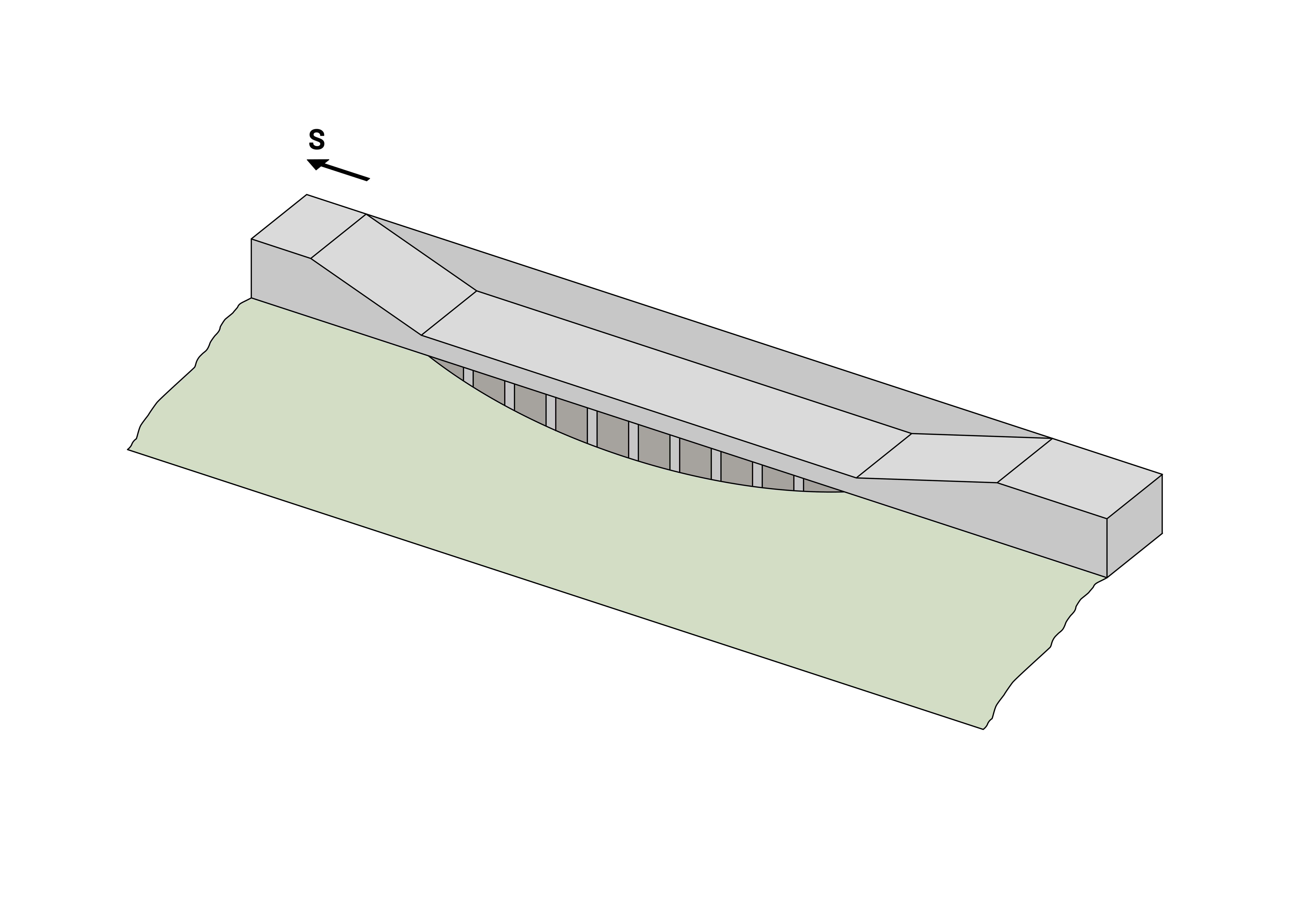 Betónová konštrukcia nie je maskovaná; jej hmota a tvar stále dominujú pohľadom. Miestami Hrúbka stien sa pohybuje medzi 20 – 30 cm.
