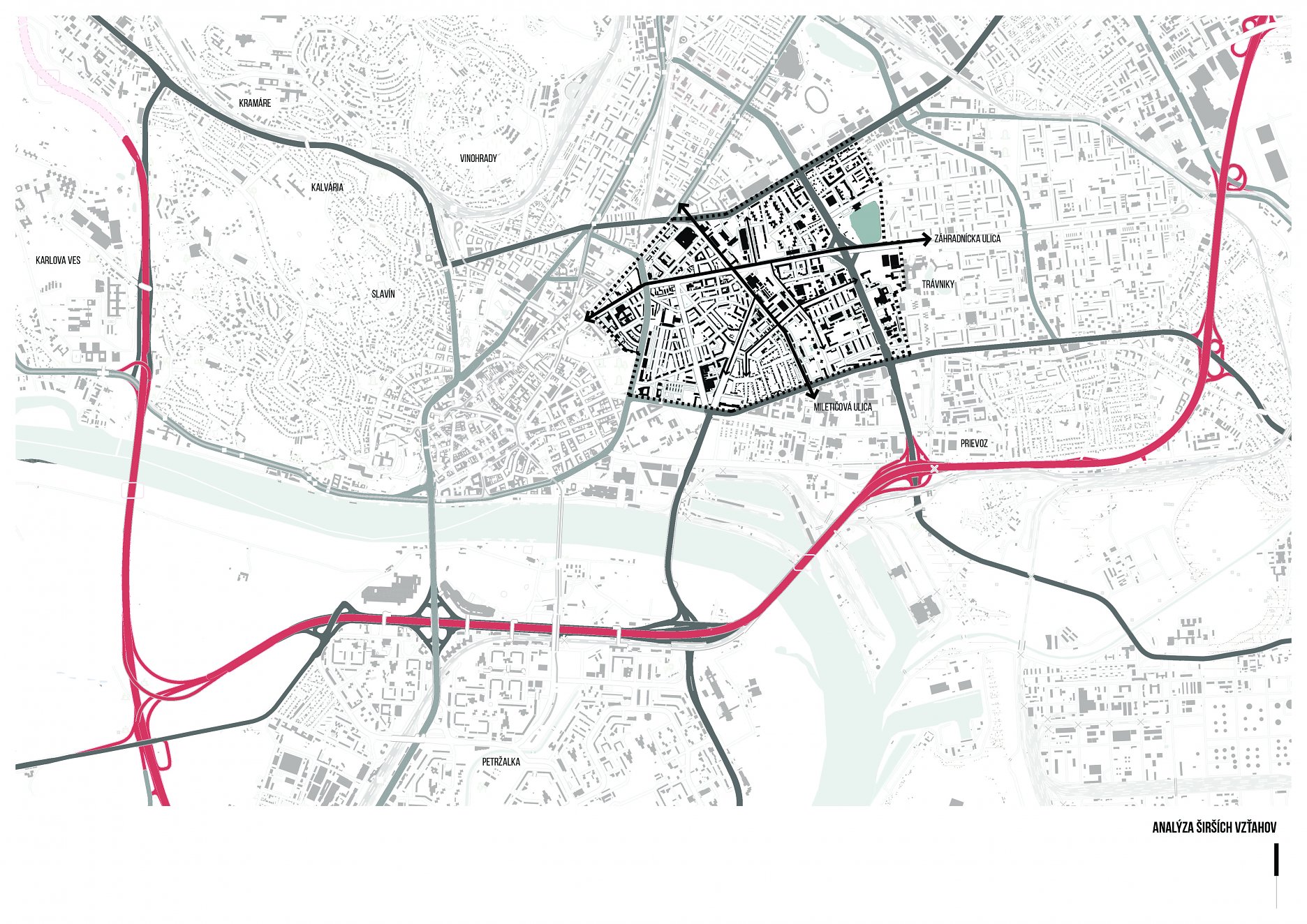 Riešené územie sa nachádza v mestskej časti Bratislava – Ružinov. Záhradnícku ulicu dlhodobo vnímame ako hlavný dopravný ťah, ktorý spája Staré mesto s prevažne obytnou zástavbou mestskej časti Ružinov. Ide o veľmi frekventovanú lokalitu, zaťaženú nielen automobilovou dopravou, ale aj peším ťahom. Hlavným bodom záujmu pri návrhu sa stáva kríženie Záhradníckej a Miletičovej ulice. Na križovatke týchto dvoch ulíc sa nachádza rozsiahly verejný priestor, ktorý je obklopený kostolom, mestským parkom, trhoviskom, a bohatou občianskou vybavenosťou. V súčasnosti je však kvalita verejných priestorov nevyhovujúca. Verejné priestory si žiadajú renováciu resp. revitalizáciu, nové stvárnenie, efektívnejšie funkčné využitie a v neposlednom rade zásadné riešenie problémov so statickou dopravou. Ďalším hlavným bodom záujmu sa stalo kríženie Záhradníckej a Bajkalskej ulice, kde sa nachádza silný dopravný uzol, ktorý istým spôsobom pôsobí ako bariéra medzi Štrkoveckým jazerom a jeho okolím. V tejto lokalite bolo nutné dotvoriť nedopovedanú urbanistickú štruktúru a vyriešiť priame prepojenie jednotlivých častí križovatky.