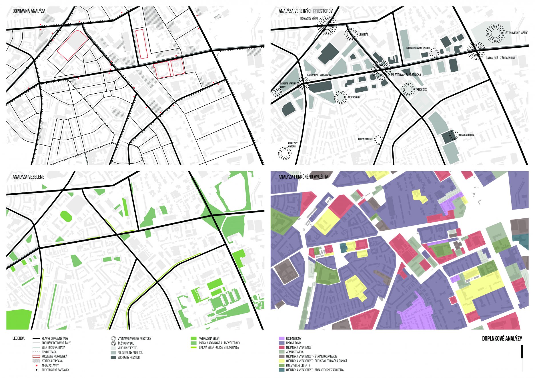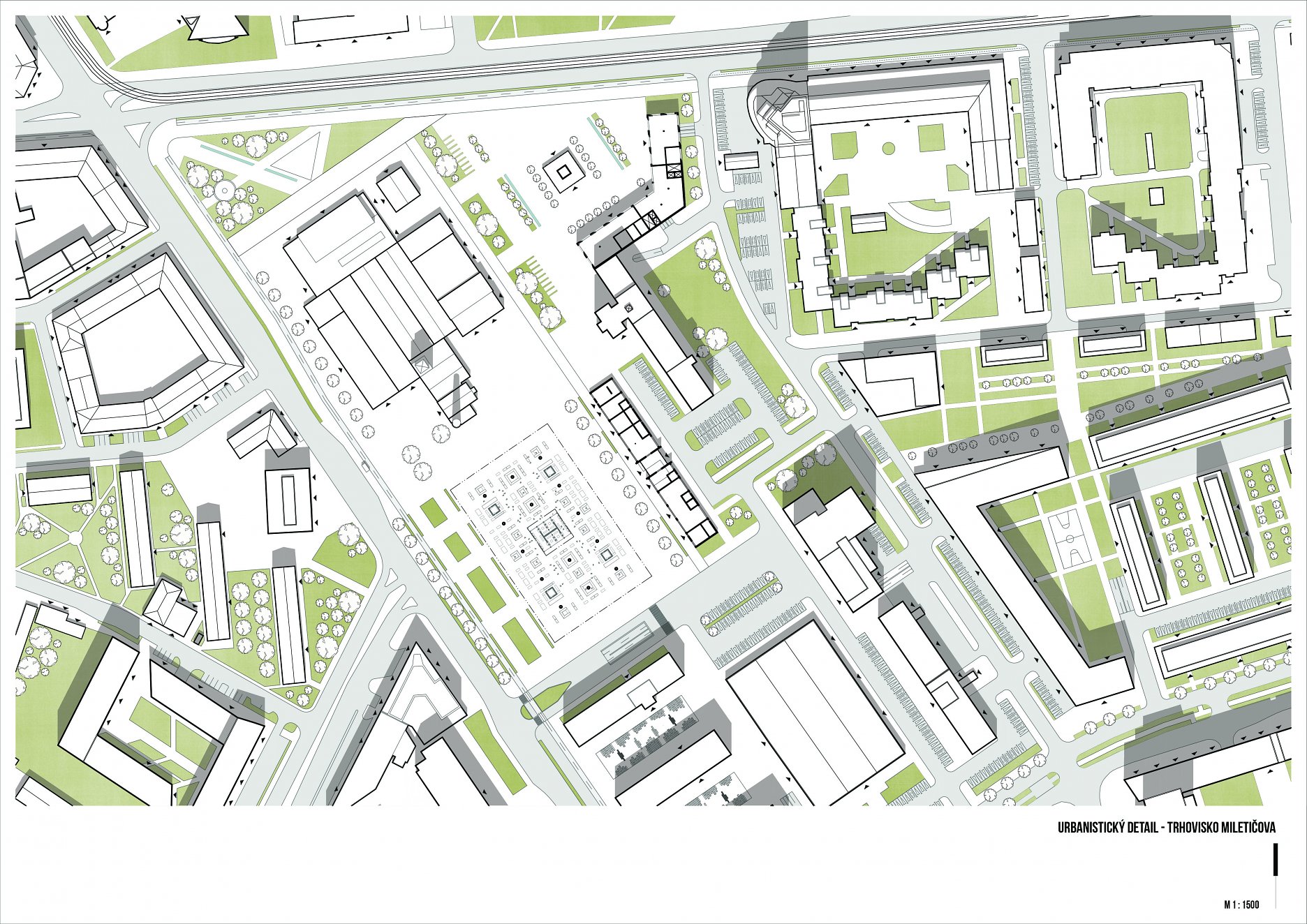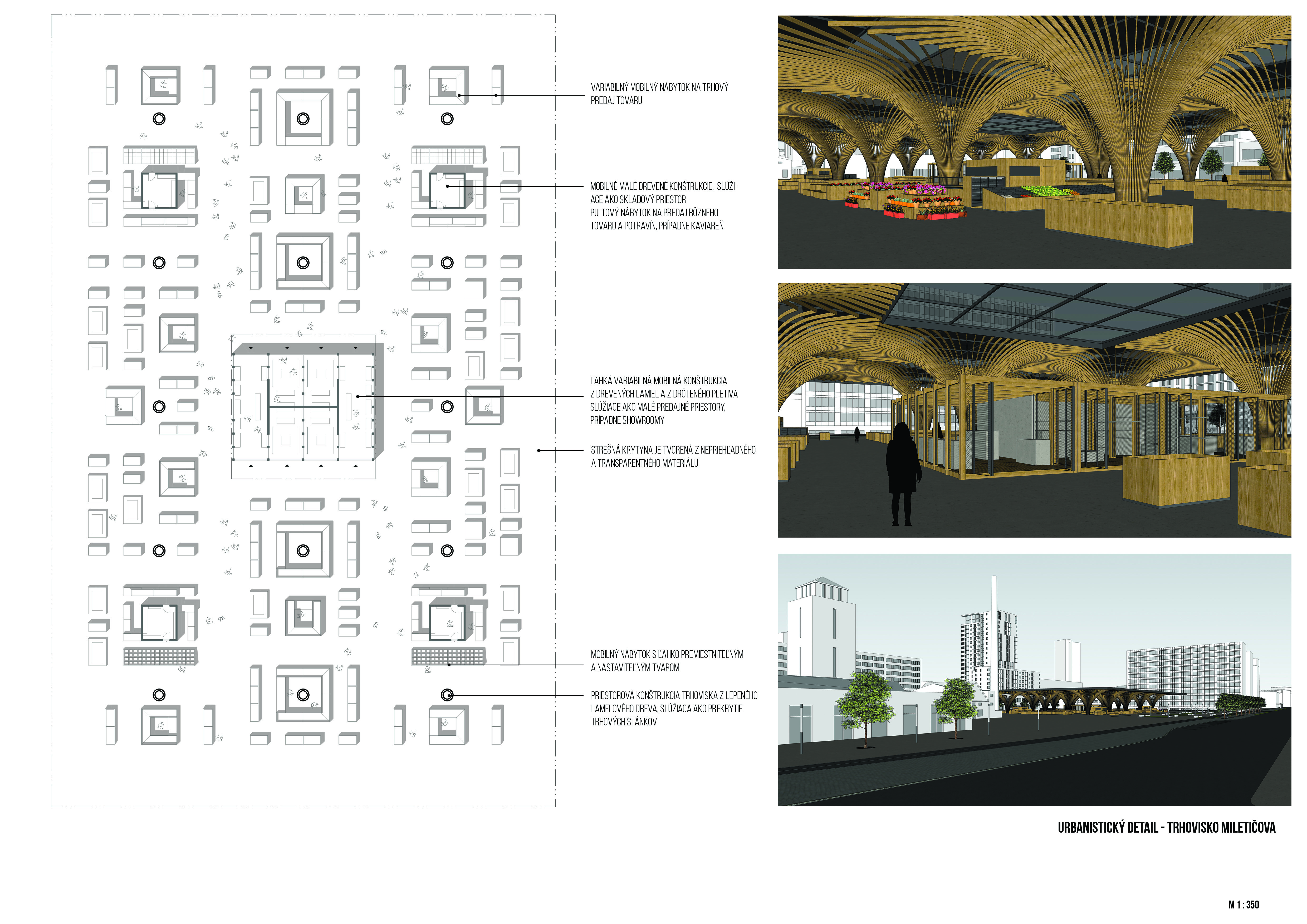 Trhovisko Miletičova - je najväčšie otvorené trhovisko v rámci hlavného mesta a taktiež v rámci Slovenska. V priebehu týždňa a najmä počas víkendov je trhovisko hlavným bodom záujmu obyvateľov nielen Bratislavy ale aj priľahlých miest. Má nepopierateľný ekonomický ako aj kultúrny význam. Má potenciál na rozvoj, možno ho zväčšiť a pripojiť k nemu aj priľahlý park. Trhovisko je v súčasnosti miestom zastaralých stánkov a prístreškov bez formy a zásahu zhora (architekt), bez zelene, obkolesené nadzemným parkoviskom a nekoncepčnými budovami. V návrhu sme však mali možnosť tento stav zmeniť, a tak sme vytvorili trhovisko z prírodných materiálov, rozsiahle, koncepčne usporiadané a prestrešené tak, aby bolo prístupné za každého počasia. Hlavným cieľom však bolo zachovanie charakteru trhoviska tak, ako ho každý z nás pozná. Taktiež sme vyriešili problém so statickou dopravou, ktorú sme situovali do podzemného parkoviska, aby každý návštevník mal možnosť zaparkovať v tesnej blízkosti bez nutnosti hľadanie voľného parkovacieho miesta.