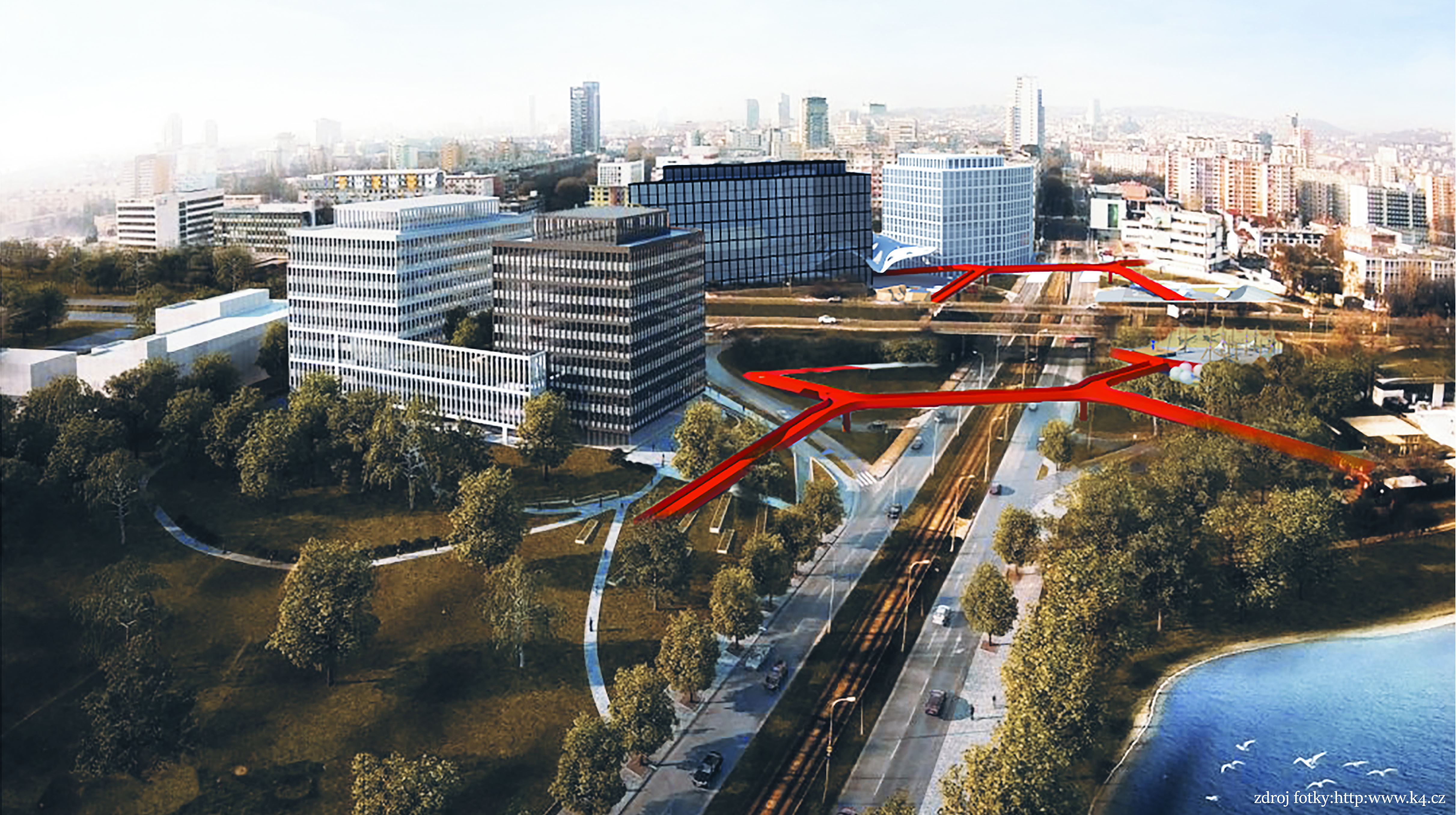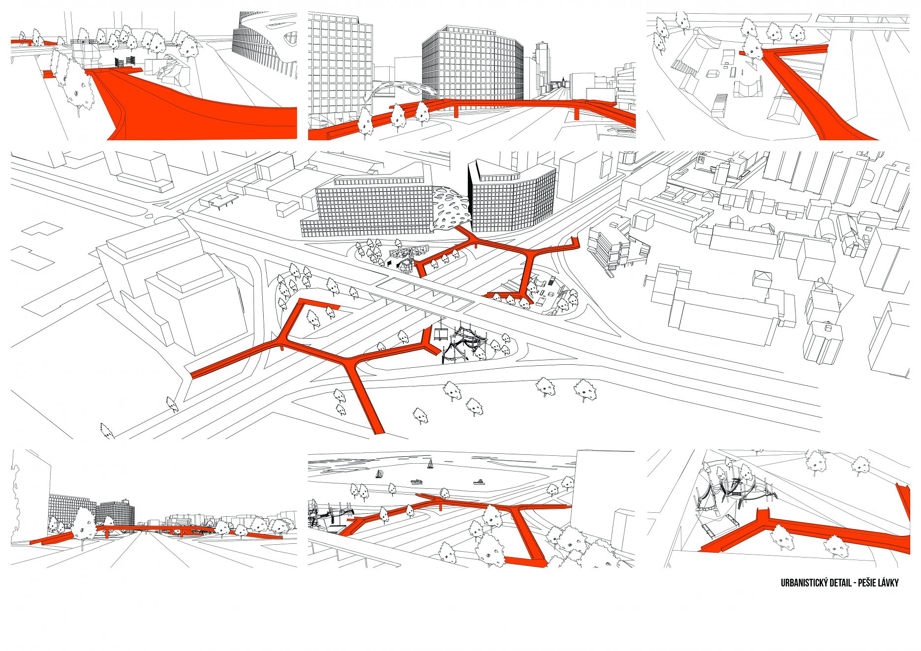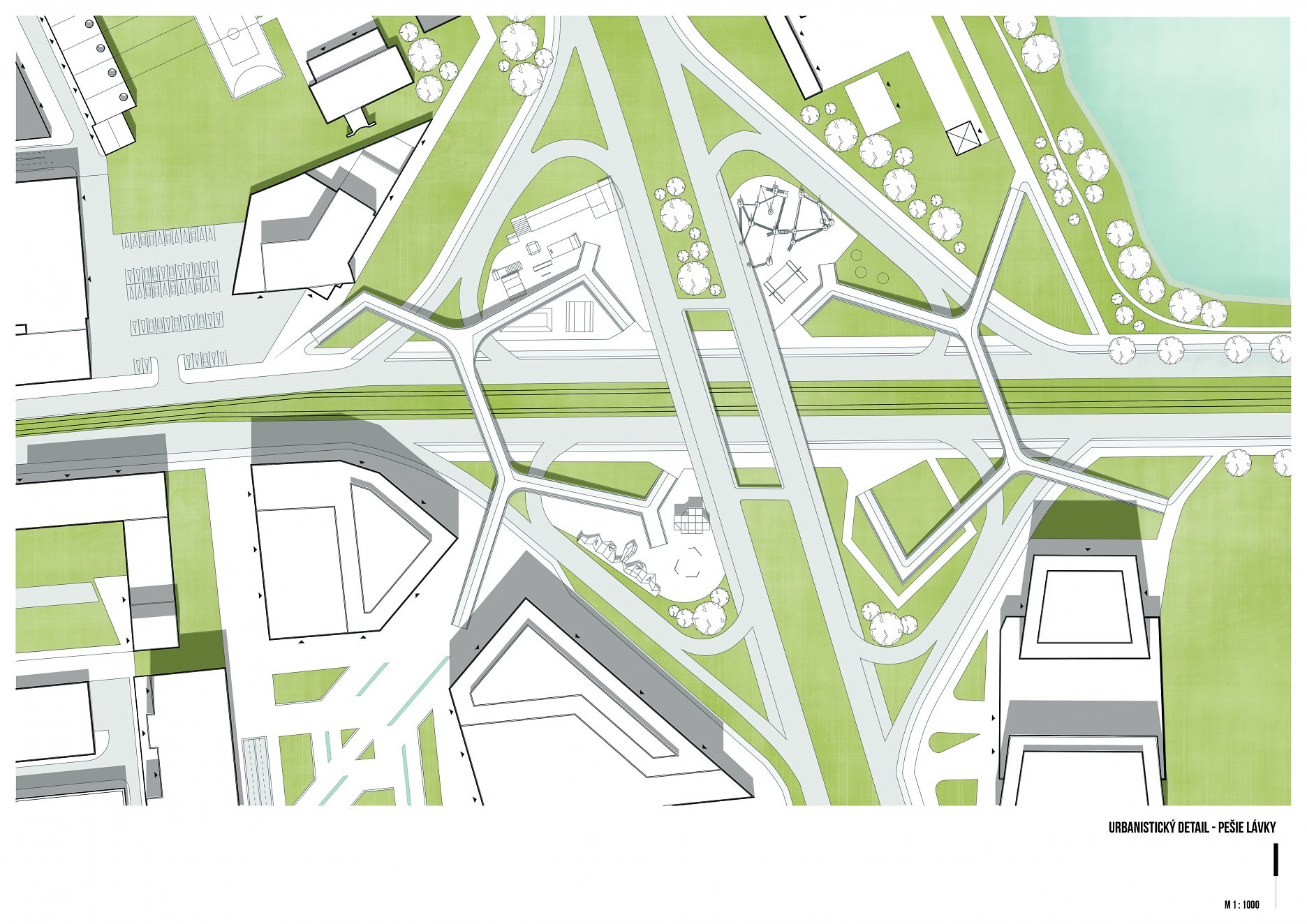 V ďalšom kroku sme sa zamerali na lokalitu kríženia Záhradníckej a Bajkalskej ulice. Pri súčasnom trende nárastu počtu automobilov v mestách sa táto križovatka stáva doslova nebezpečným miestom, a to hlavne počas dopravnej špičky. Preto sa v návrhu zameriavame na fakt, ako odkloniť chodcov od hlavných dopravných tepien. Cieľom je bezpečnosť chodcov pri prechode spomínanou križovatkou. V návrhu sme vytvorili pešie lávky, ktoré navzájom prepájajú všetky strany križovatky. Súčasťou peších lávok budú aj cyklotrasy. Atraktívnosť lokality zvyšujeme najmä oddychovými, športovými a kultúrnymi zónami pre deti a dospelých v rámci zelených ostrovčekov križovatky. Týmto návrhom priamo prepájame jednotlivé časti strán, ktoré úmerne nadväzujú na rekreačnú zónu Štrkoveckého jazera. Prvá zóna slúži ako oddychová, s exteriérovou výstavou. Cez lávku je možné prejsť do ďalšej zóny, kde je vytvorené lanové centrum. Na opačnej strane križovatky je situovaný skate park a lezecké steny.