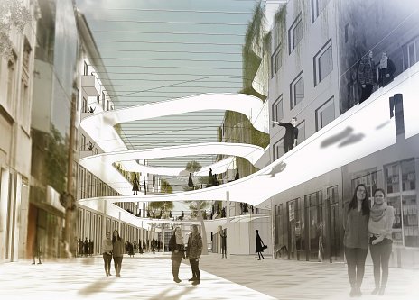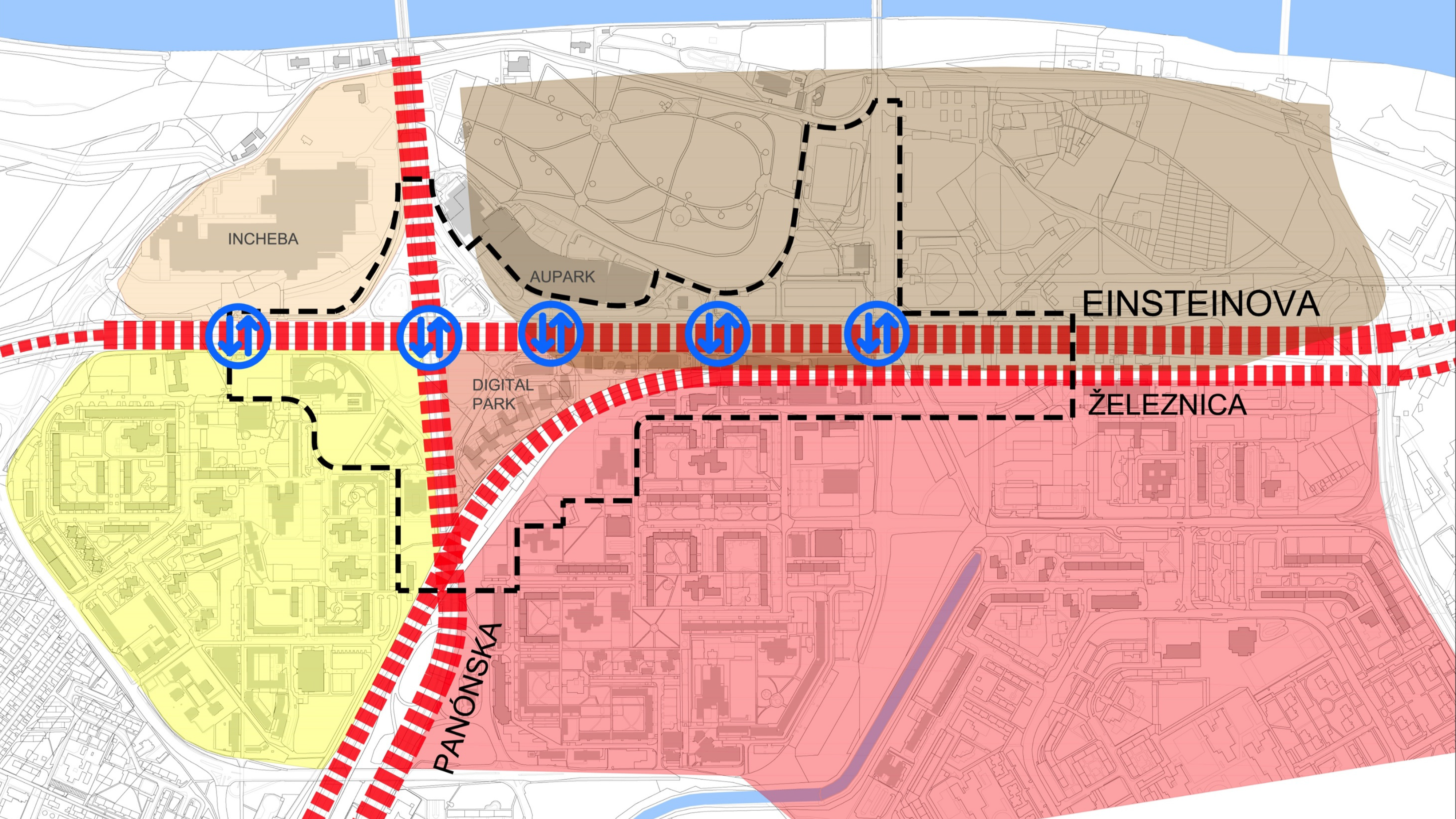 Vstupnou časťou pre "Novú Einsteinovu" by sa mal stať priestor okolo zjazdu z Mosta SNP. Na druhej strane by malo premostenie siahať po koniec Auparku. Centrálne námestie by malo stáť na mieste parkoviska pred auparkom.