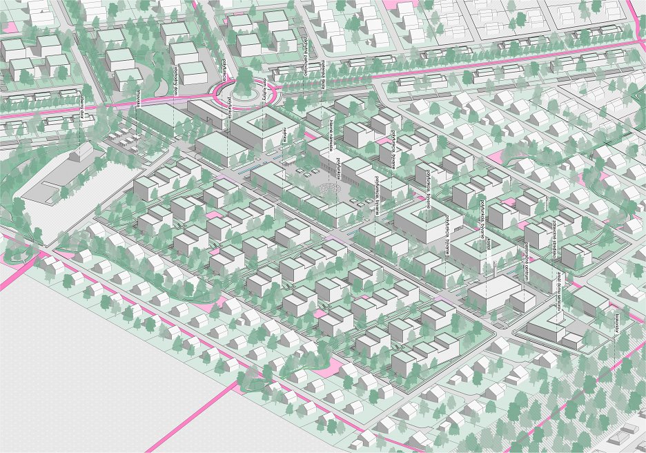 V tomto území sú navrhnuté obytné domy s vybavenosťou, ktoré svojou hmotou a podlažnosťou (3 n.p. a jedno ustúpené podlažie) bude definovať mierku a výškovú hladinu budúceho polyfunkčného centra. Objekty popri hlavnej ulici sú navrhnuté zároveň ako súčasť centrálneho námestia.