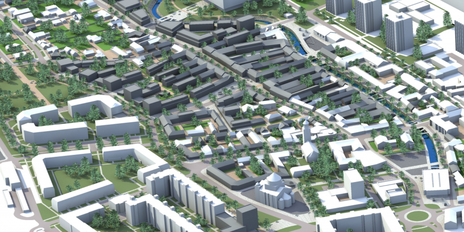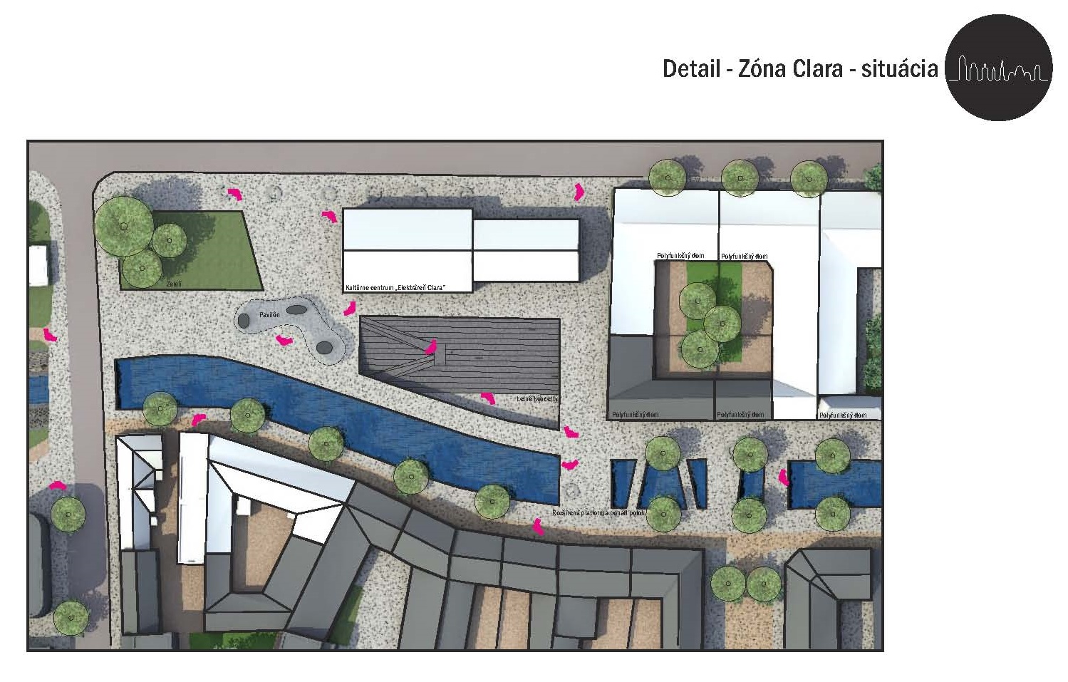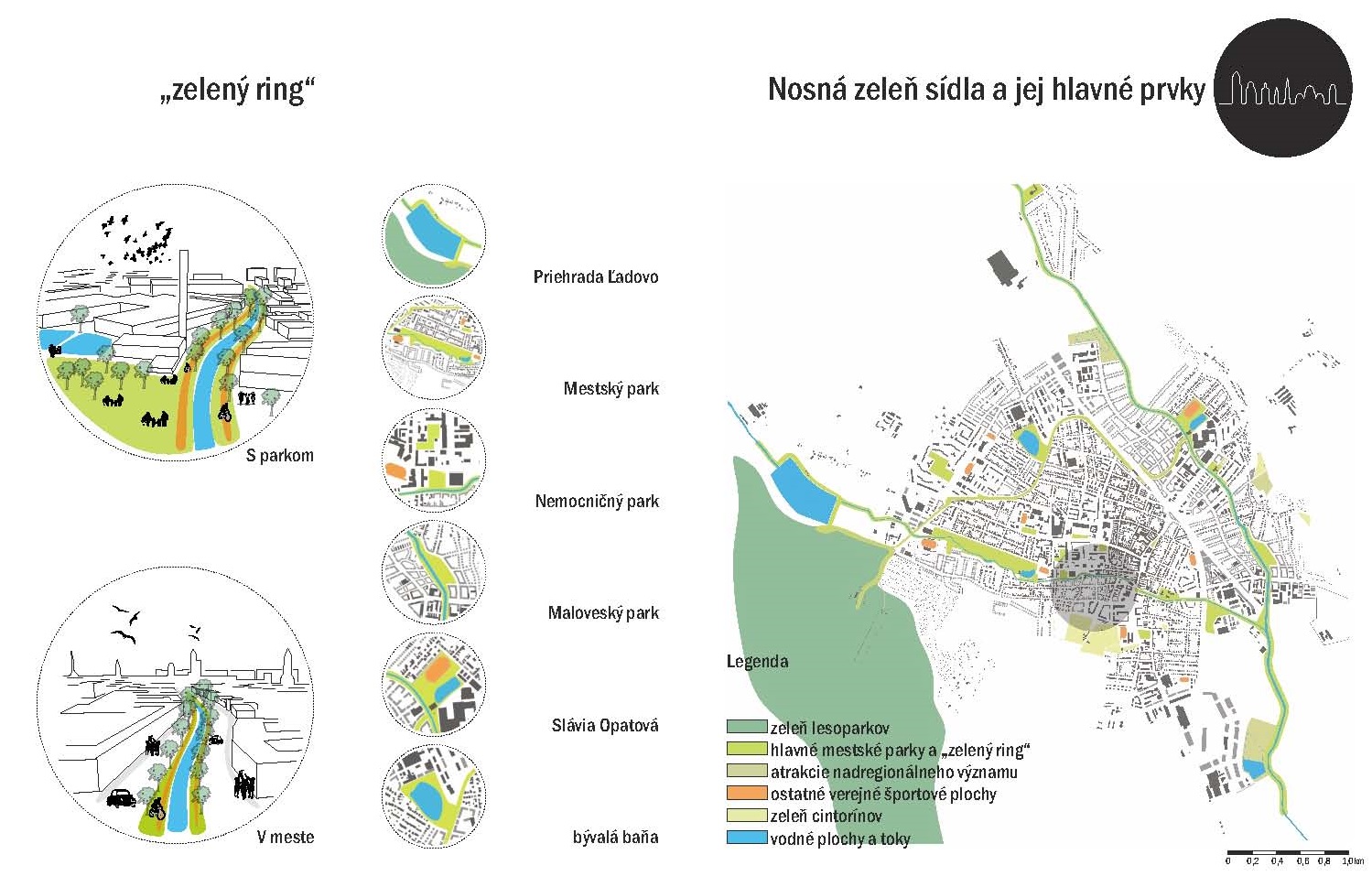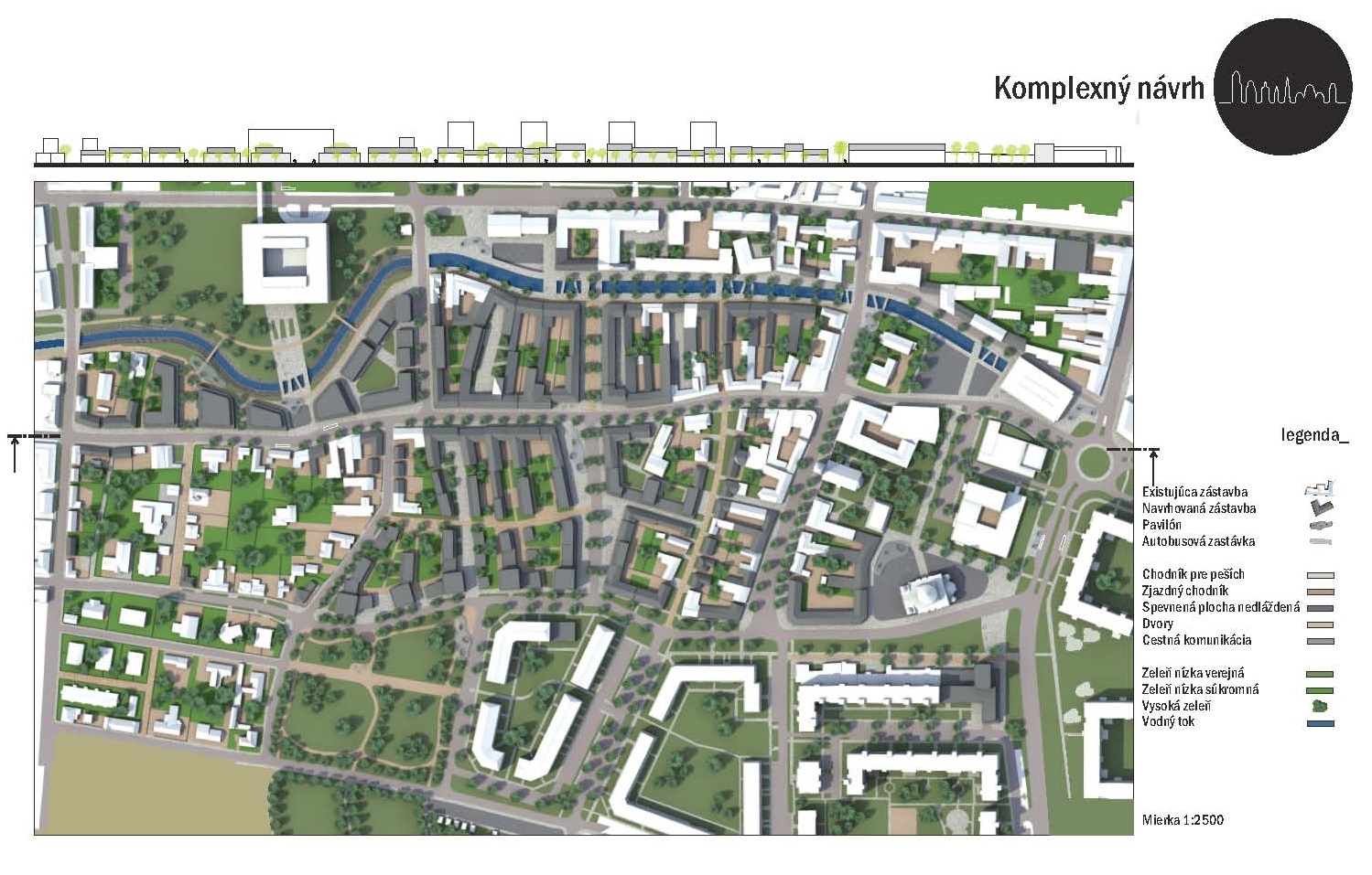 Spojovacím motívom územia je vodný tok - Tuhársky potok, ktorý bude tvoriť prirodzenú hlavnú kompozicnú os územia spolu s Ulicou Husovou. Vodný tok bude poprepájaný so zelenou, južnou castou riešeného územia rôznymi prechodmi, alejami a koridormi.