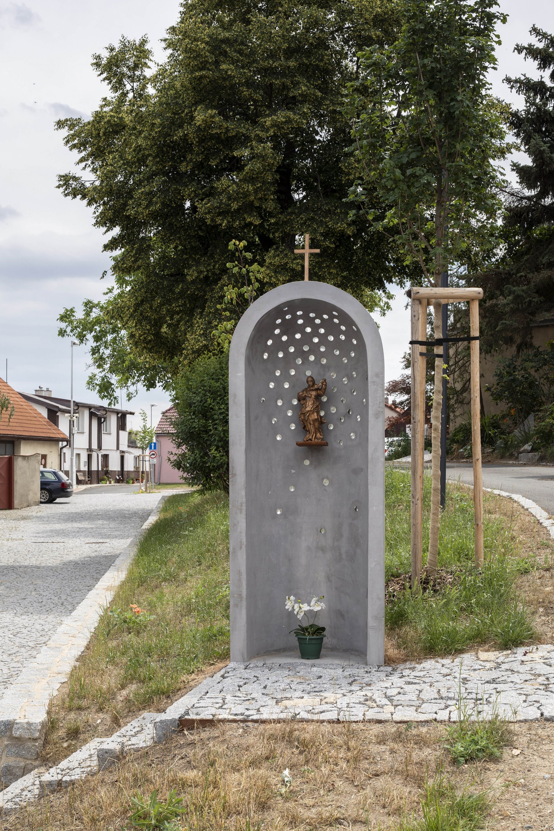 Měkce tvarované prvky drobné architektury - kaplička sv. Ludmily a studánka - jsou z broušeného betonu doplněného černým kovem a bronzovými plastikami. Dávají svébytný charakter dvěma hlavním ohniskům lokality. Výškový rozdíl podél ulice Na Hůrce je vyrovnán kamennou opěrnou zídkou a zatravněným svahem.