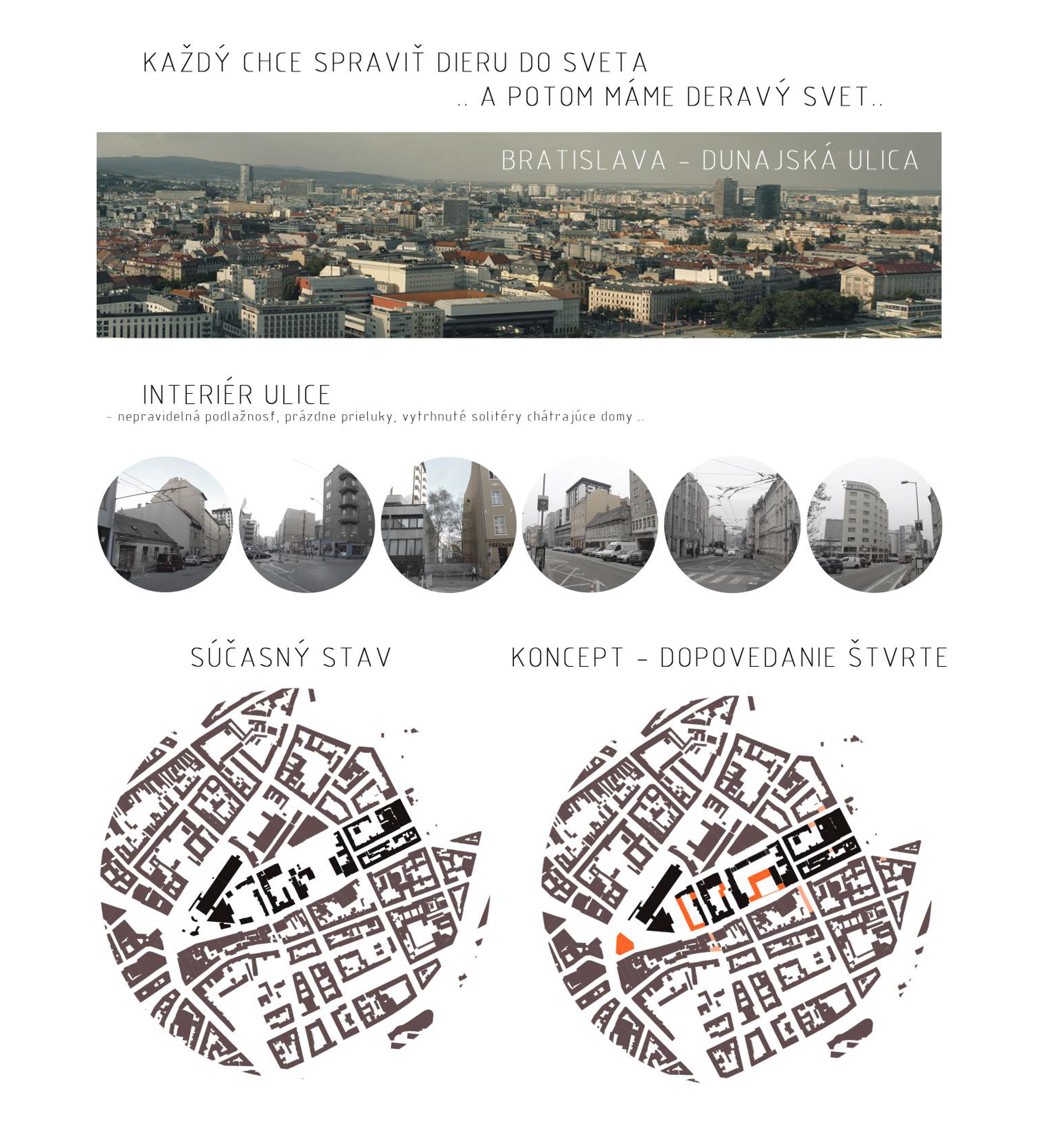 Koncept sa začína rozvíjať od myšlienky harmónie. Vizuálna harmónia budov je základ každého krásneho mesta či vidieckeho osídlenia. O Bratislave nemožno hovoriť ako o krásnom meste, pokiaľ vidieť za hranice stredovekých hradieb. Posledné budovy ktoré držia tento vizuálny kontakt s historickým jadrom sú Bellušove Družstevné domy a Matušíkov Hotel Kyjev. Napriek drastickým zásahom do štruktúry a monumentálnejším formám, dokázali nadviazať dobrý kontakt so starým mestom. To, čo nasleduje za spomínaným územím, stráca atmosféru harmónie. Konkrétny príklad je riešené územie Dunajskej ulice. Územie nemá jednotný charakter a Dunajskú právom prezývajú „štrbavou ulicou“. Pozorujeme nedostatky ako prázdne prieluky, nerovnomerná podlažnosť (strieda sa dvojpodlažná budova so sedempodlažnou), chátrajúce budovy, nefunkčný verejný park, zahltenie statickou dopravou, farebne či hmotovo budovy nevytvárajú medzi sebou príjemné prostredie.. Problémy, ktoré môžeme pozorovať, vo väčšej či menšej miere, po celej Bratislave.